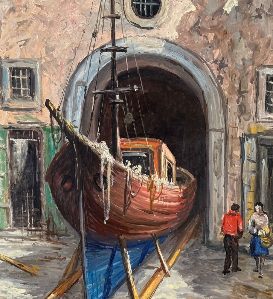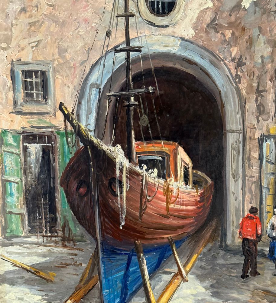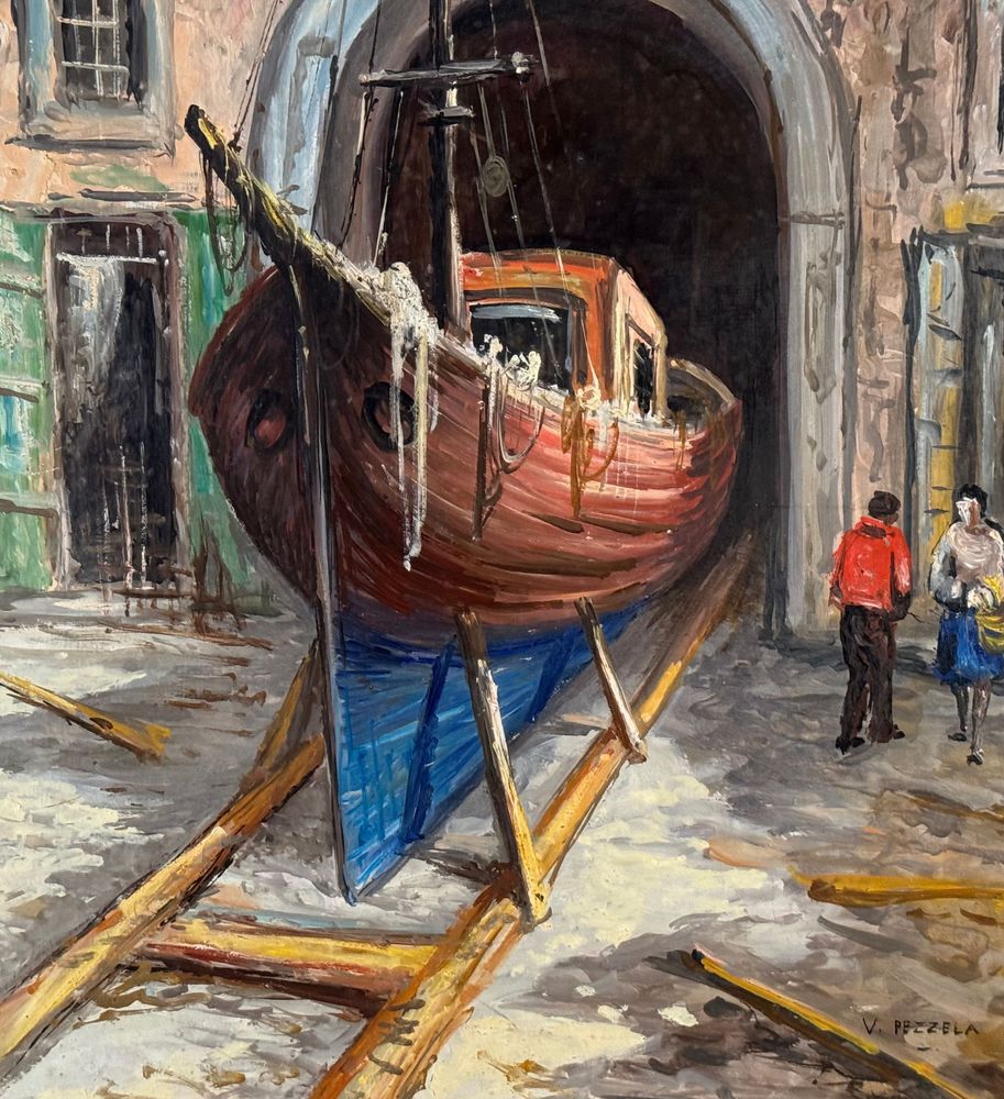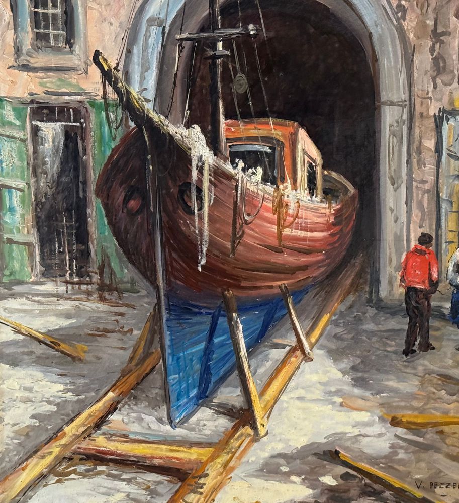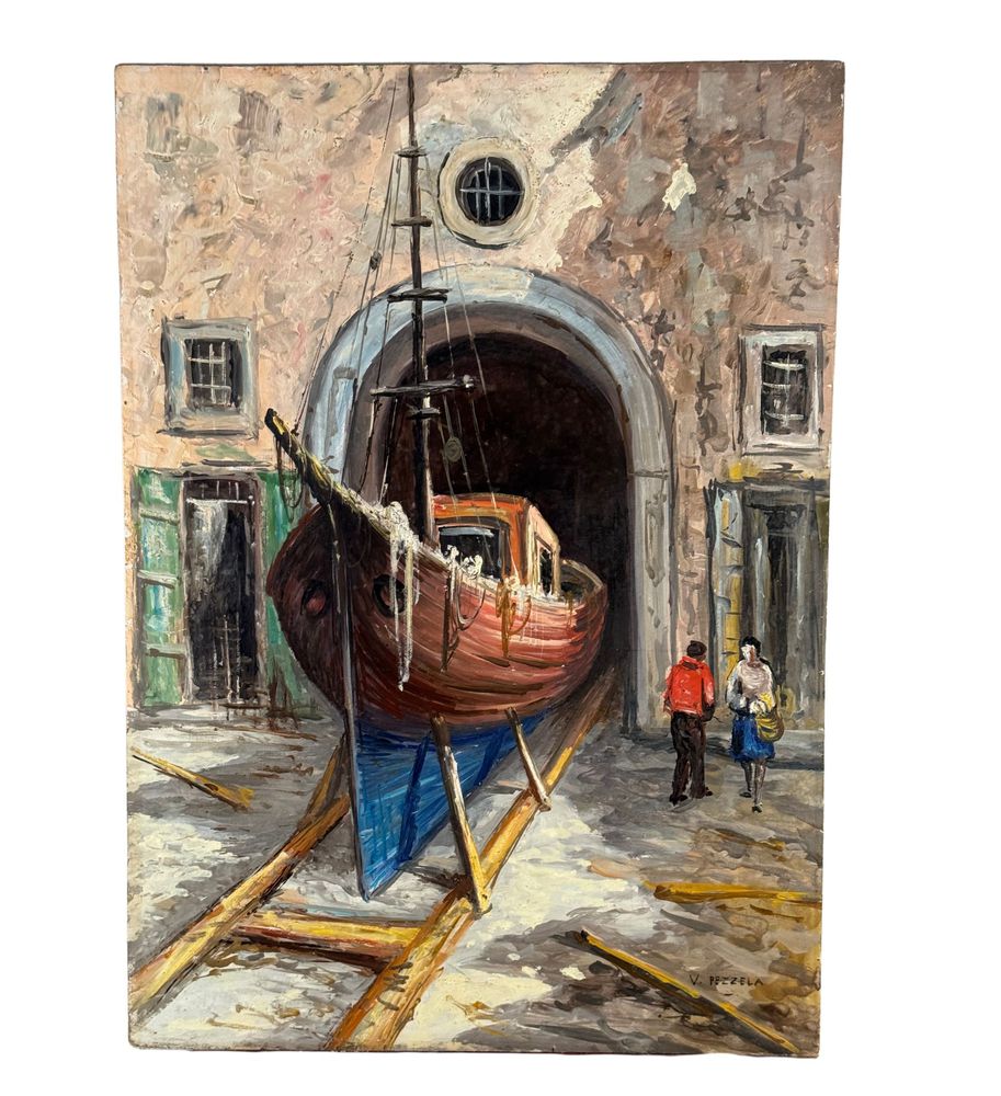 Dipinto olio su pannello, periodo XX secolo, scuola Italiana raffigurante Cantiere navale. Dimensioni: 50x70 cm. Firmato in basso a destra V. Pezzella. Opera in buone condizioni.
