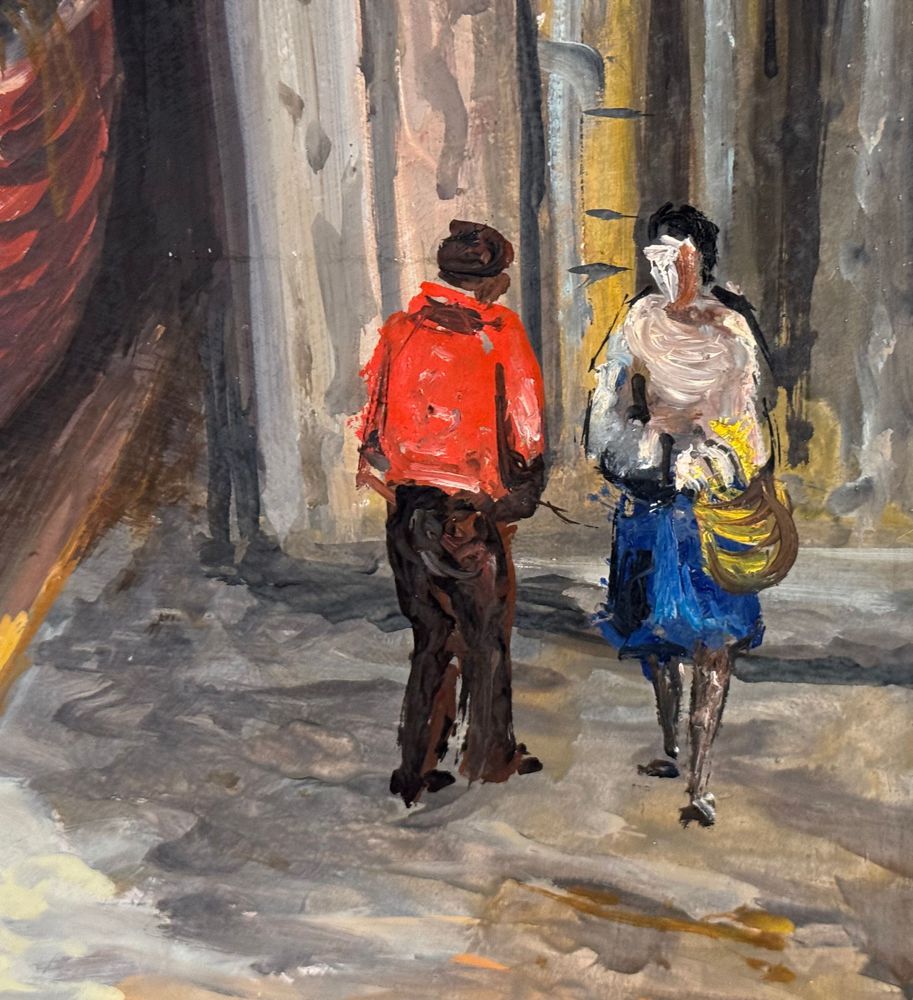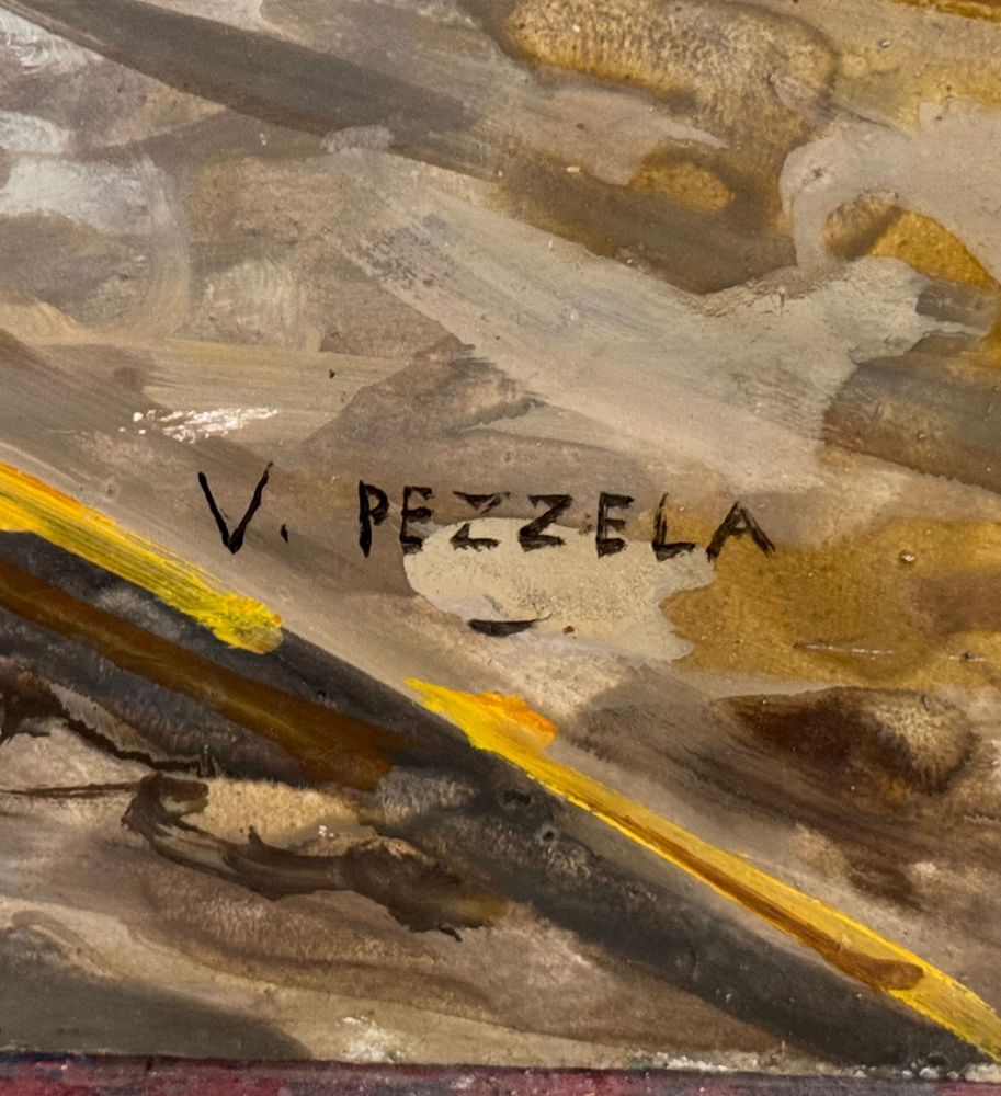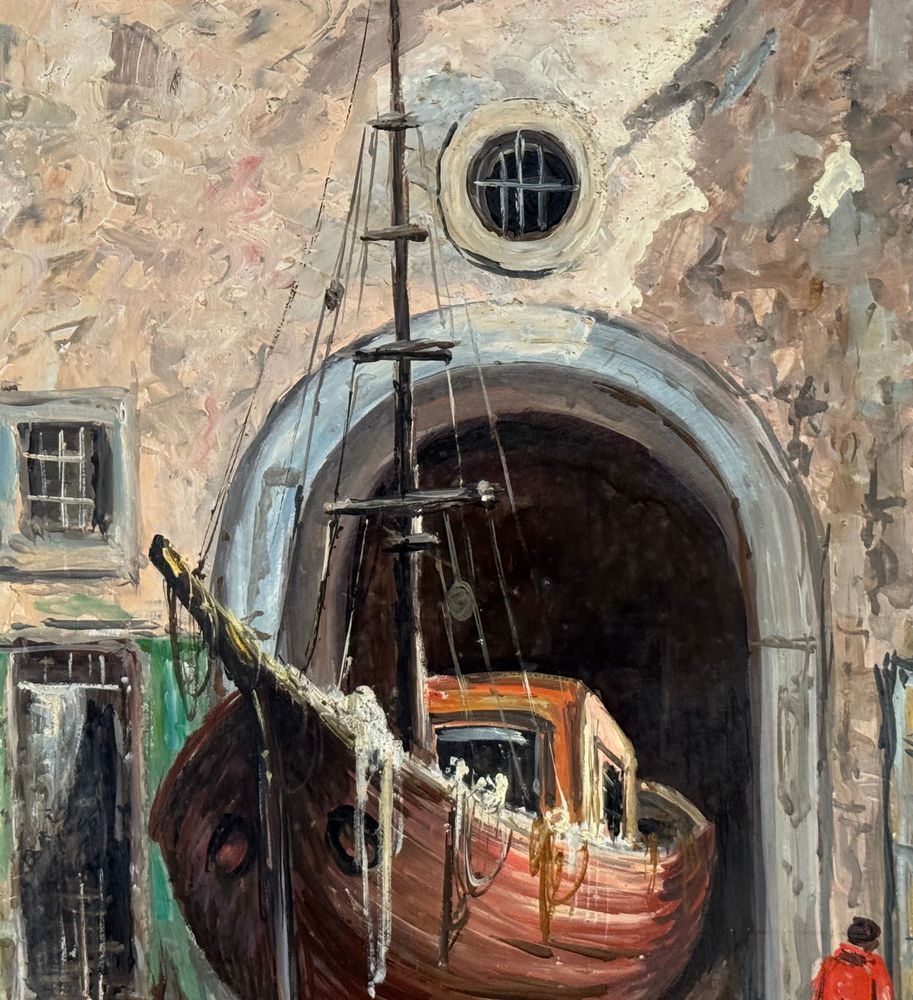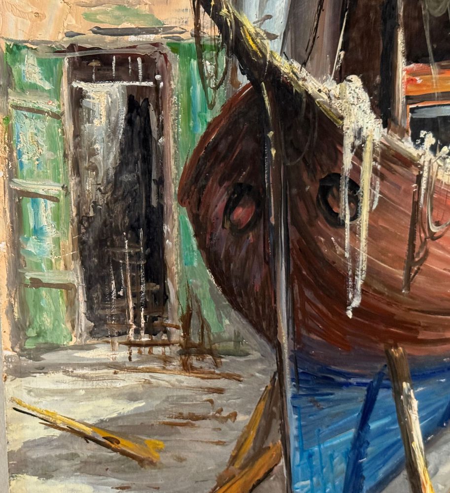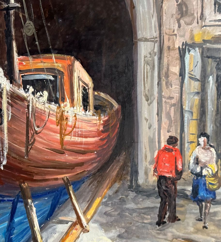 Dipinto olio su pannello, periodo XX secolo, scuola Italiana raffigurante Cantiere navale. Dimensioni: 50x70 cm. Firmato in basso a destra V. Pezzella. Opera in buone condizioni.