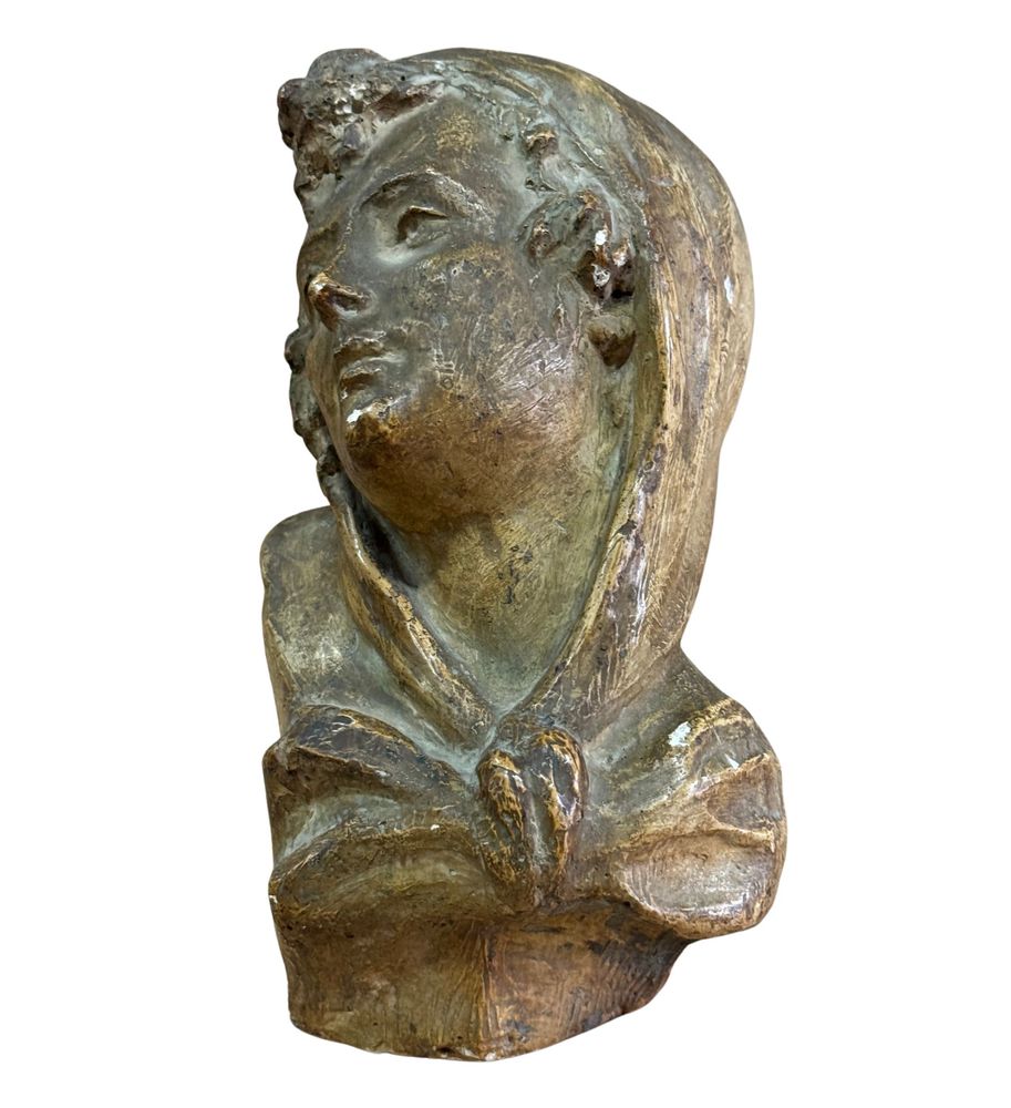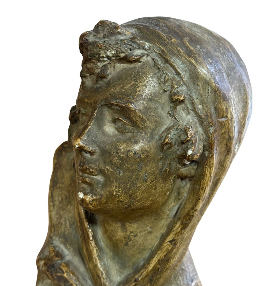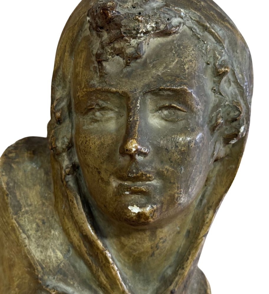 Scultura in scagliola, periodo XIX secolo raffigurante Volto femminile. Dimensioni: h23x15x14 cm. In buone condizioni con lievi segni di vissuto come da foto allegate.