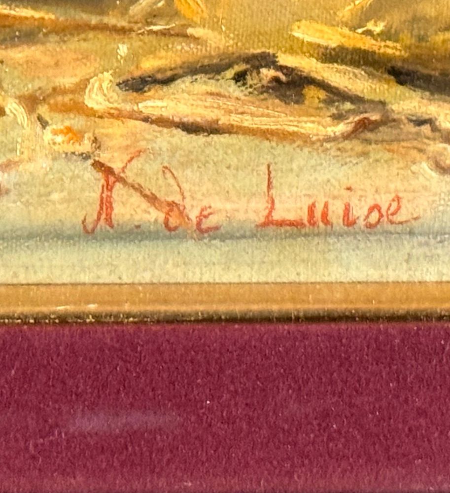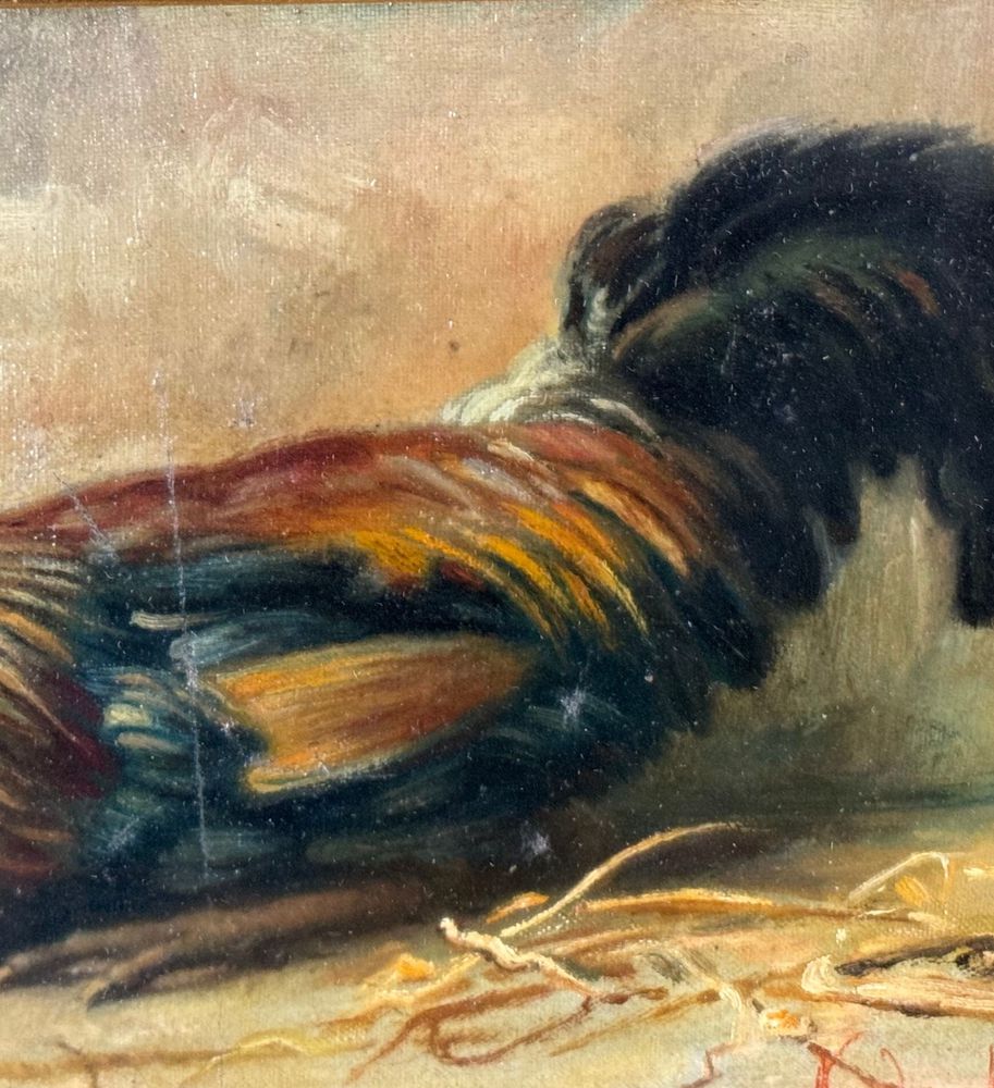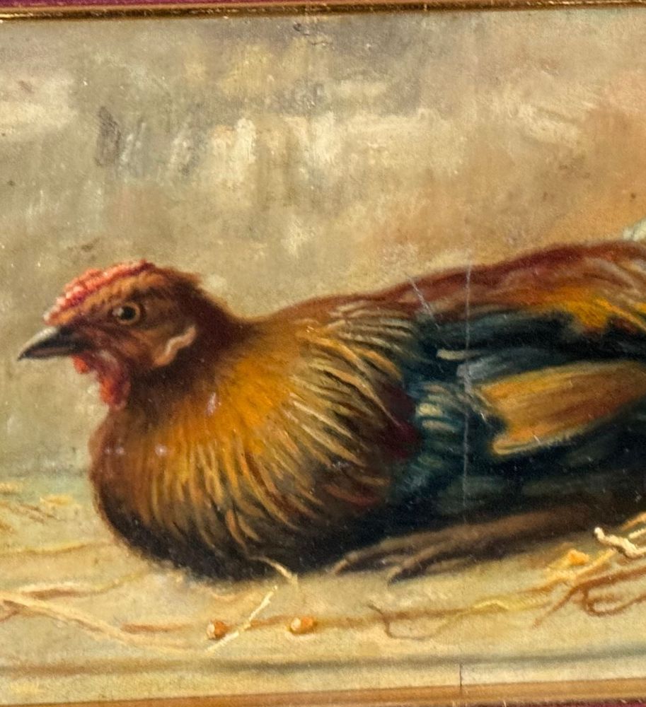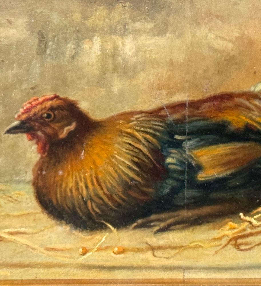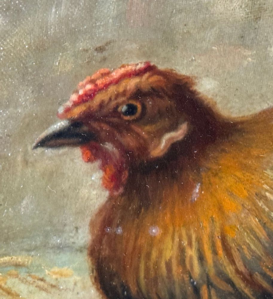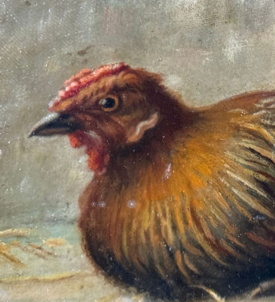 Dipinto olio su tela applicata su tavola, periodo XIX/XX secolo, scuola Italiana raffigurante Gallina. Dimensioni compreso cornice: 44x32 cm. Dimensioni interno cornice: 30x20 cm. Firmato in basso a destra De Luise. Opera in buone condizioni.
