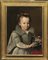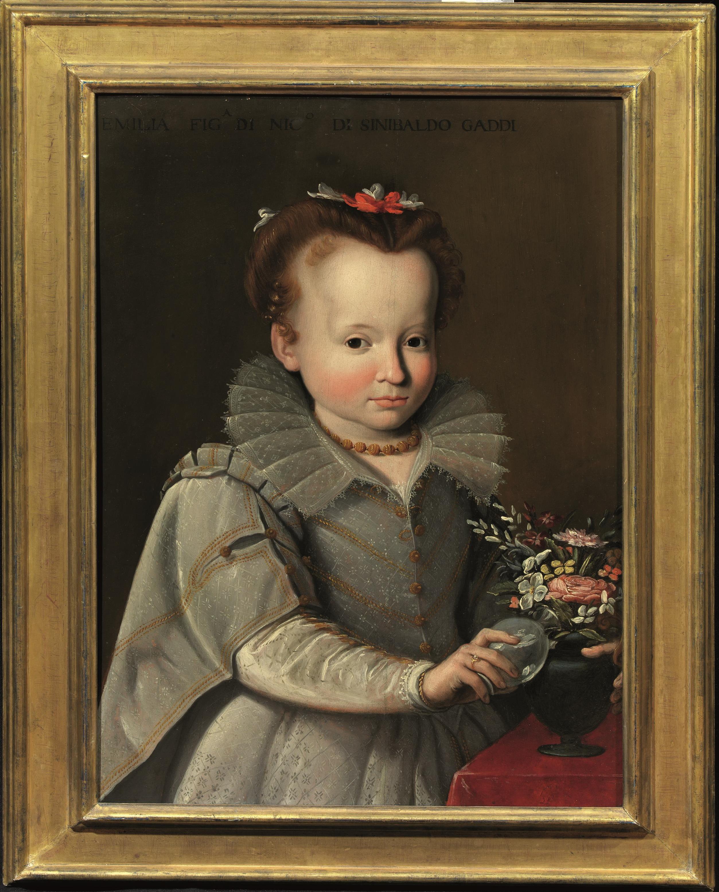 A partire da Francesco Solinas (2004) la nostra opera (che veniva riferita insieme al pendant raffigurante Sinibaldo alla mano di Santi di Tito in collaborazione con il figlio Tiberio) venne messa in relazione con il dipinto raffigurante la medesima effigiata a figura intera ma ambientata nel giardino del palazzo di famiglia, circondata da piante, una spalliera di agrumi, due busti antichi, architetture e sullo sfondo il campanile di Santa Maria Novella (chiesa di famiglia), mentre nutre un pappagallo. Tale dipinto (già collezione privata svizzera), recentemente passato in un’asta Sotheby’s di New York nel 2011, lotto 6, come Ritratto di Lucrezia, figlia di Niccolò di Sinibaldo Gaddi, veniva messo in relazione alla nostra tavola, che costituisce un’altra versione a mezzo busto della stessa effigiata. La bambina ritorna infatti pressochè identica: vestita con il medesimo abito decorato d’oro e con la stessa collana e acconciatura, a variare, come già indicato, il formato e l’ambientazione. Nell’elegante versione qui proposta infatti la piccola viene rappresentata in un interno, intenta a versare acqua all’interno di un vaso di fiori e il suo alto rango sociale é testimoniato dalla ricchezza dei gioielli e dell’abito con gorgiera con cui viene rappresentata, secondo una moda che divenne popolare nella metà degli anni sessanta del Cinquecento. L’identificazione della giovane si basava suoi precedenti contributi di Cristina De Benedictis (cfr: C. De Benedictis, Altari e committenza: episodi a Firenze nell'età della Controriforma, Firenze 1996, pp. 11-12 e p. 17, nota 12) che ne riconosceva la figlia primogenita di Niccolò Gaddi, nata nel 1559, raffigurata all'età di circa cinque anni probabilmente come ritratto postumo, a causa della presenza del funesto simbolo del topo delle piramidi e quindi realizzato forse in occasione del solenne completamento della cappella di famiglia costruita da Dosio nella quale la piccola Lucrezia fu tumulata nel 1577.