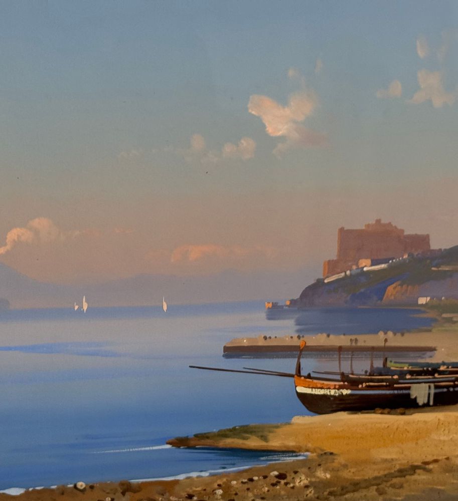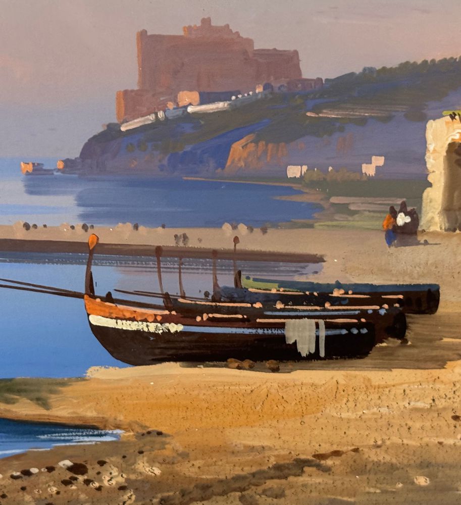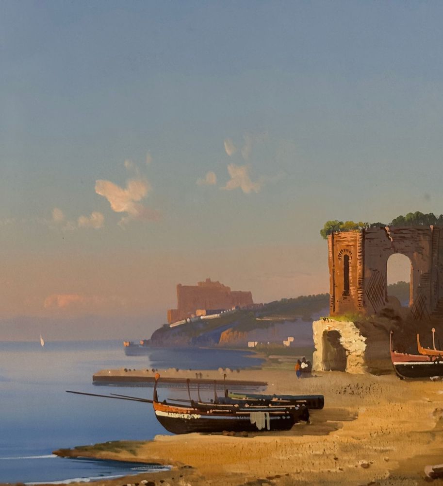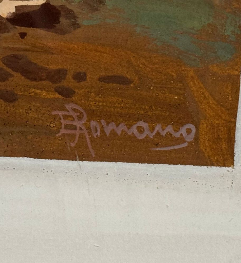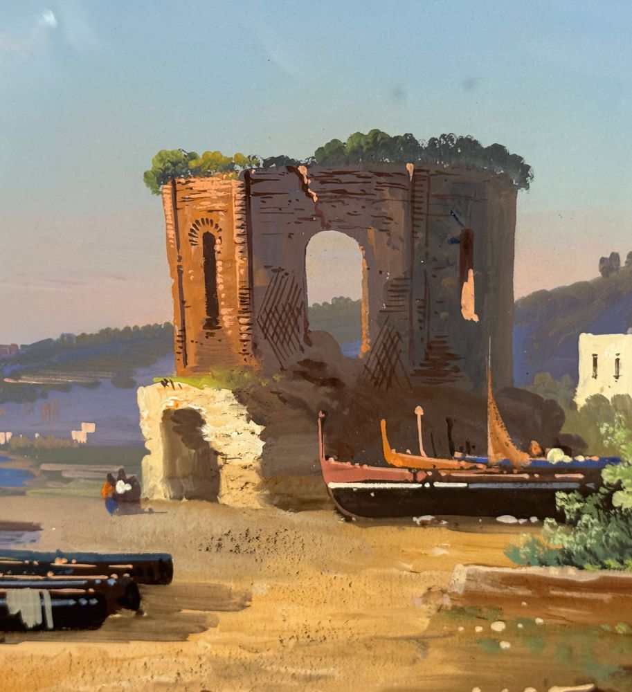 Dipinto guazzo (tempera su carta), periodo XIX/XX secolo, scuola Italiana raffigurante Napoli da Mergellina. Dimensioni compreso cornice: 59x49 cm. Dimensioni interno cornice: 38x28 cm. Firmato in basso a destra E. Romano. Opera in buone condizioni.
