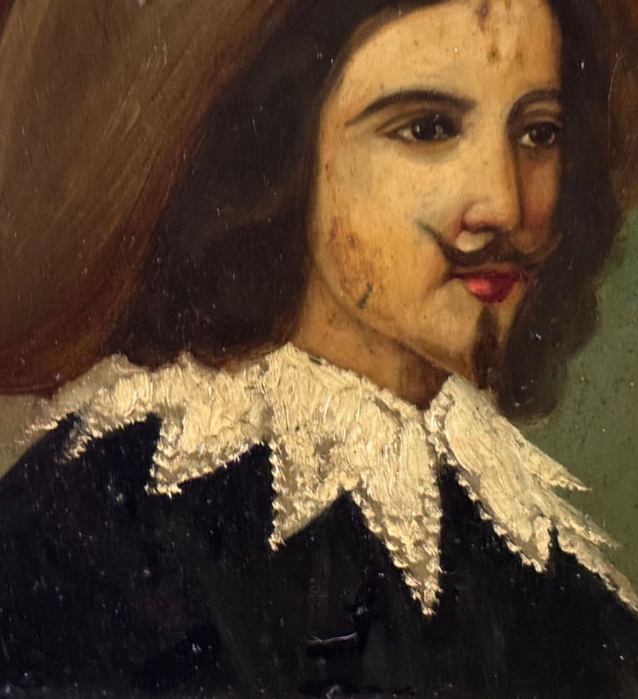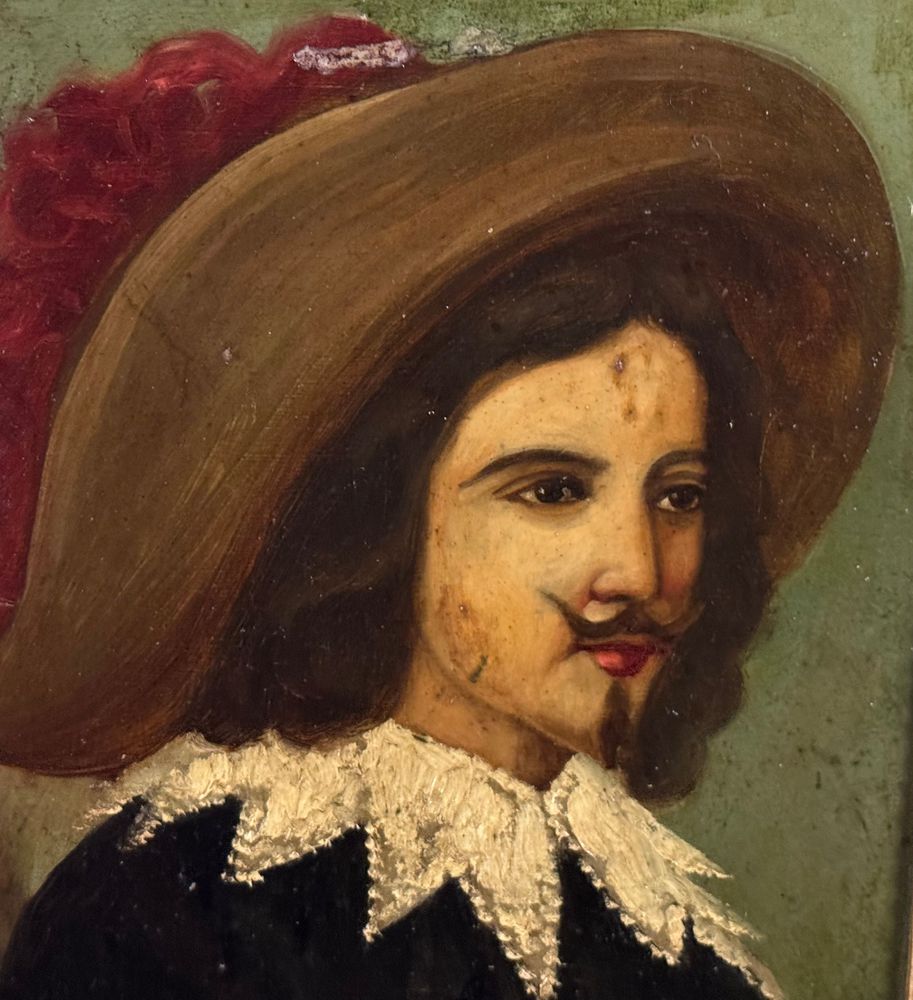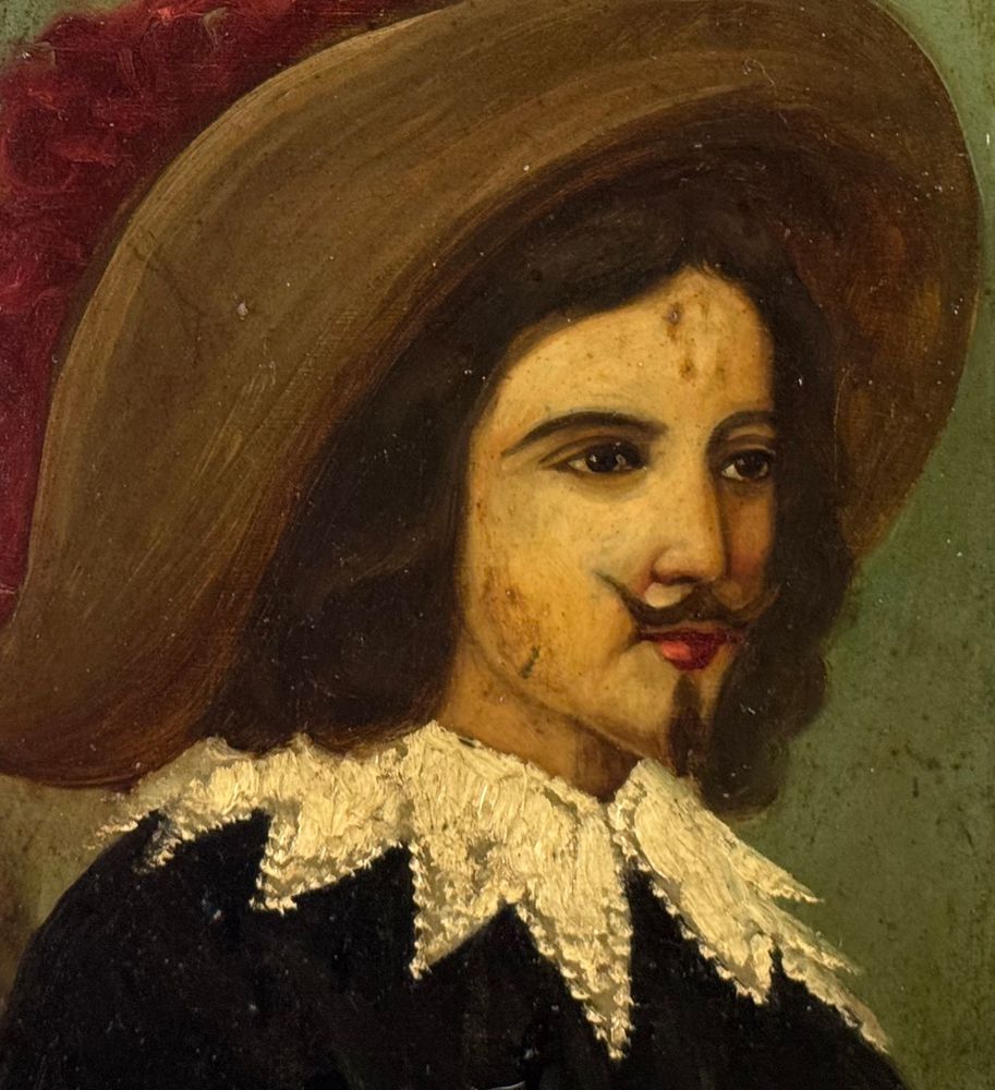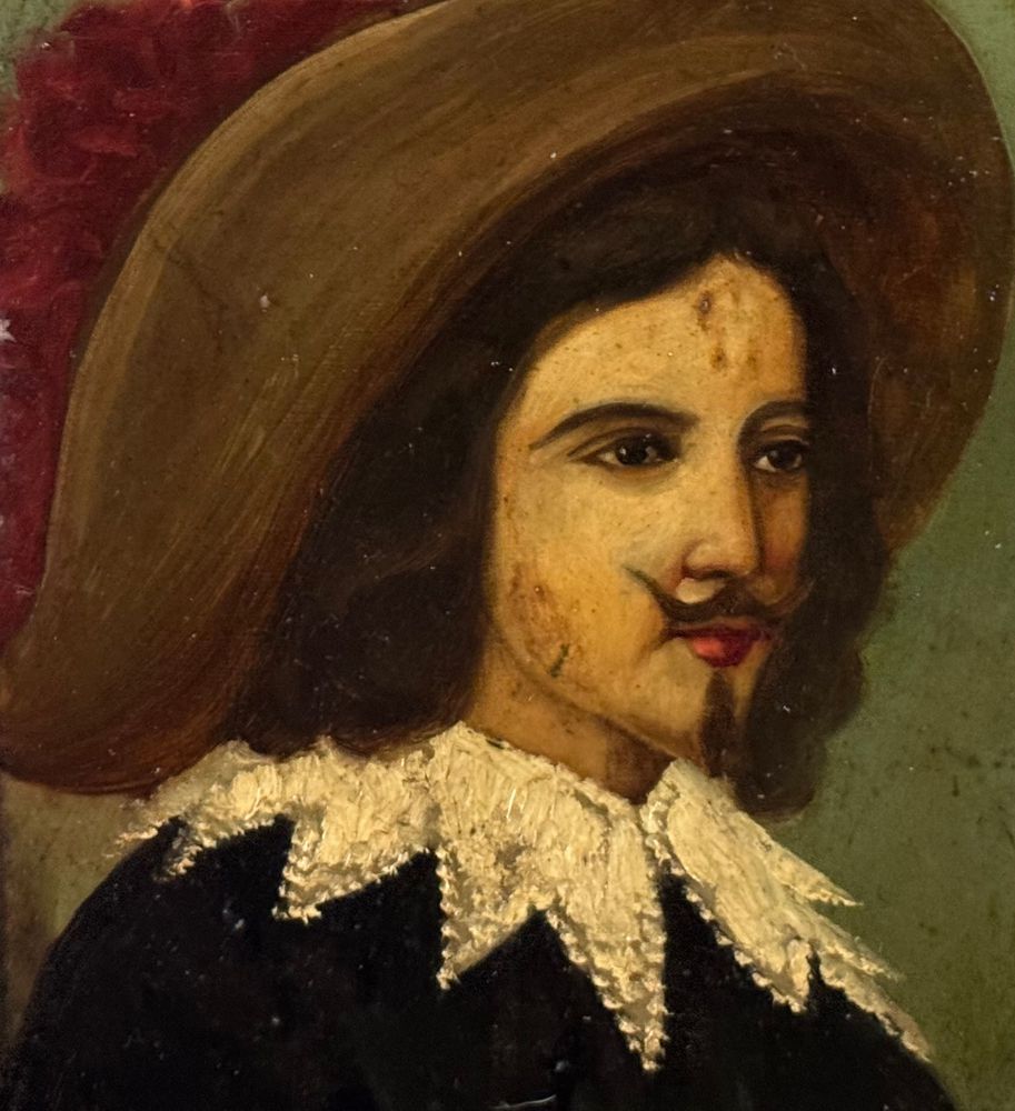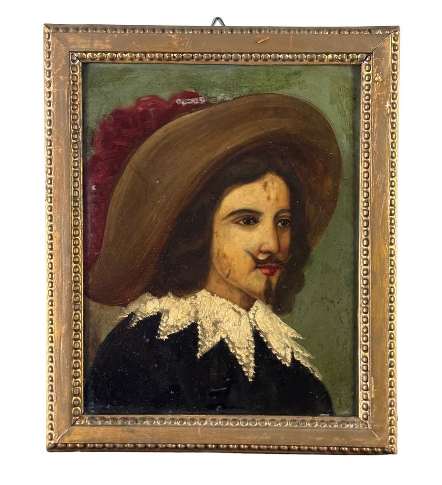 Dipinto olio su placca di metallo, periodo XIX secolo, scuola Italiana raffigurante Moschettiere. Dimensioni compreso cornice: 30x36 cm. Dimensioni interno cornice: 24x31 cm. Artista anonimo. Opera in buone condizioni.