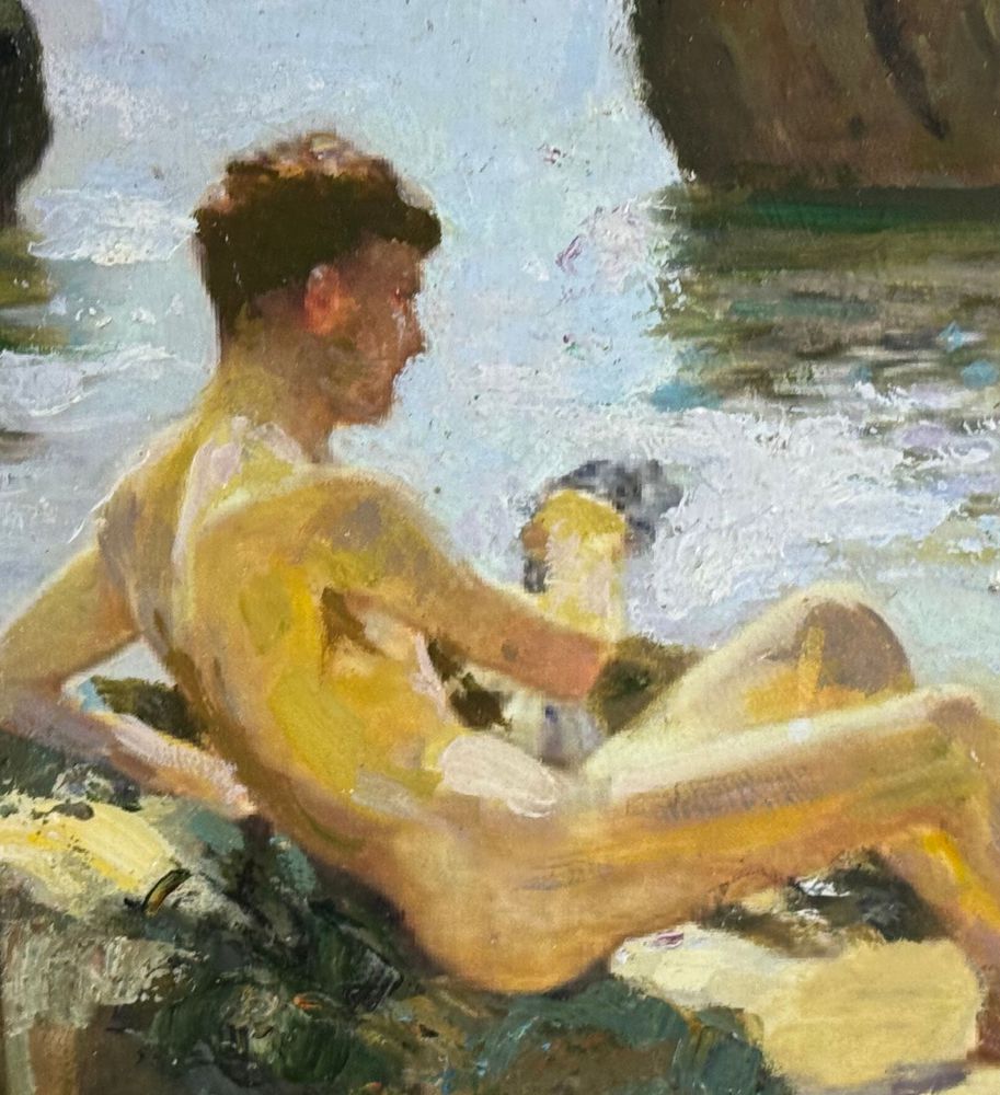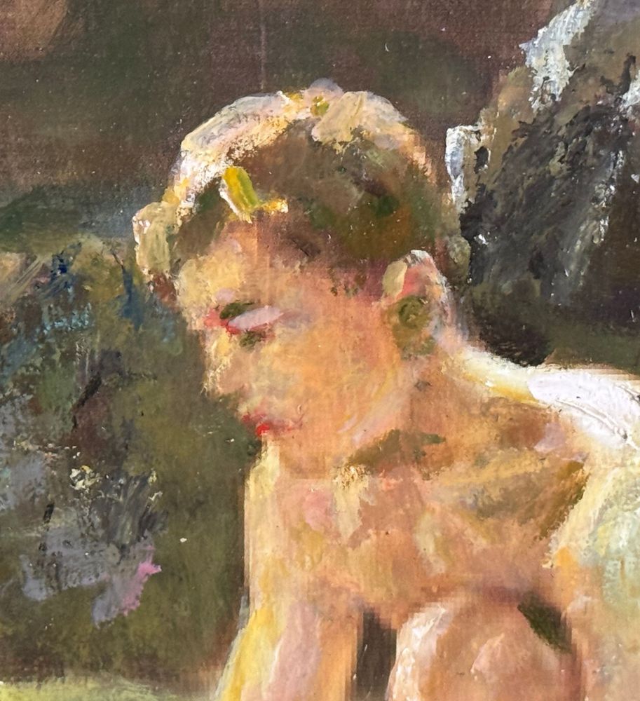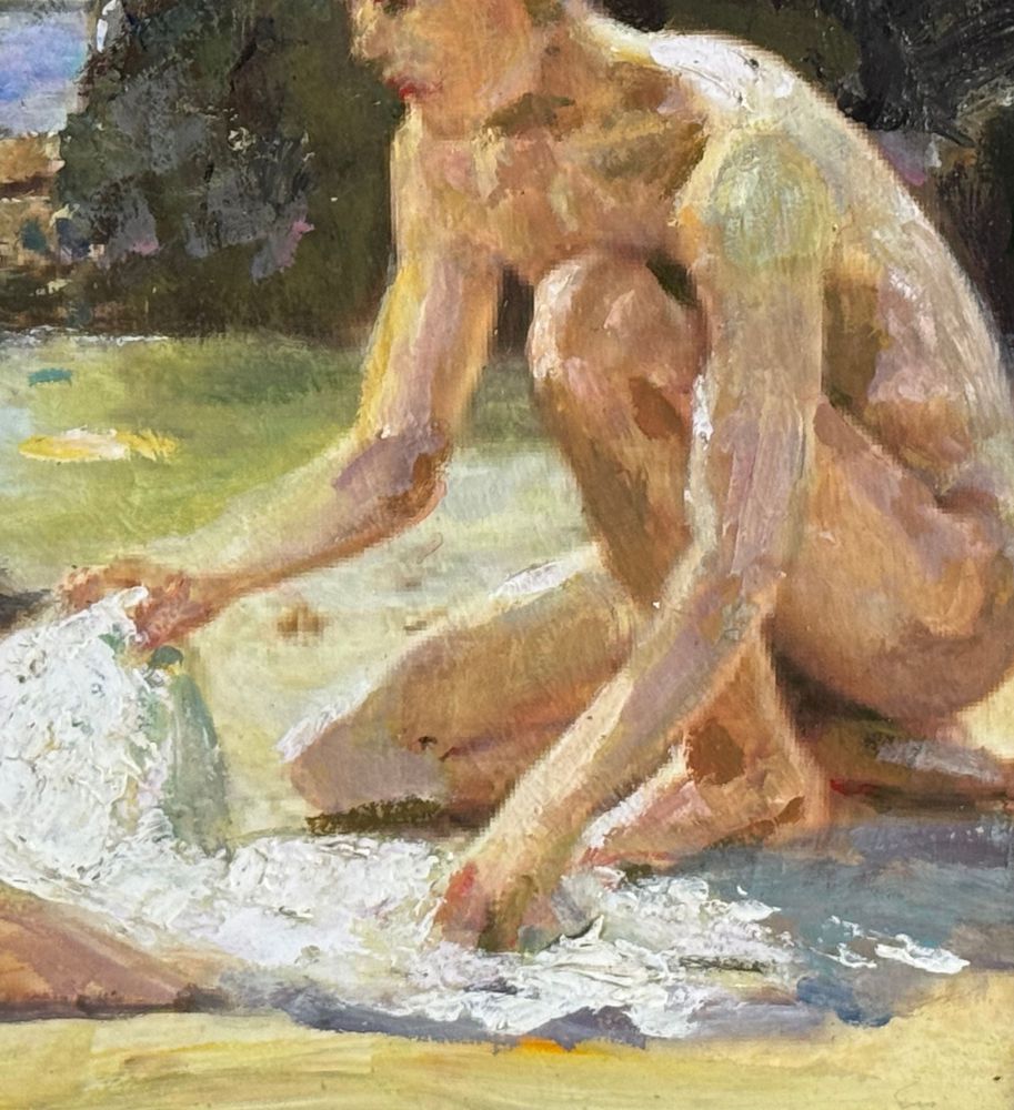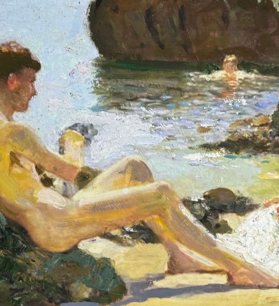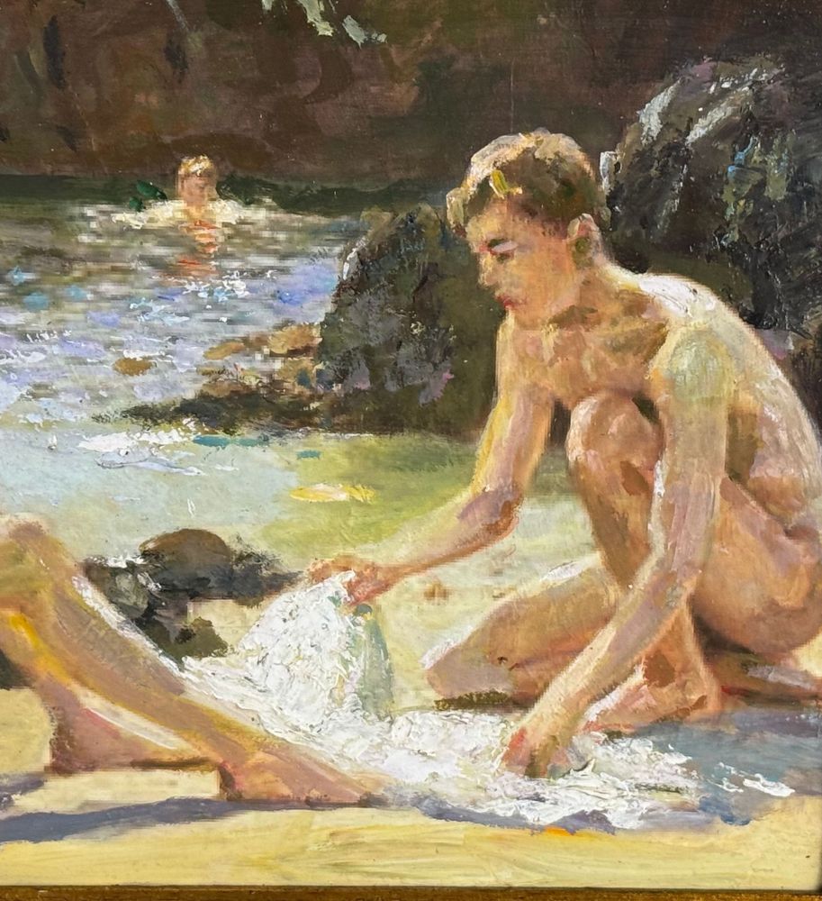 Dipinto olio su pannello, periodo XX secolo, scuola Italiana raffigurante Giovani bagnanti. Dimensioni compreso cornice: 52x37 cm. Dimensioni interno cornice: 40x25 cm. Artista anonimo. Opera in buone condizioni.