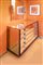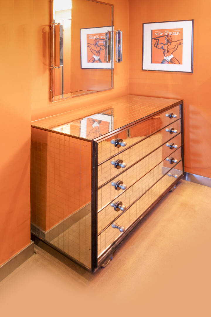Legno rivestito in vetro specchiato e piedini in cristallo. Particolari in metallo.