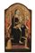 Il dipinto, che, per le dimensioni, é immaginabile come il centro di un trittico o polittico, appare ben leggibile e giudicabile, nonostante i segni lasciati da vecchi interventi di restauro su alcune porzioni della superficie pittorica. Integrazioni a tinta neutra si ravvisano infatti in estese zone del nimbo di Gesù Bambino, nel bordo dorato del manto e della veste di Maria, ed anche nel margine punzonato della tavola. Sulla superficie pittorica si riconoscono inoltre altre stuccature (nella veste e nel manto della Vergine) e qualche ridipintura (nel volto dell’angelo in piedi a sinistra e nella stoffa che riveste la seduta del trono). Il supporto é stato risagomato con vertice a triloba ribassata, probabilmente per l’inserimento in qualche stucco tardo-barocco. Sul retro si notano inoltre i segni dell’alloggiamento di tre traverse, anche se permane il dubbio che non corrispondano a quelle originali (di prassi soltanto due), tolte quando la tavola fu privata dei suoi laterali. E’ infatti verosimile che fosse il centrale di un polittico.