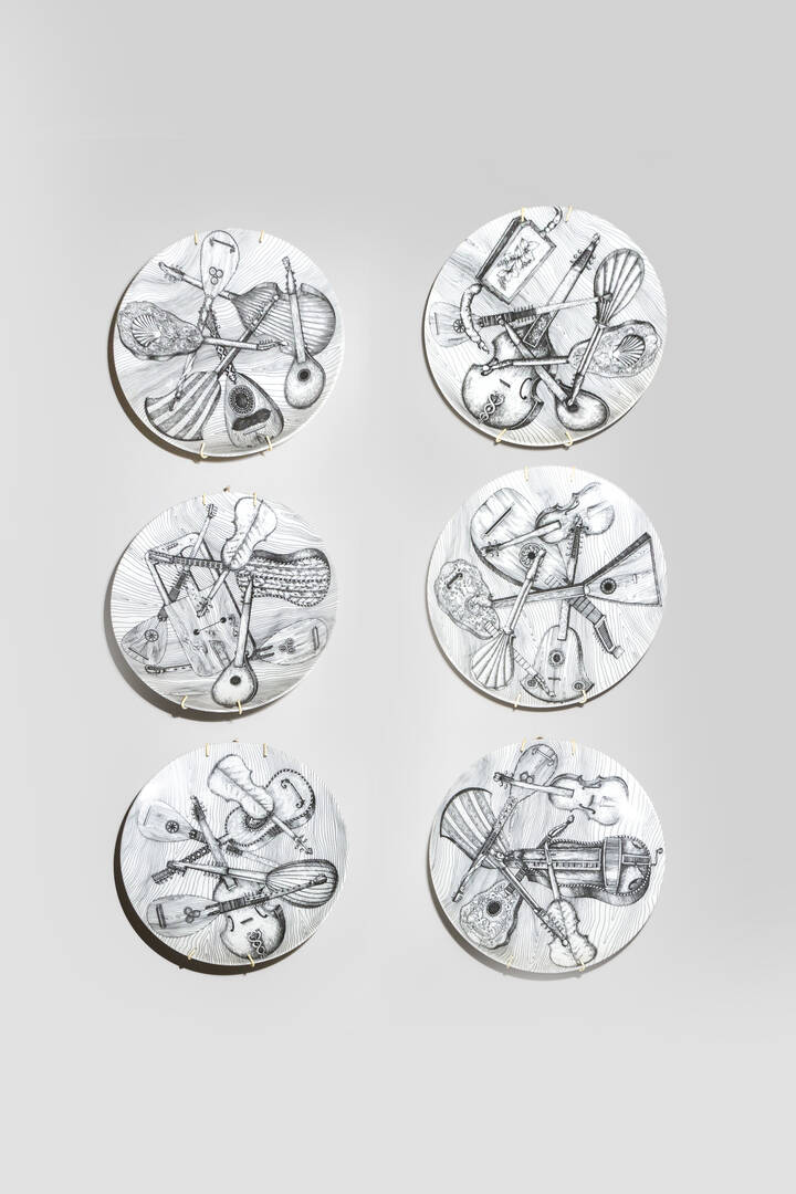 PIERO FORNASETTI<BR>Milano 1913 - 1988<BR>Lotto di 6 piatti della serie"Strumenti", anni '60