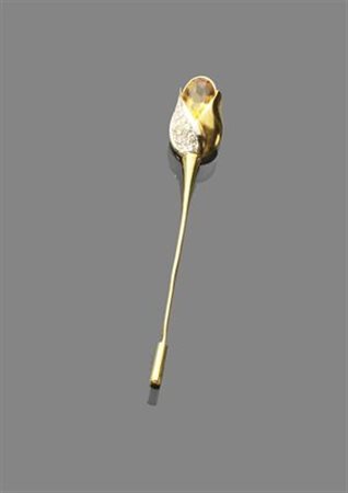 SPILLA Spillone in oro giallo con quarzo citrino di taglio ovale e diamanti taglio brillanti per complessivi ct 0,40 ca Peso gr 10,50 yellow gold brooch with oval citrine and brillant cut diamonds approx total 0,40 kt Weight 10.50 gr