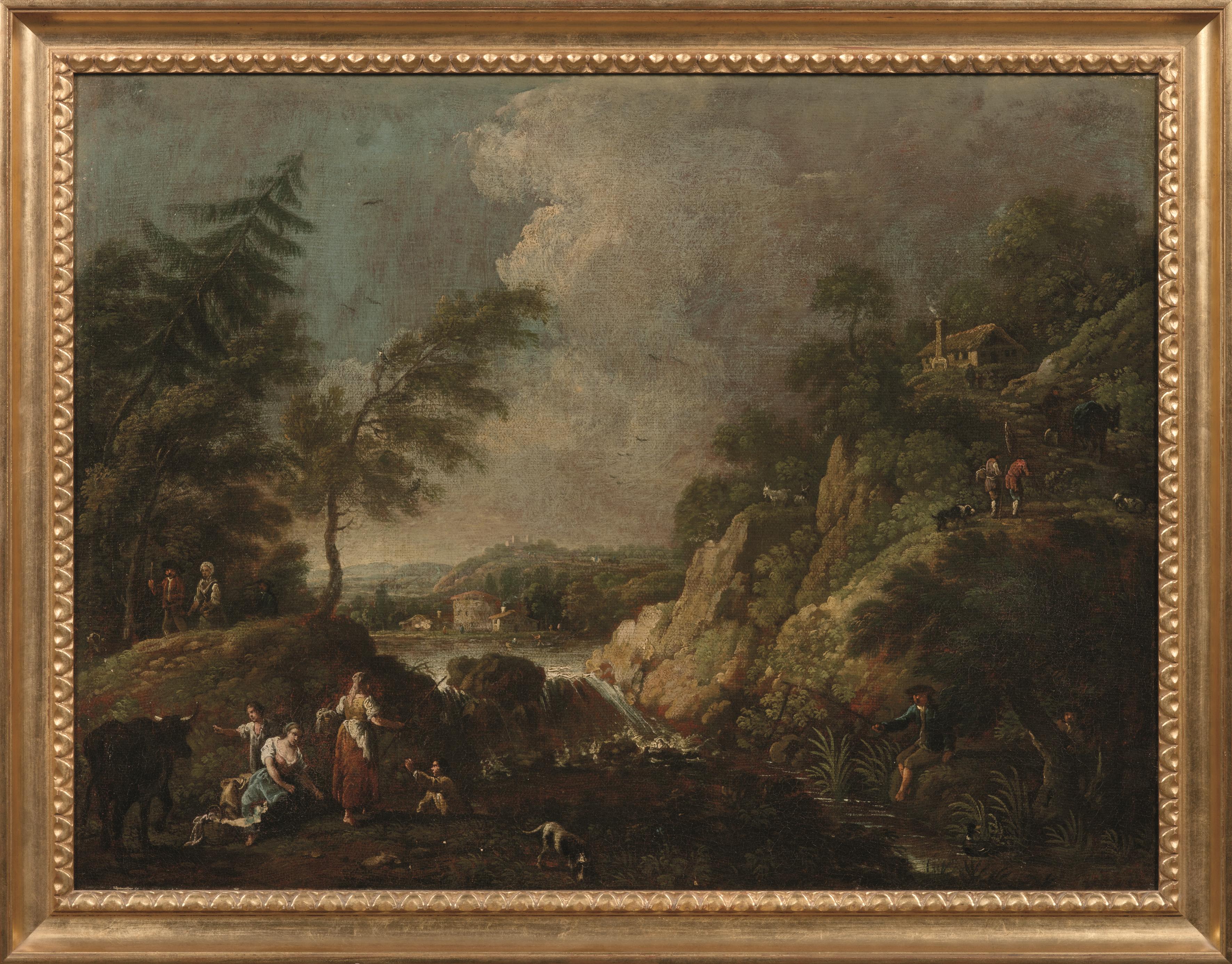 Pittore veneto, sec. XVIIIPAESAGGIO CAMPESTRE CON FIGUREolio su tela, cm...