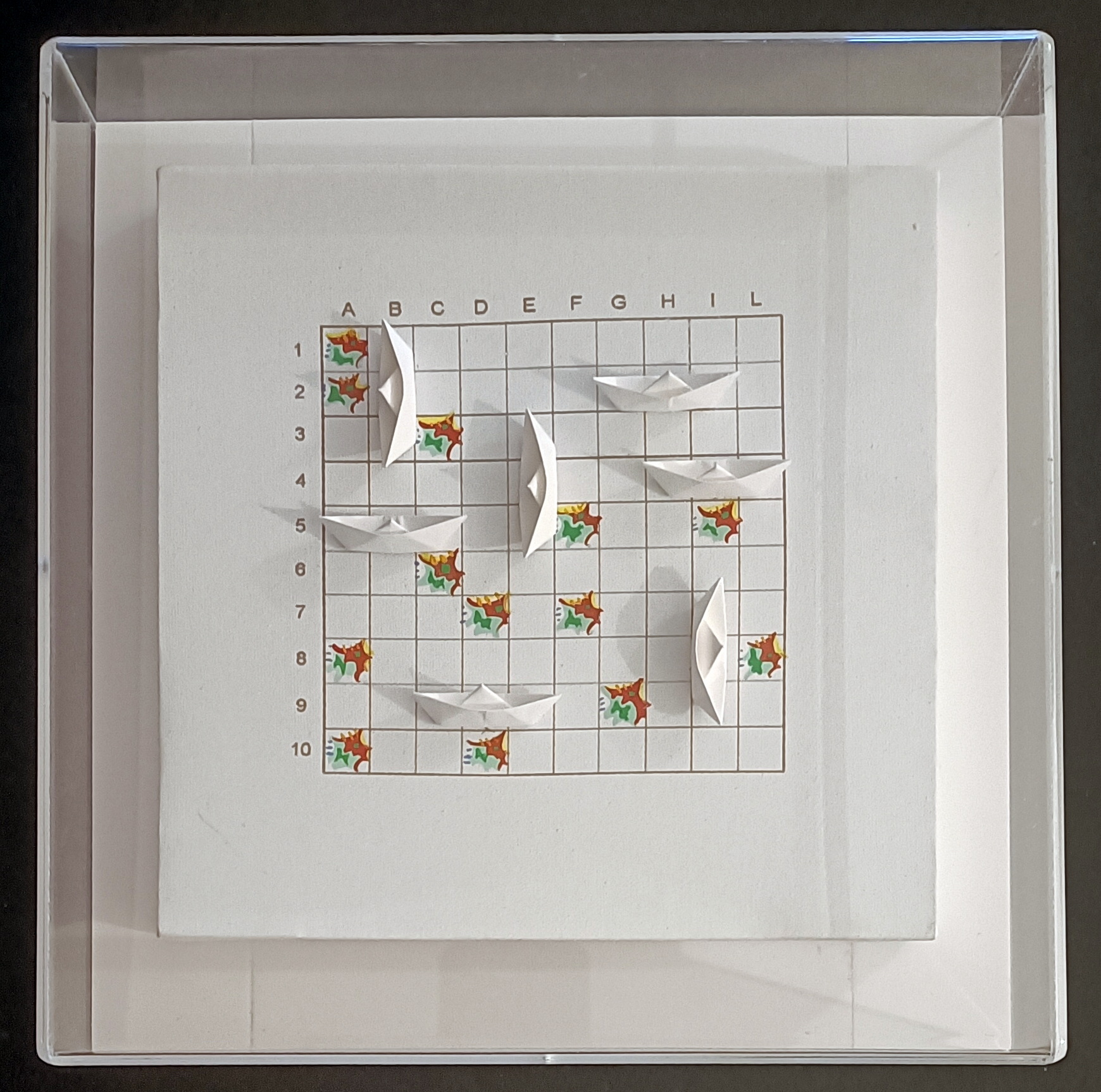 Collage di barche di carta e acrilico su tela (teca plexi)