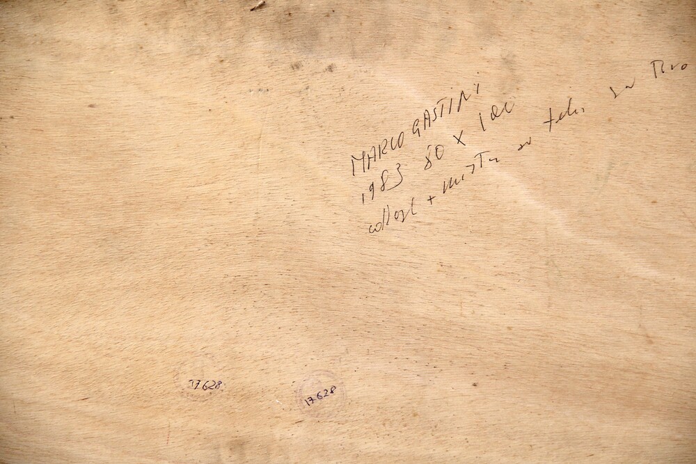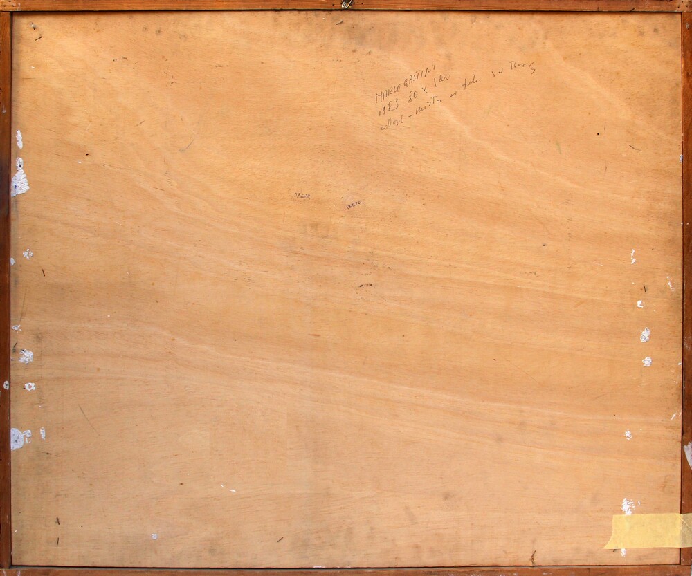 Firma, data, dimensioni, tecnica "Marco Gastini, 1983, 80x100, collage + mista su tela su tavola";