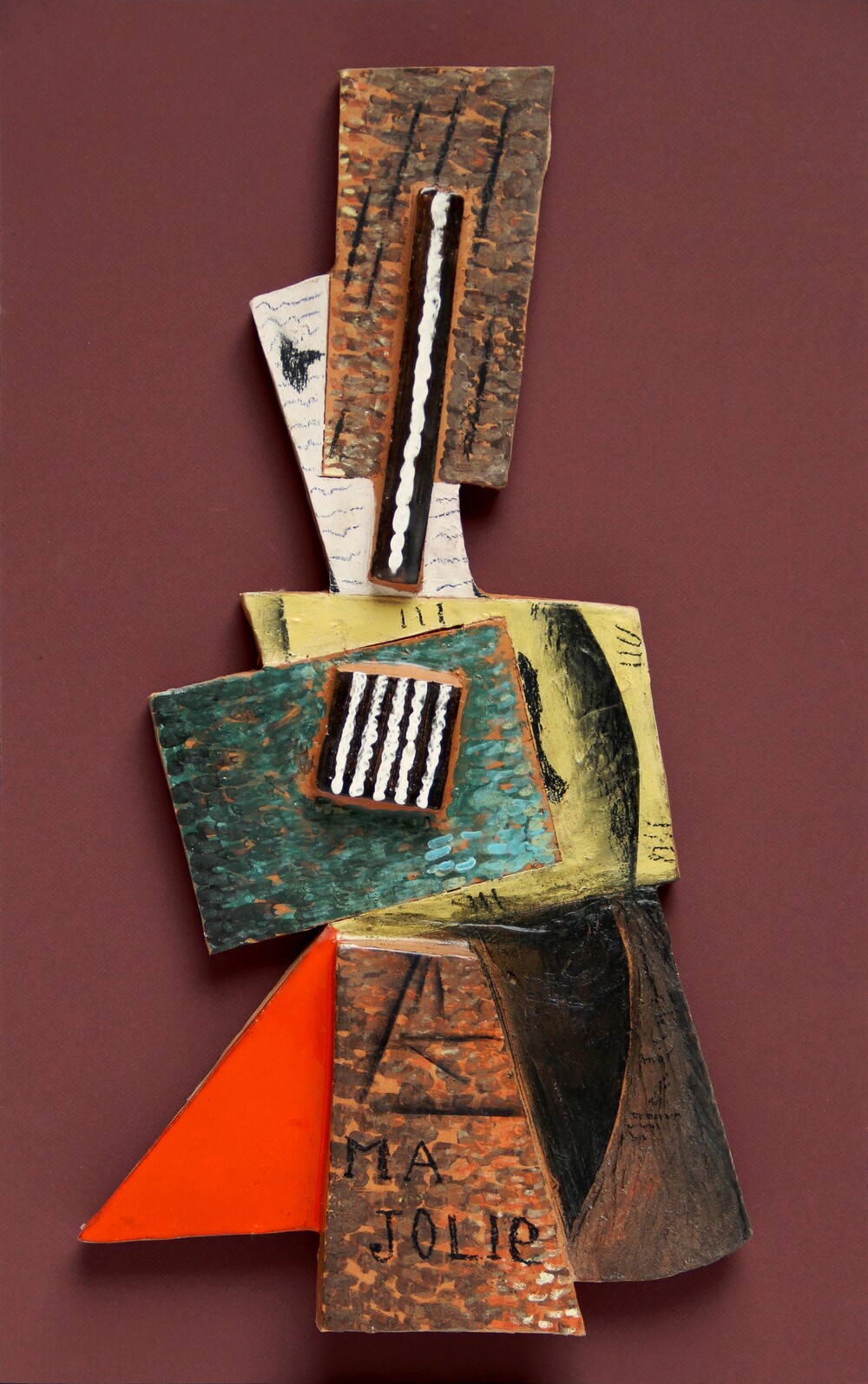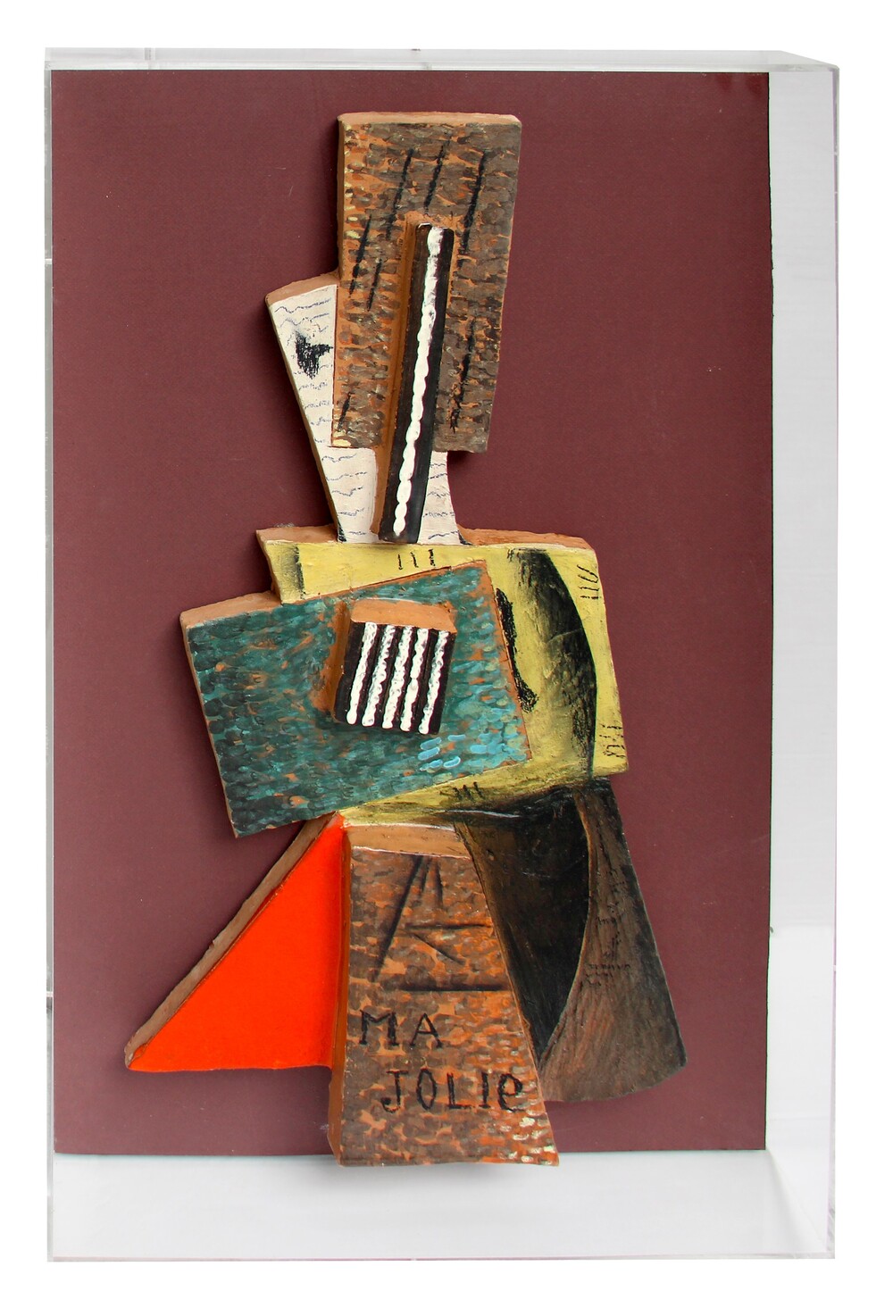 Ma jolie, 70's, legni colorati e ceramica su tavola, cm 80x50