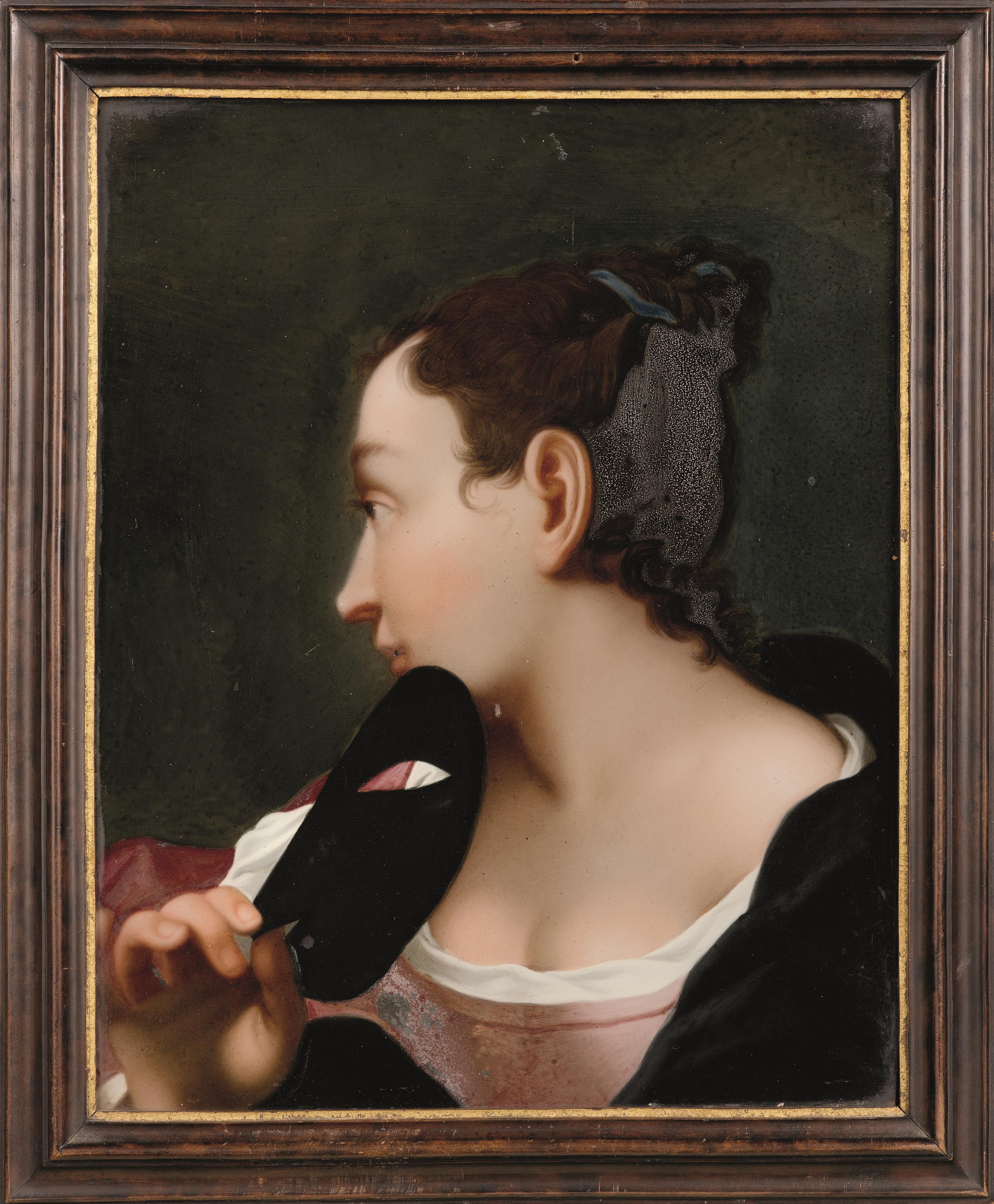 Pittore veneto, sec. XVIIIRITRATTO DI DAMA CON MASCHERAolio su vetro,...