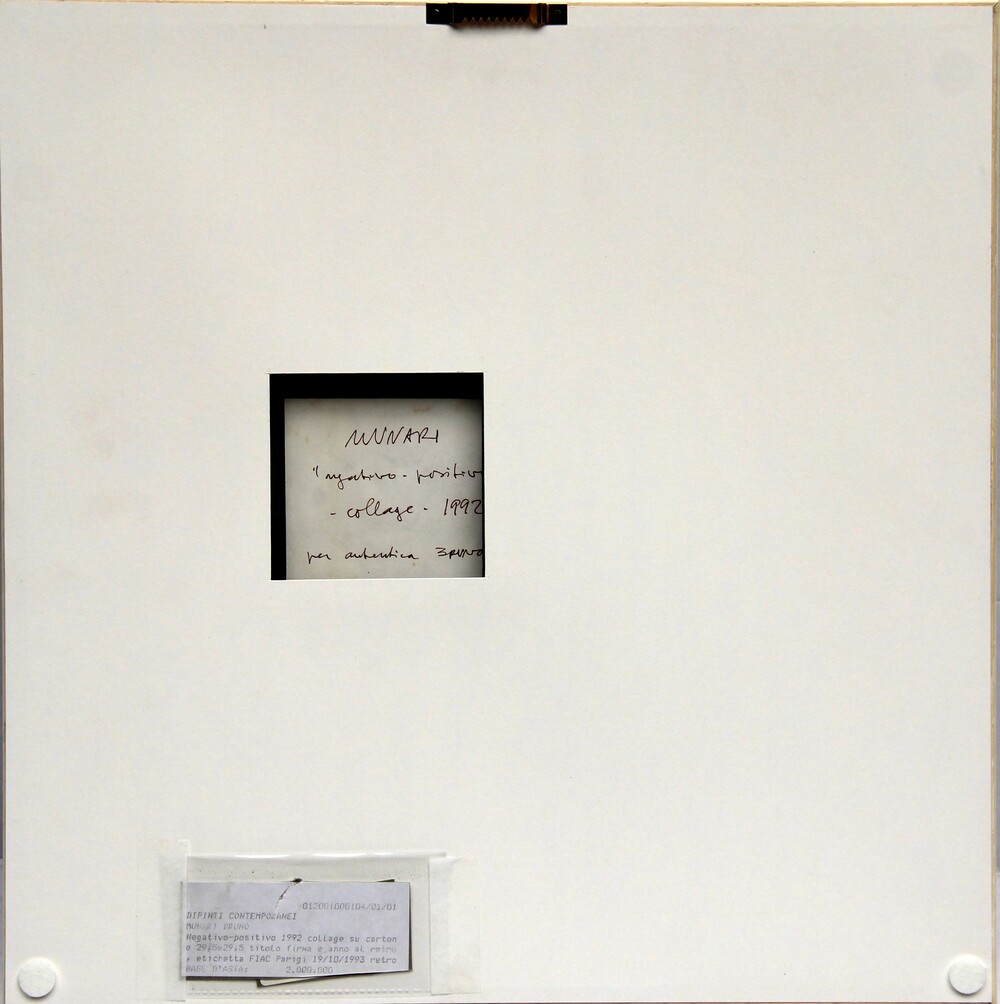 Firma, titolo, tecnica, data, scritta "Munari, Negativo - Positivo, collage, 1992, per autentica, Bruno" (al retro)