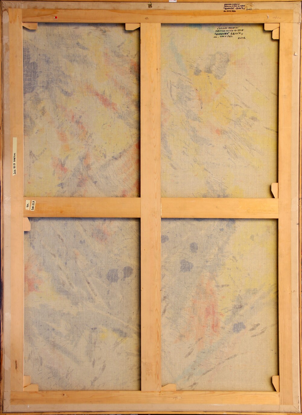 Firma, tecnica, titolo, dimensioni, data "Sandro Martini, tecnica mista su tela, Quantità garuta, cm 200x145, 2003" (al retro)