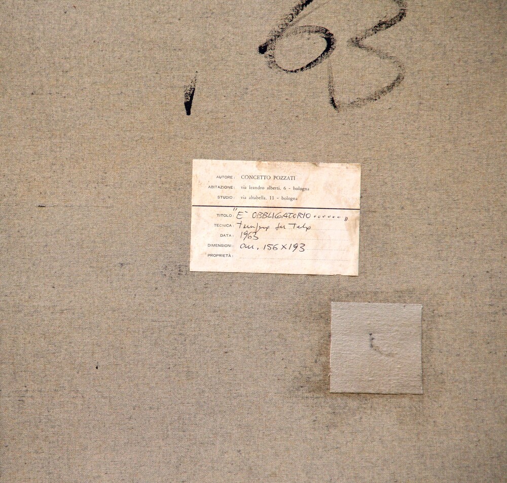 Titolo, firma, data "È obbligatorio....., Pozzati, '63";