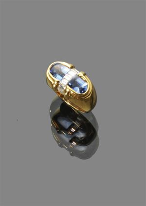 ANELLO Anello in oro giallo con due zaffiri taglio fantasy per complessivi ct 4,00 ca e diamanti taglio baguette per complessivi 0,30 ca Peso gr 12,20 Yellow gold ring with two sapphires total 4,00 kt and baguette-cut diamonds totaling approximately 0.30 Weight 12.20 gr
