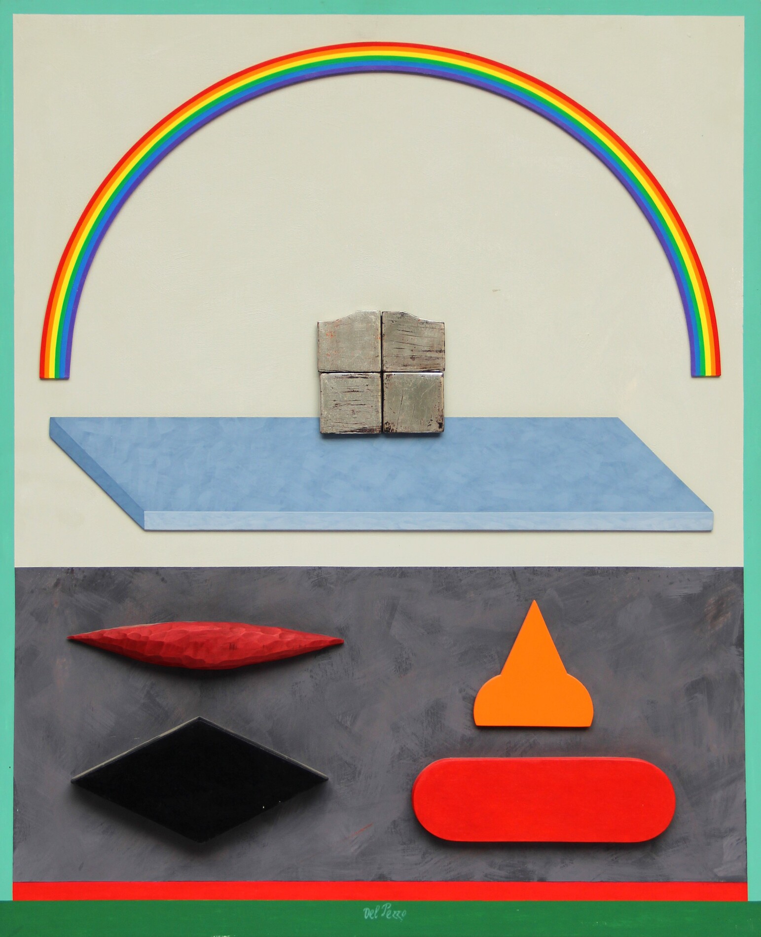 Firma, titolo, tecnica, dimensioni "Lucio del Pezzo, Arcobaleno, collage, acrilico su legno, cm 60x75";