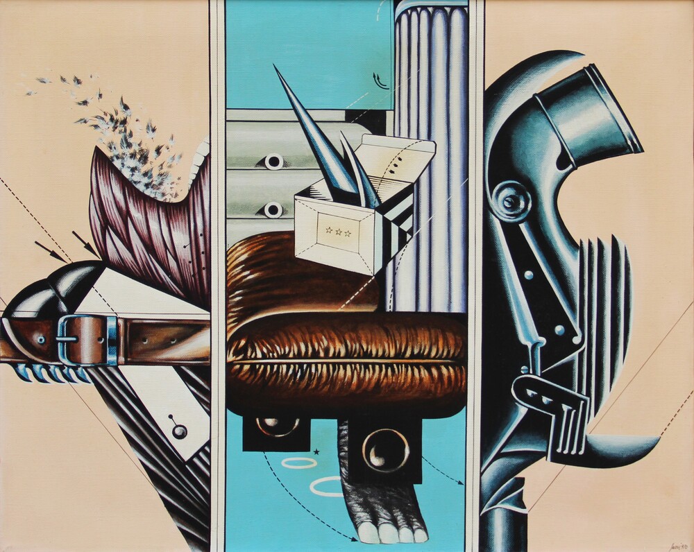 Interno-persona-oggetto (L'uomo di piume), 1970, acrilico su tela, cm 65x80