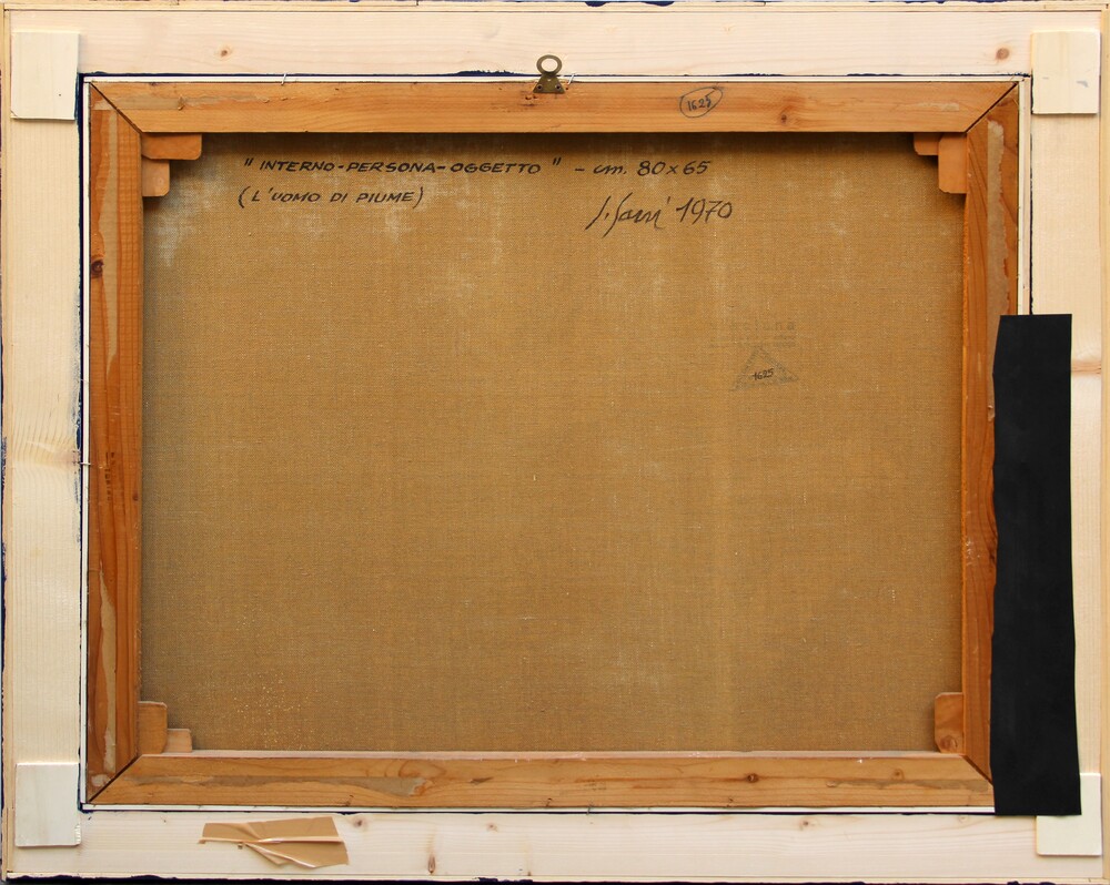 Titolo, dimensioni, firma, data "Interno-persona-oggetto (L'uomo di piume), cm 80x65, S. Sarri, 1970"