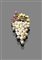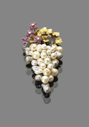 SPILLA Spilla in oro giallo a grappolo di perle sferiche e perle grige scaramazze con rubini taglio rotondo e tre piccoli diamanti vecchio taglio Peso gr 29,70 Cluster of grapes motif gold brooch with spherical and gray pearls, round rubies and 3 antique cut diamonds. Weight 29.70 gr