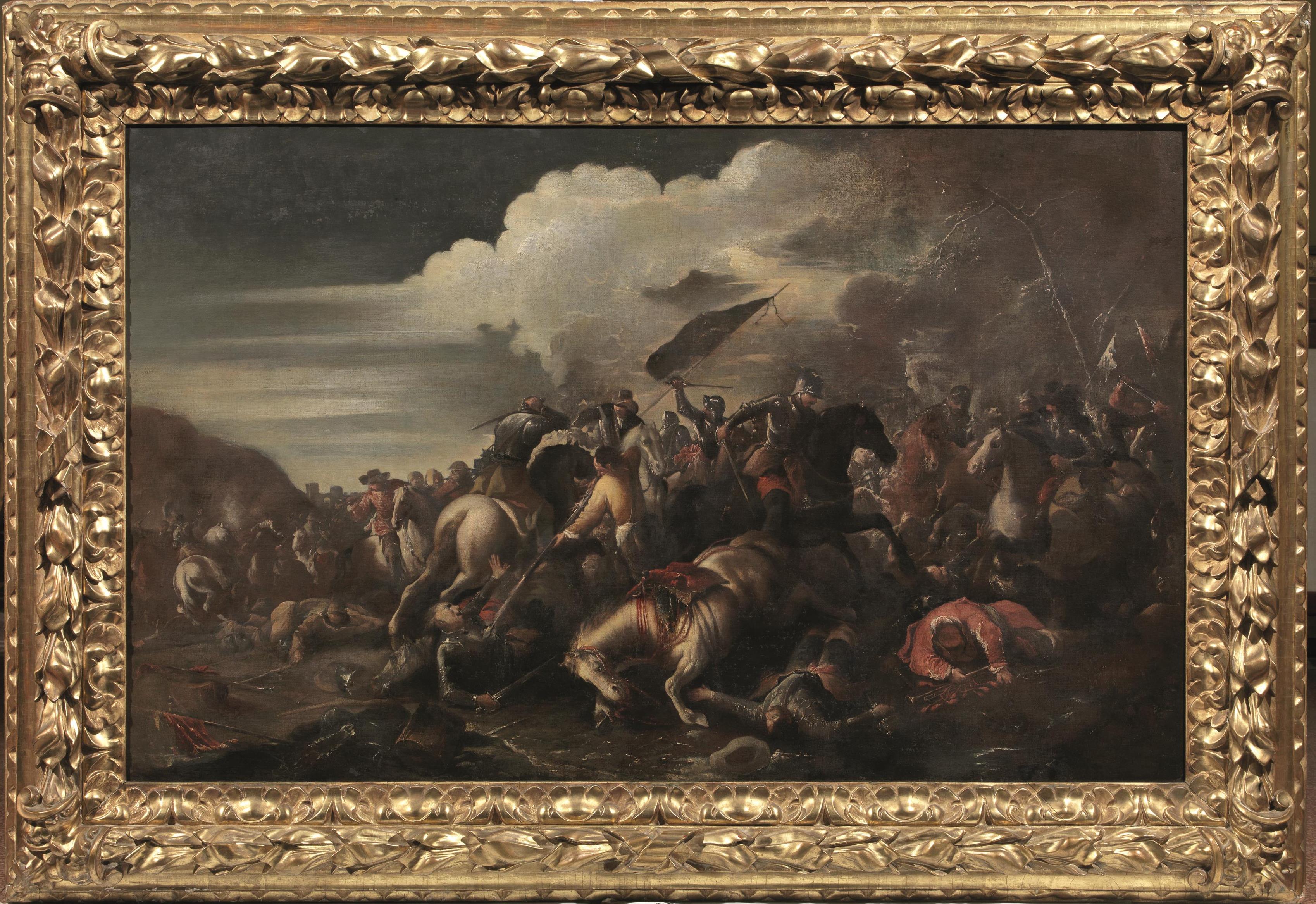 Precedentemente riferito all’ambito del Brescianino, il dipinto qui offerto appare piuttosto riconducibile alla cerchia più immediata del veronese Antonio Calza (Verona 1653-1725), battaglista altrettanto noto e prolifico sebbene riscoperto più di recente.