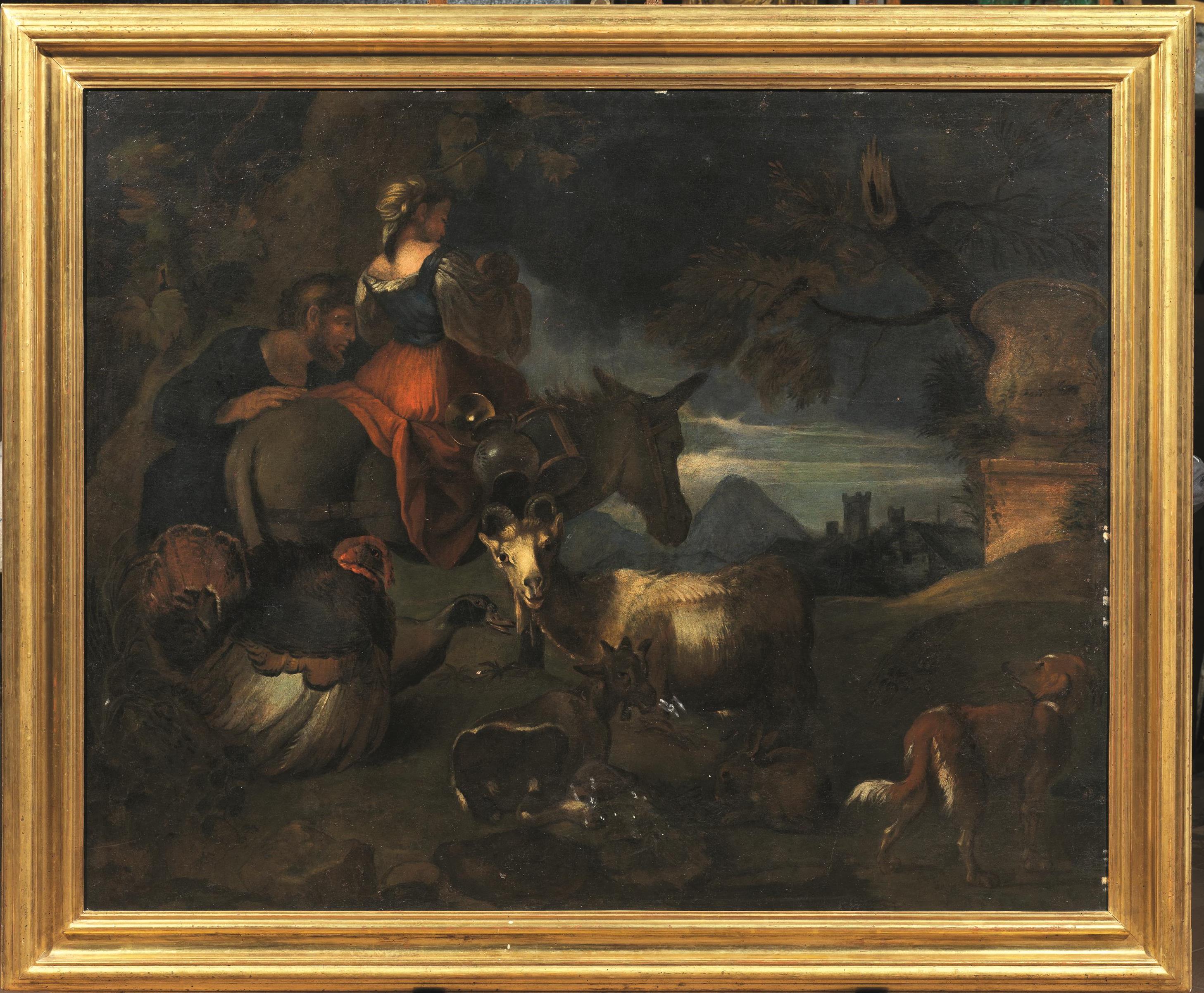 Scuola genovese, sec. XVIIFUGA IN EGITTOolio su tela, cm 108,5x137