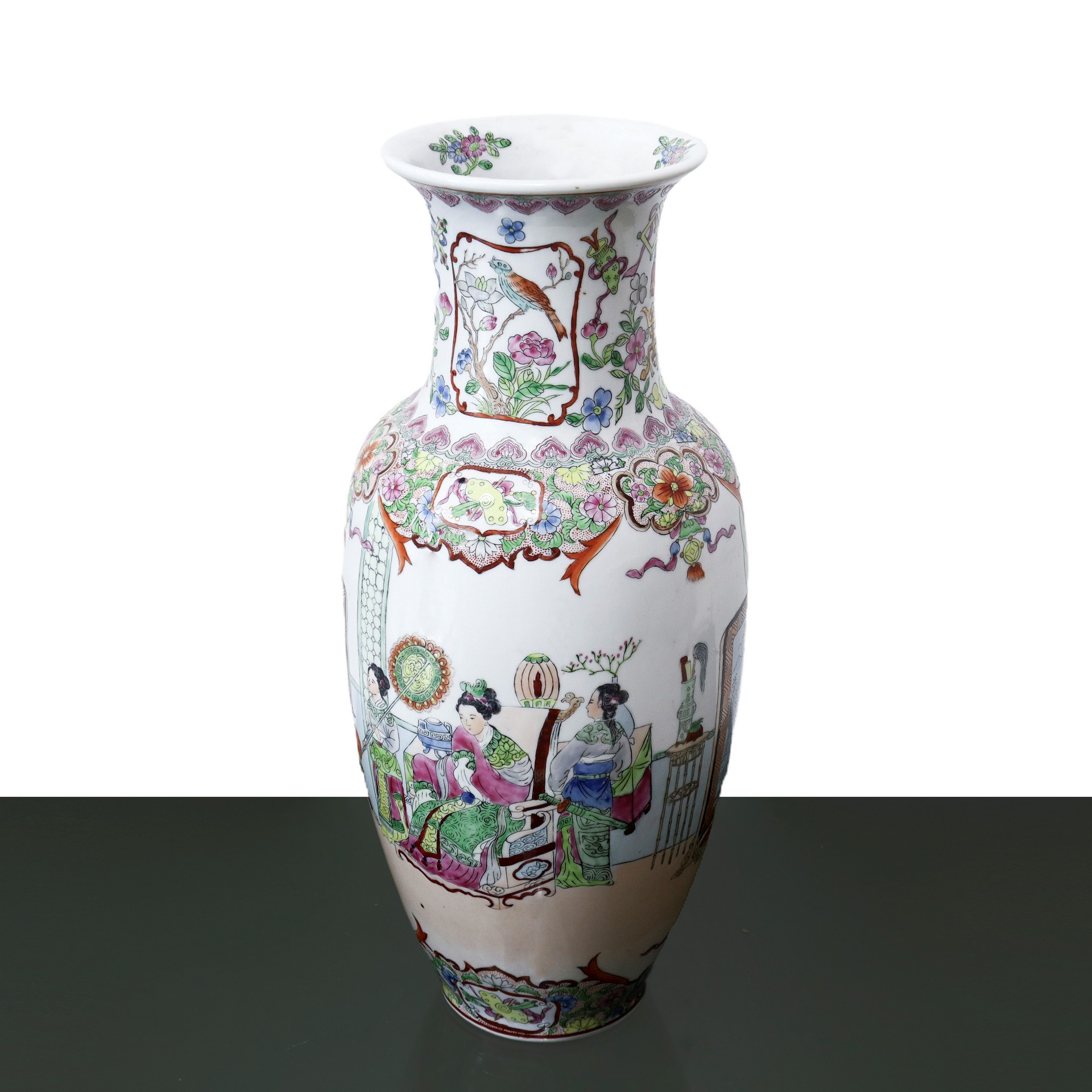 Vaso cinese in porcellana con scene di vita familiari H cm 41,5x17 Decori floreali al bordo. Marchio alla base.