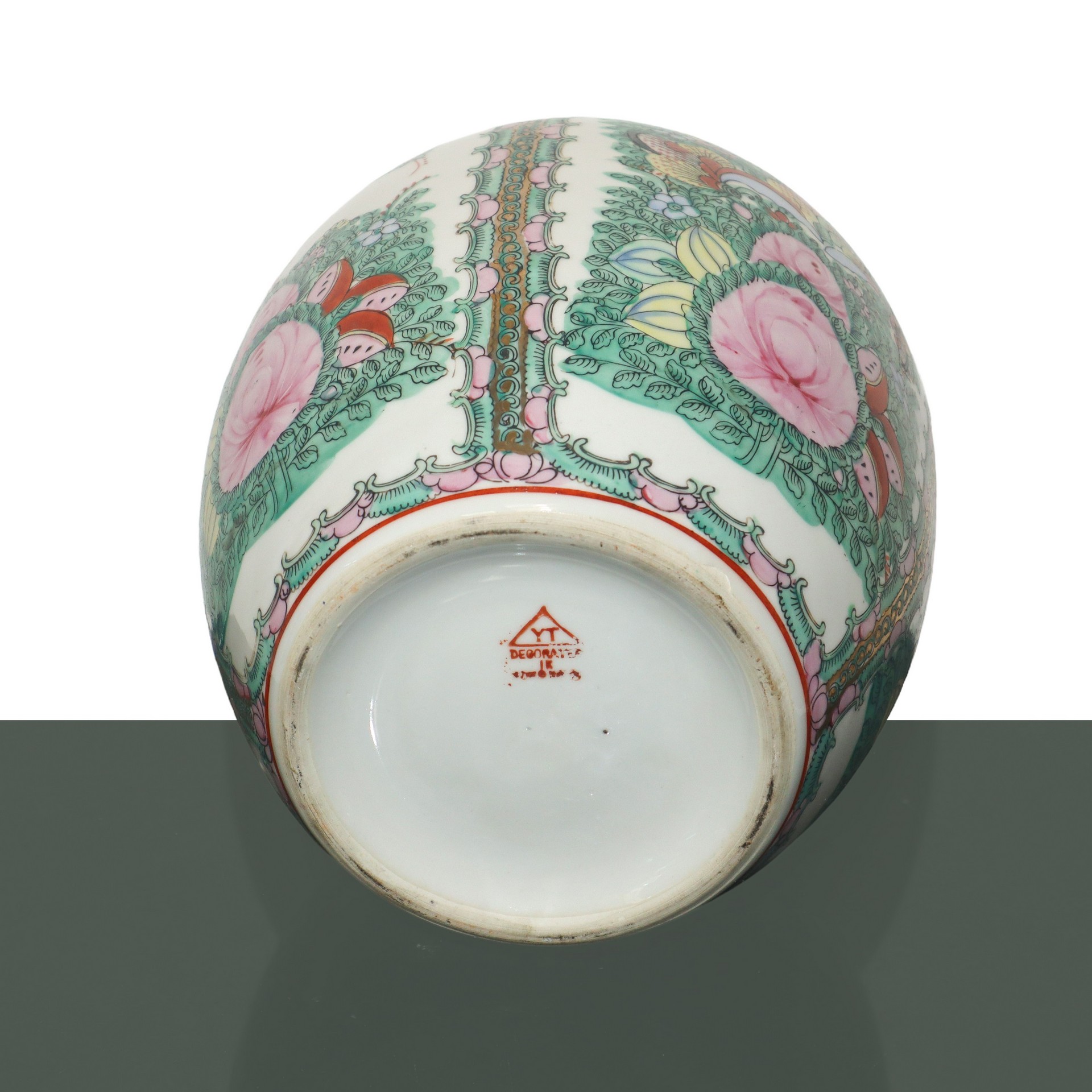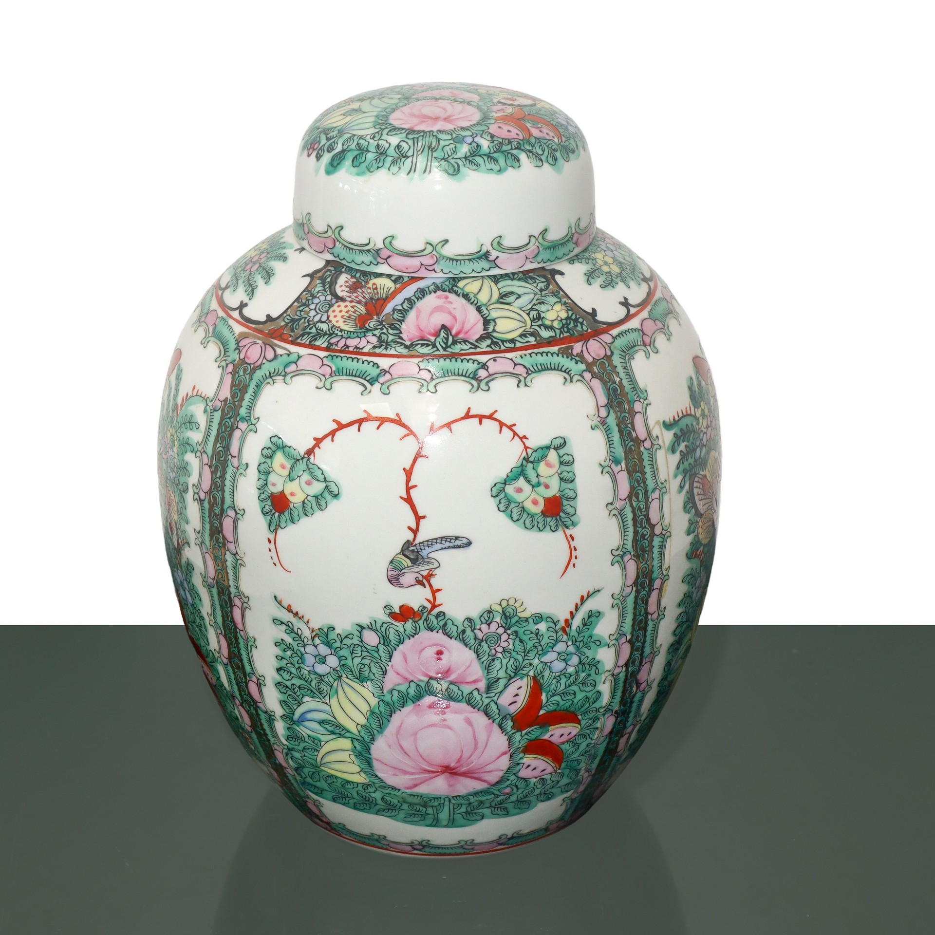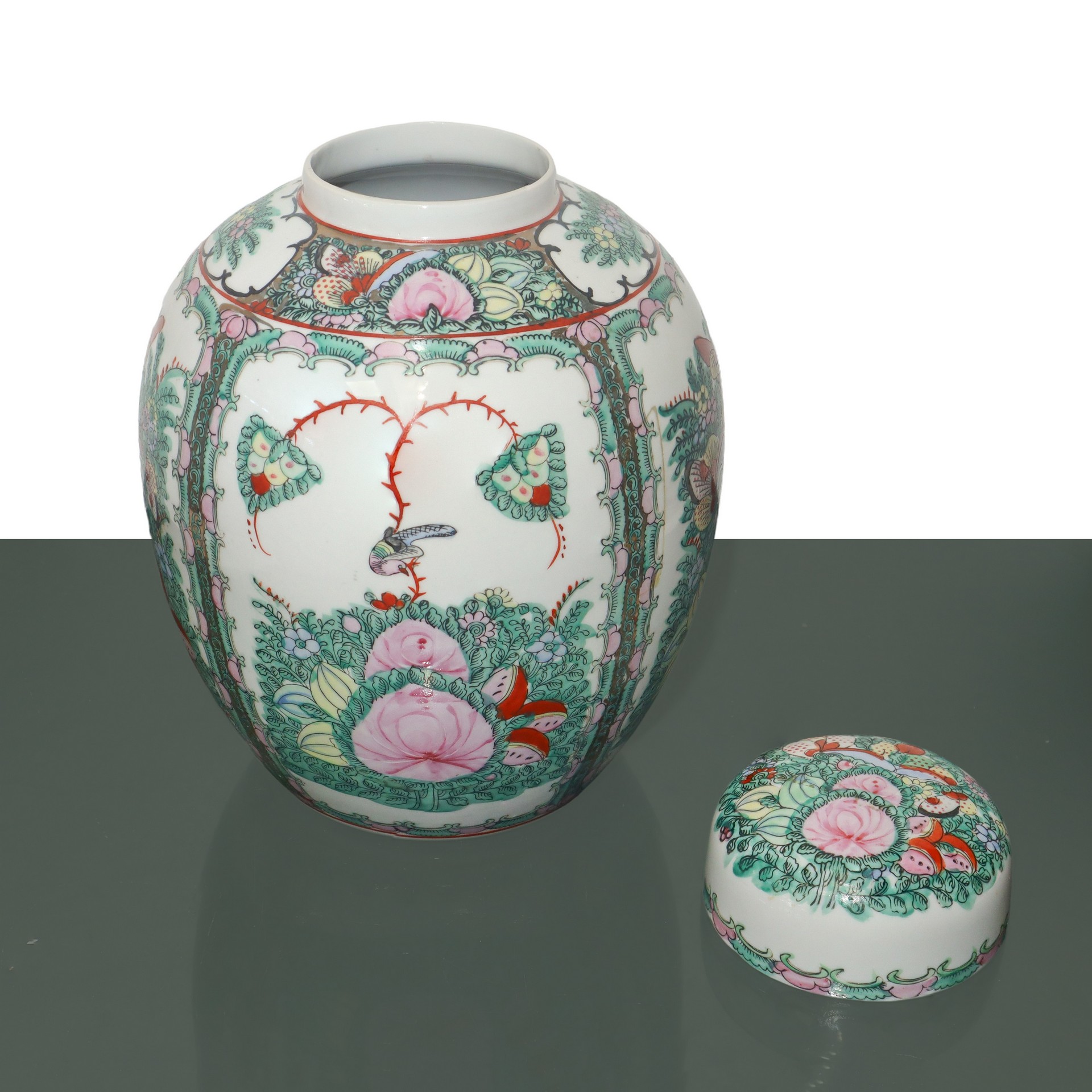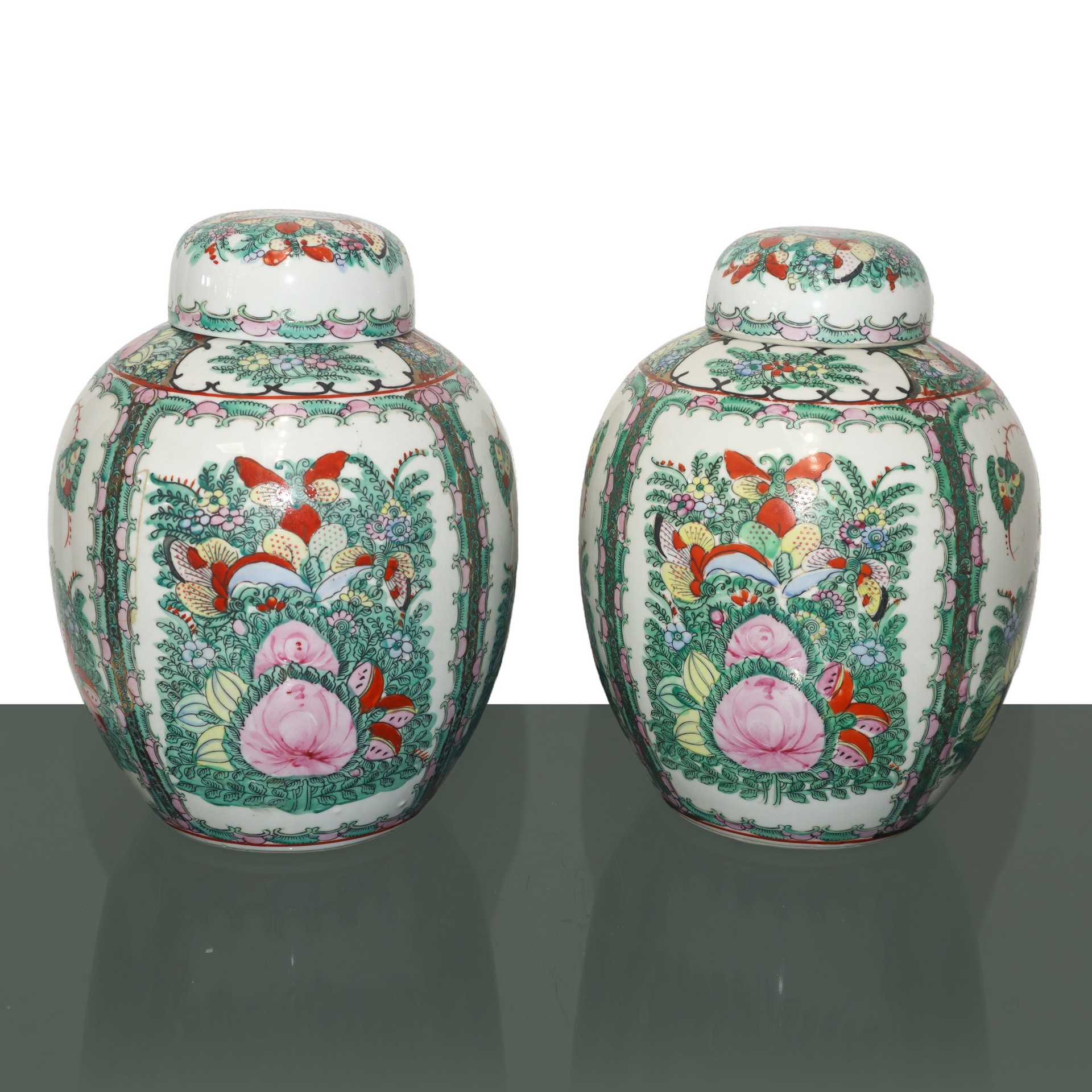Coppia poutiche cinesi cm 29X23 Lievissima sbeccatura all'interno del coperchio di una delle due. Interamente dipinte a mano con motivi orientali. marchio alla base.