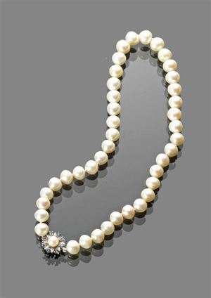 COLLANA DI PERLE Collana di perle leggermente baroccate di diametro 10 mm con fermaglio in oro bianco con incastonati zaffiri di taglio rotondo baroque style 10 mm pear necklace with white gold clasp and round sapphires.