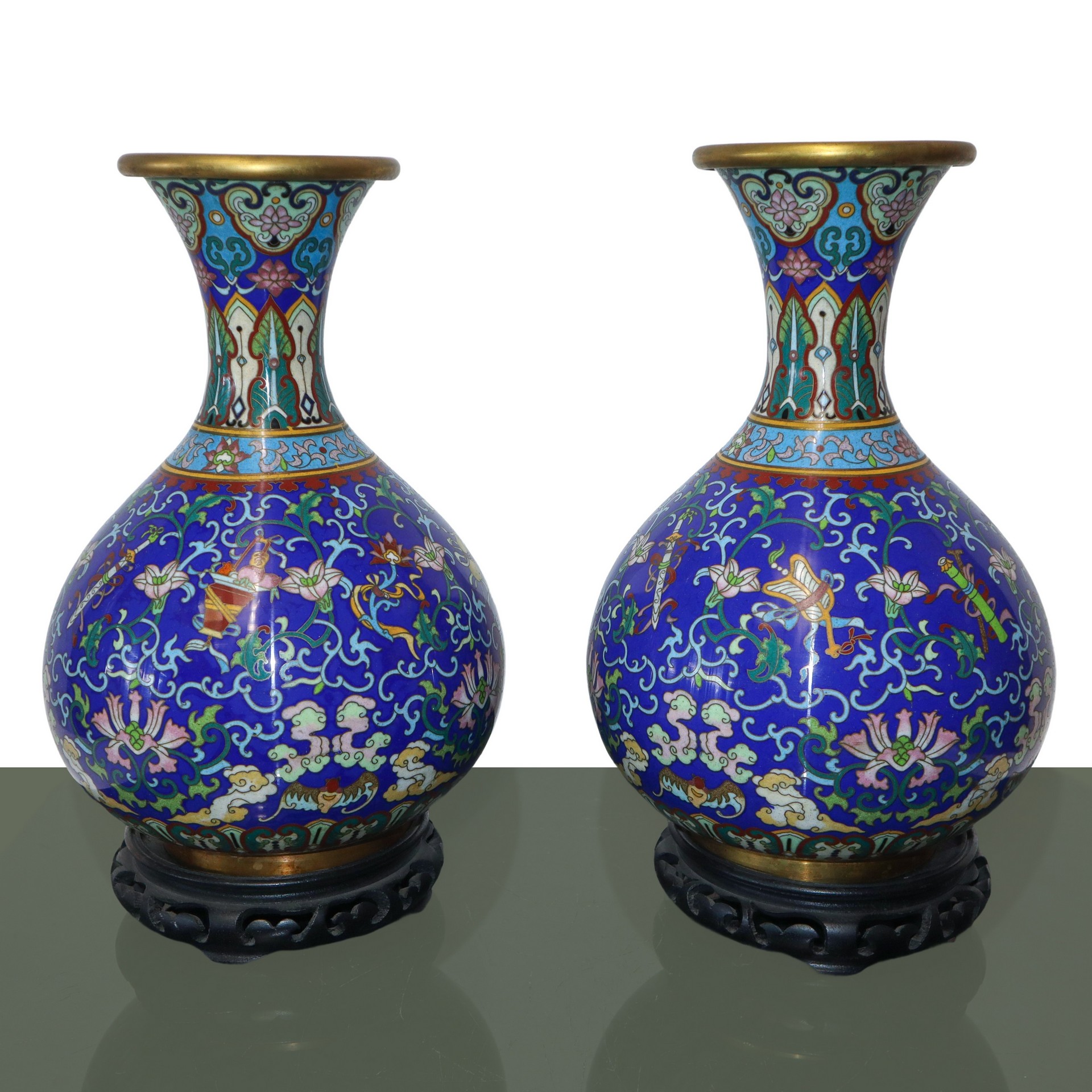 Coppia di vasi cinesi in metallo cloisonnet, Inizi 20° secolo h ( con base) 34 Marchio alla base