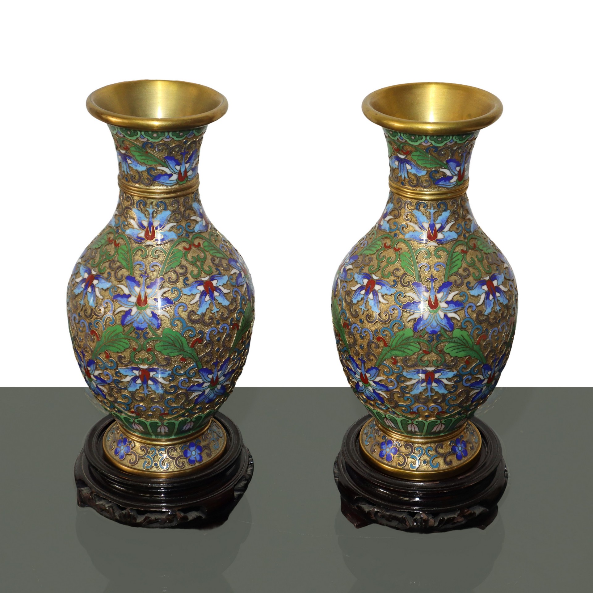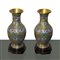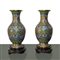 Coppia di vasi in metallo con smalti cloisonnet blu e bianchi