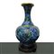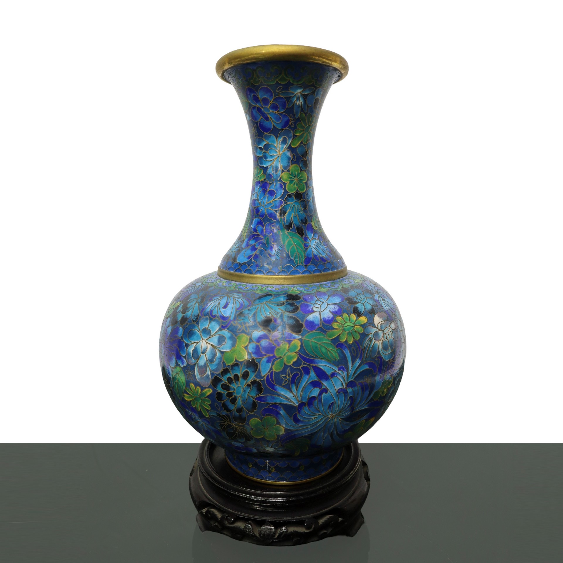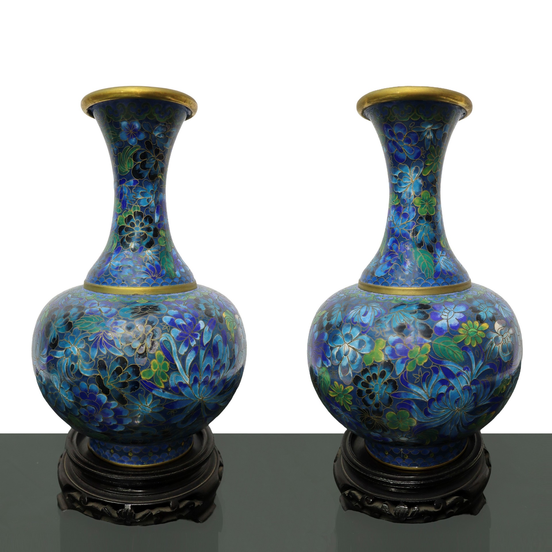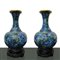 Coppia di vasi cloisonnet cinesi H cm 25,5x15 Fiori azzurri e blu con foglie, decori in dorato. Etichetta alla base
