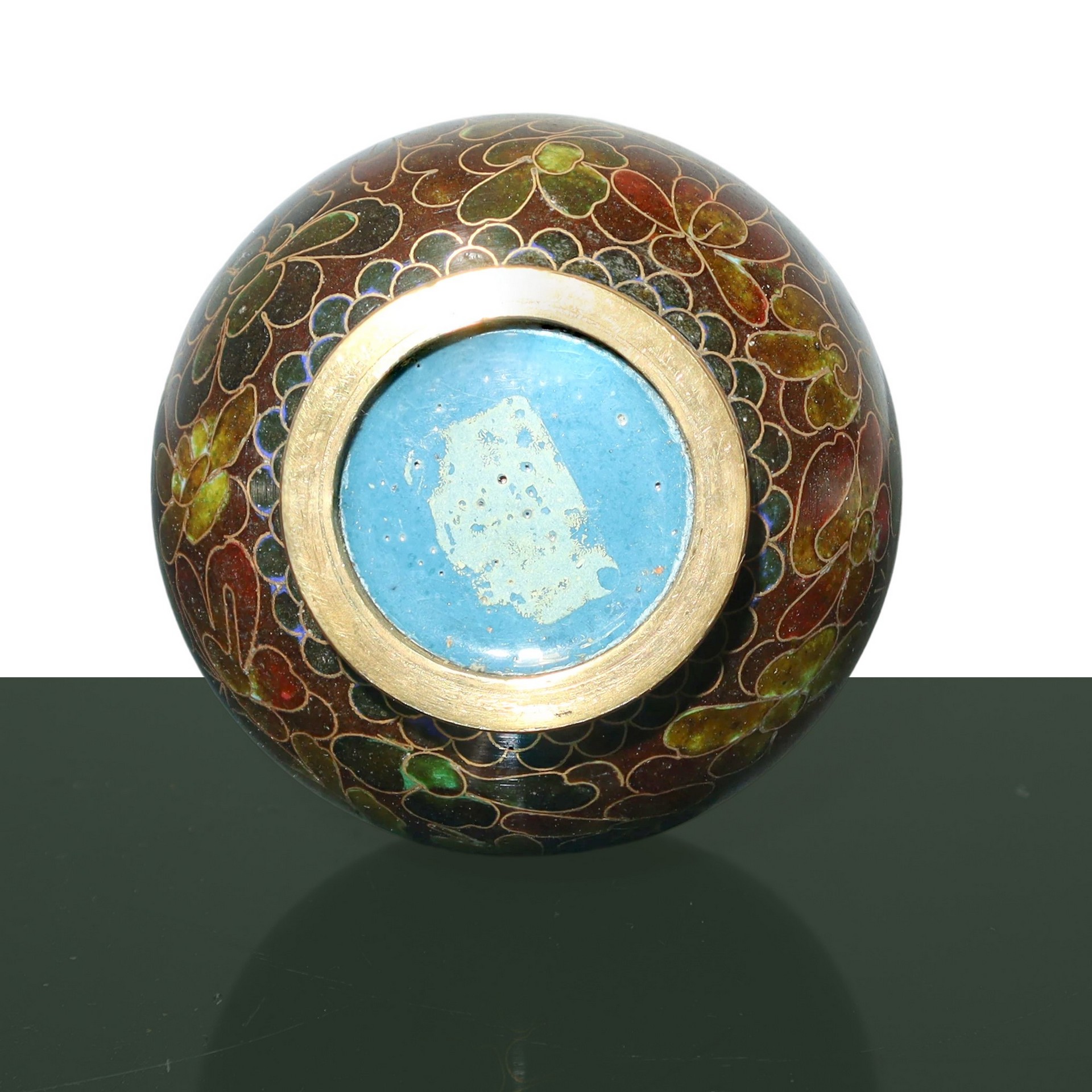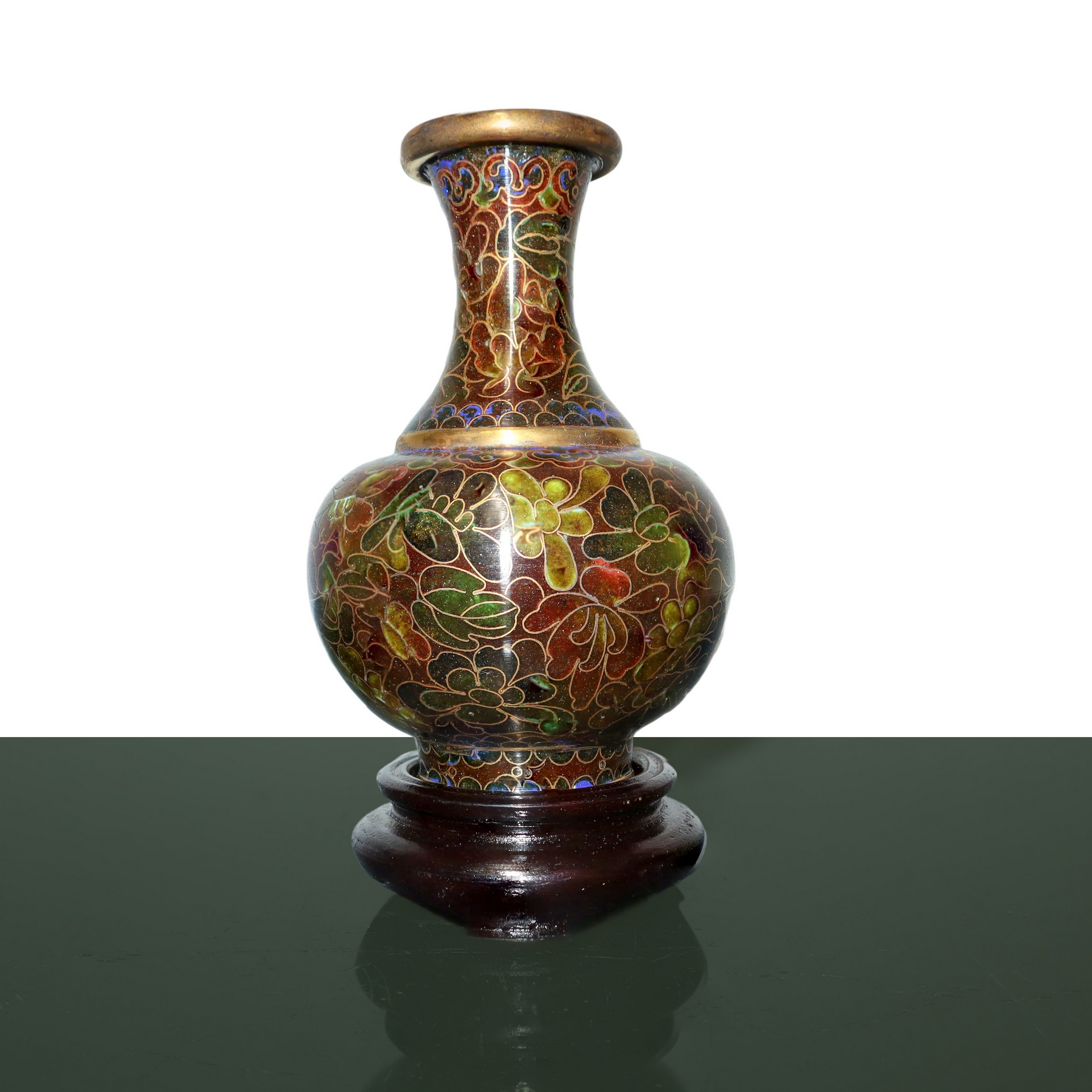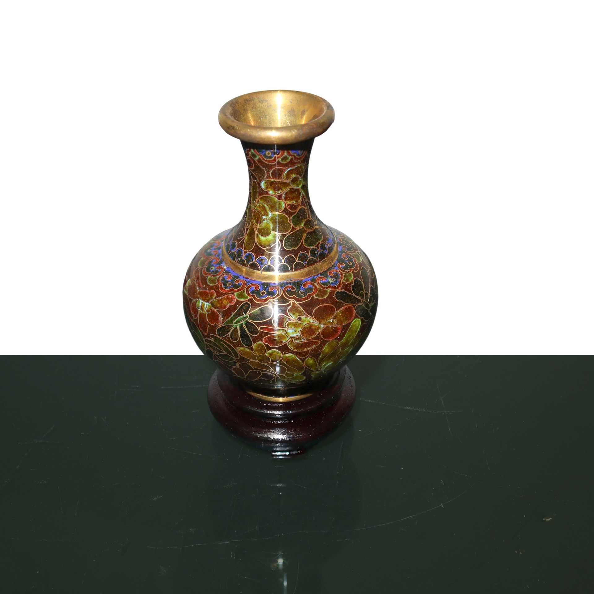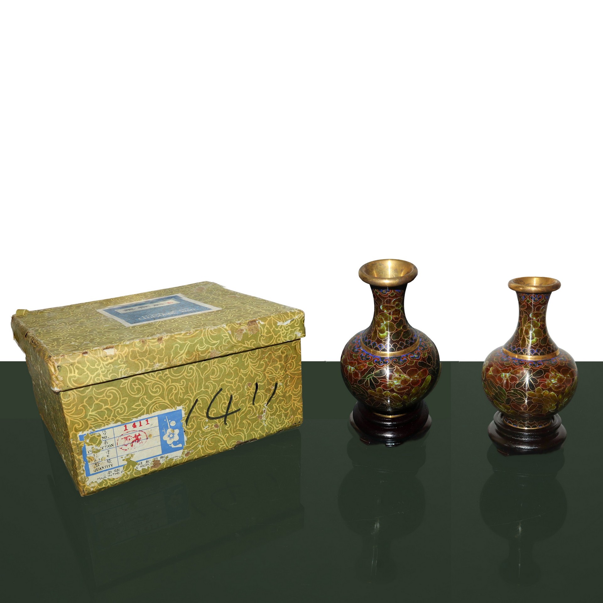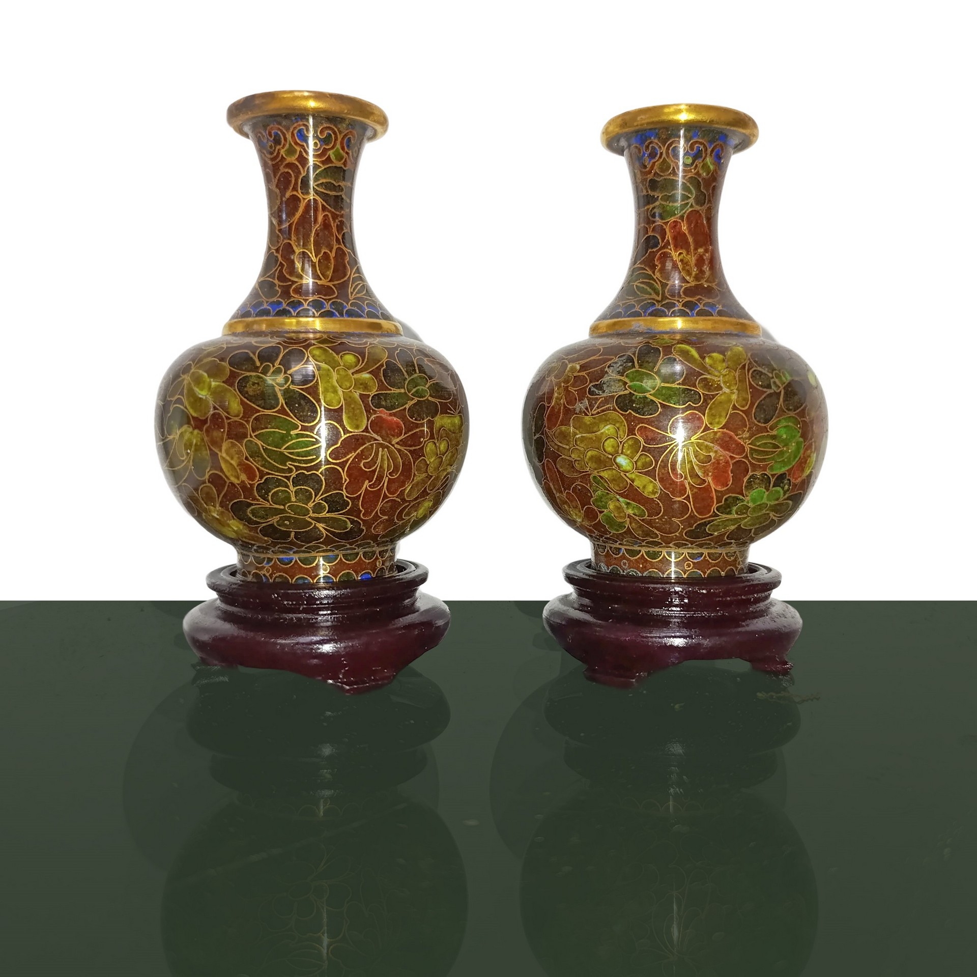 Coppia di vasi cloisonnet nei toni del marrone con base in legno h cm 11 (senza base) h cm 13,5 (con base) cadauno All'interno della scatola originale