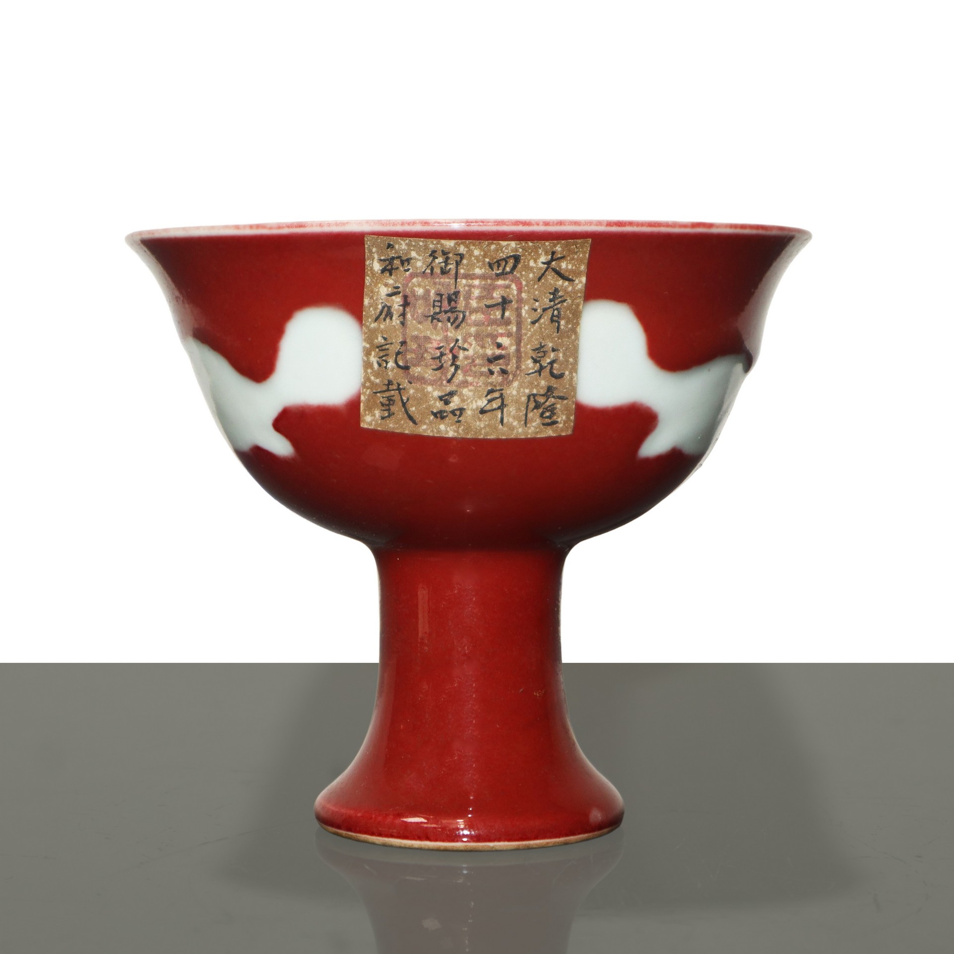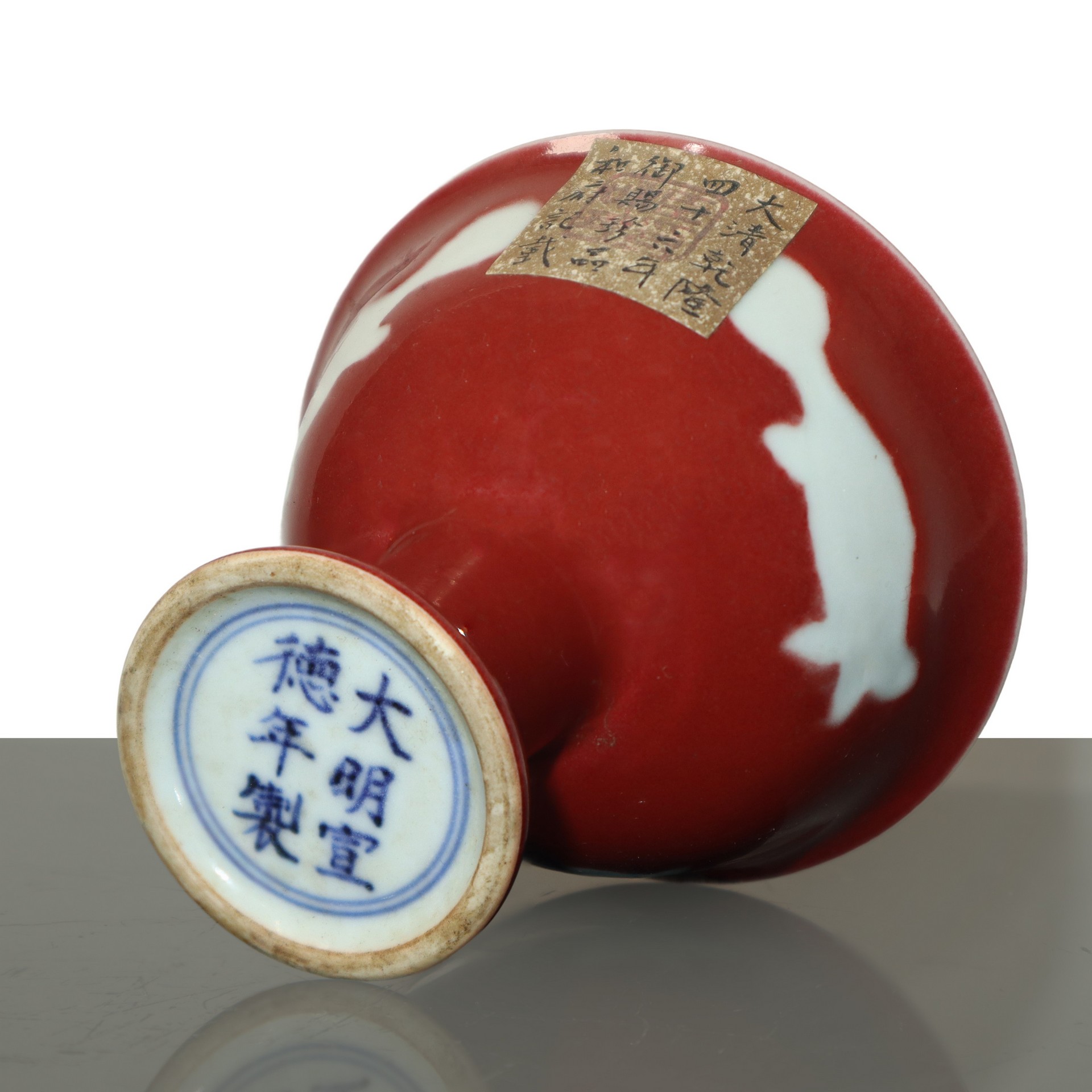 Piccola coppa cinese smaltata in rosso con decori bianchi, Ming Dynasty h cm 9x10 Adesivo con iscrizione sul lato esterno.