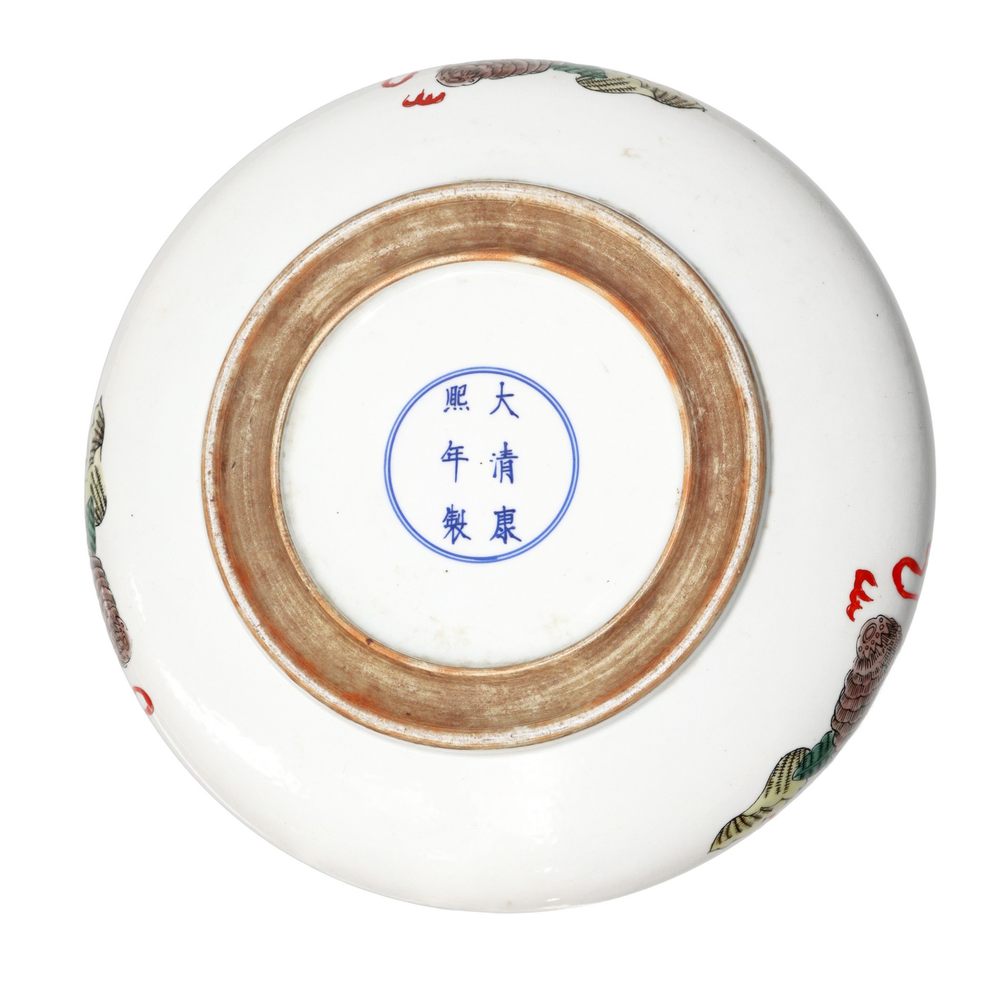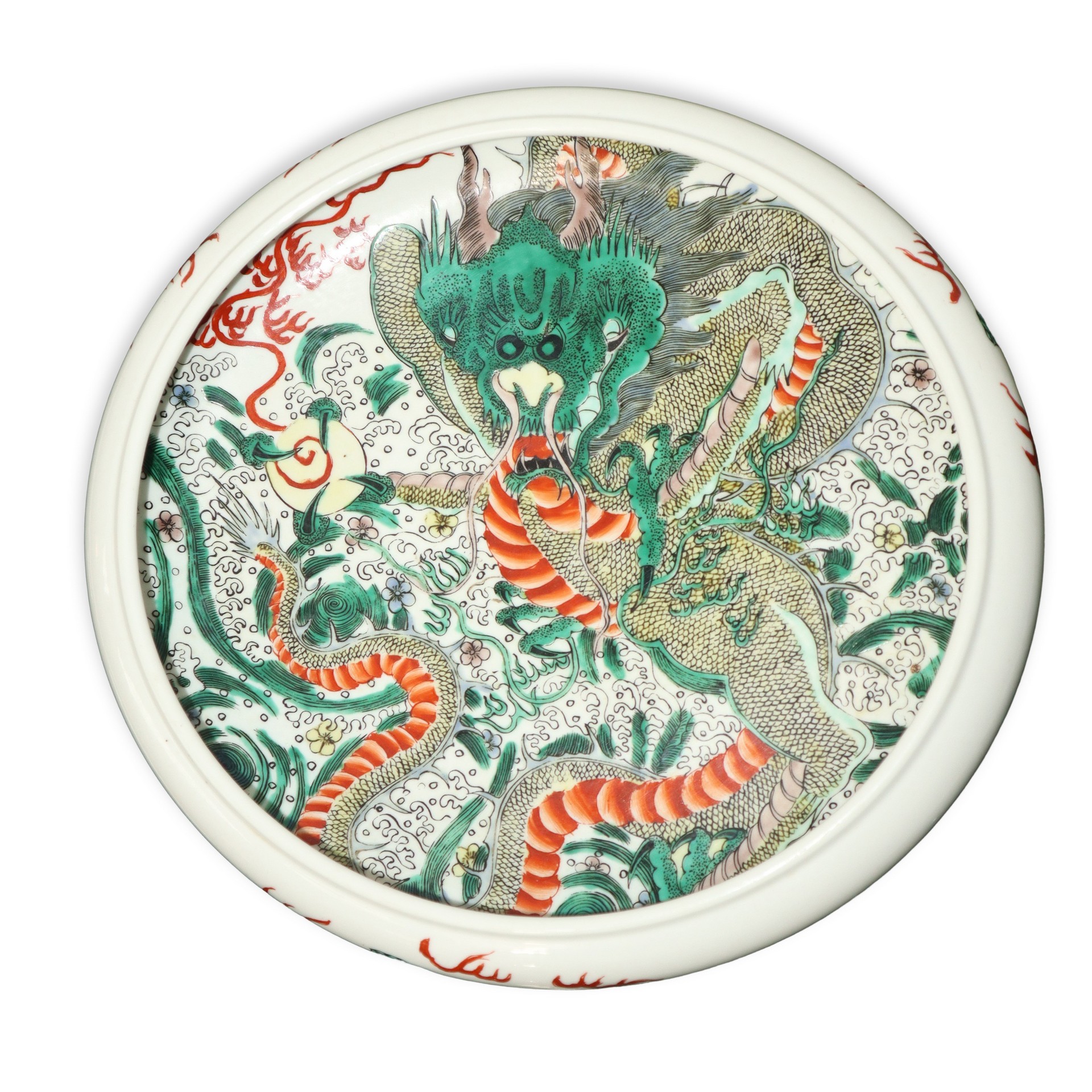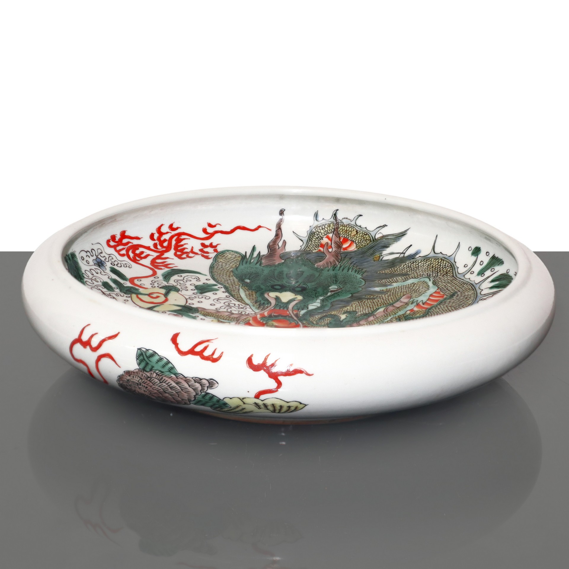 Grande lavapennelli con dragone verde e decori vegetali h 7cm diam. 28,5 Iscrizione alla base.
