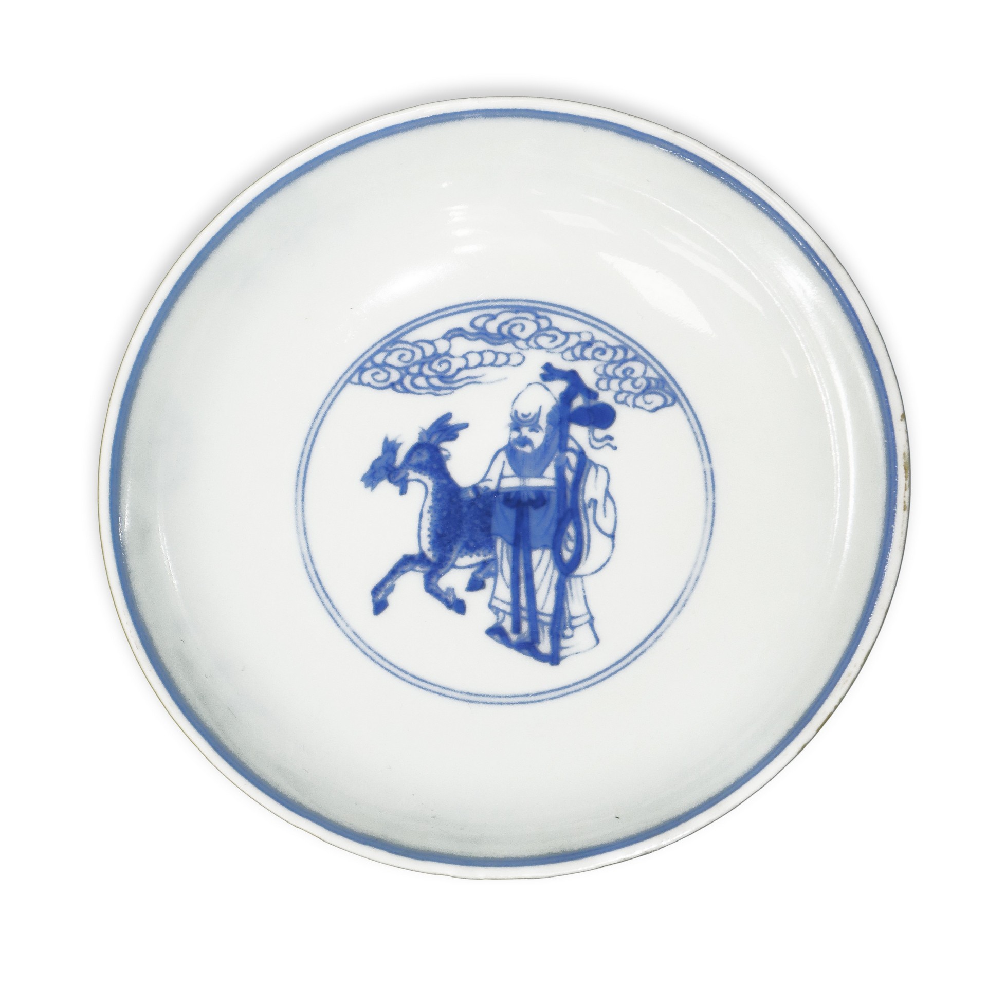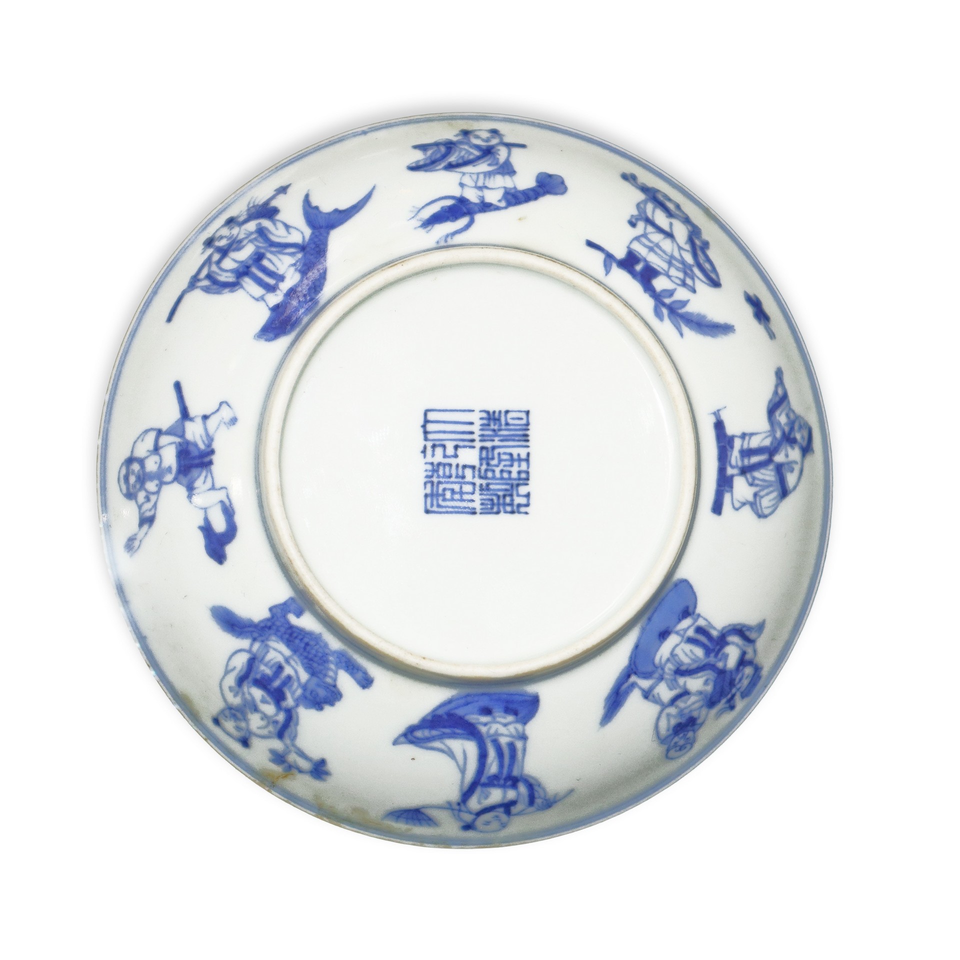 Piattino in porcellana cinese blu e bianca con varie figurazioni tradizionali diam. 11cm Iscrizione sul fondo.