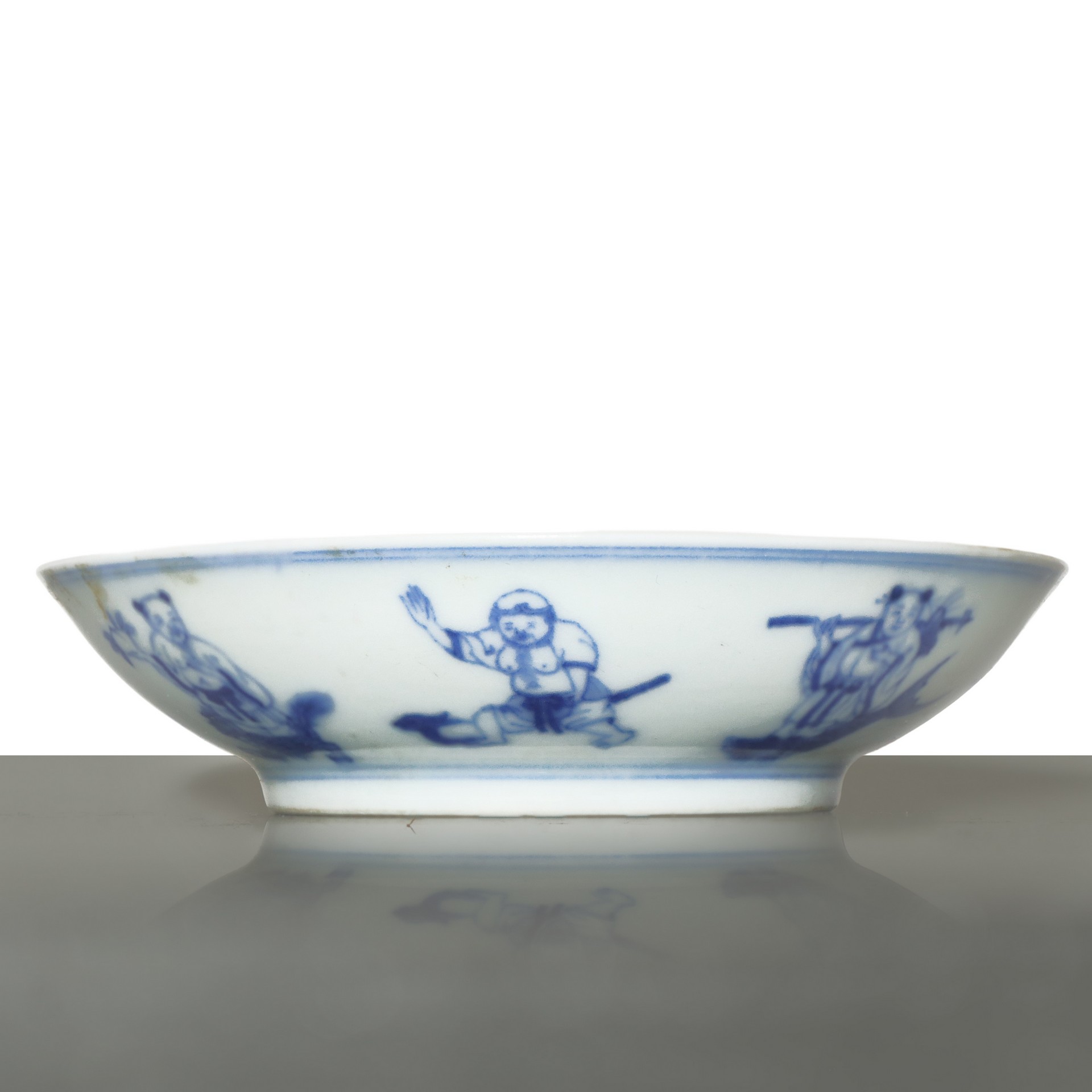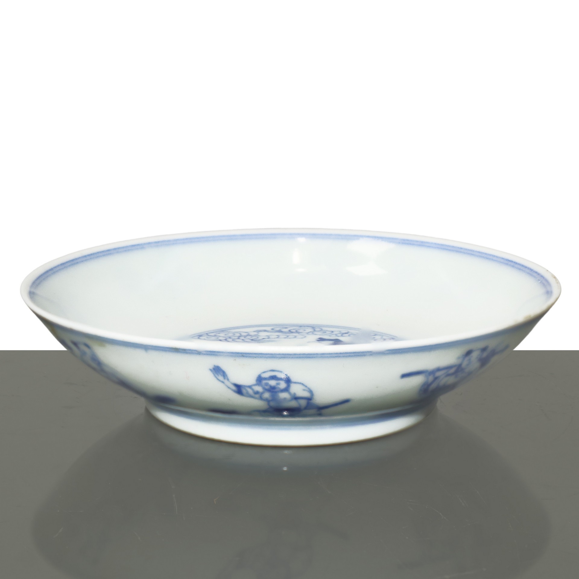 Piattino in porcellana cinese blu e bianca con varie figurazioni tradizionali
