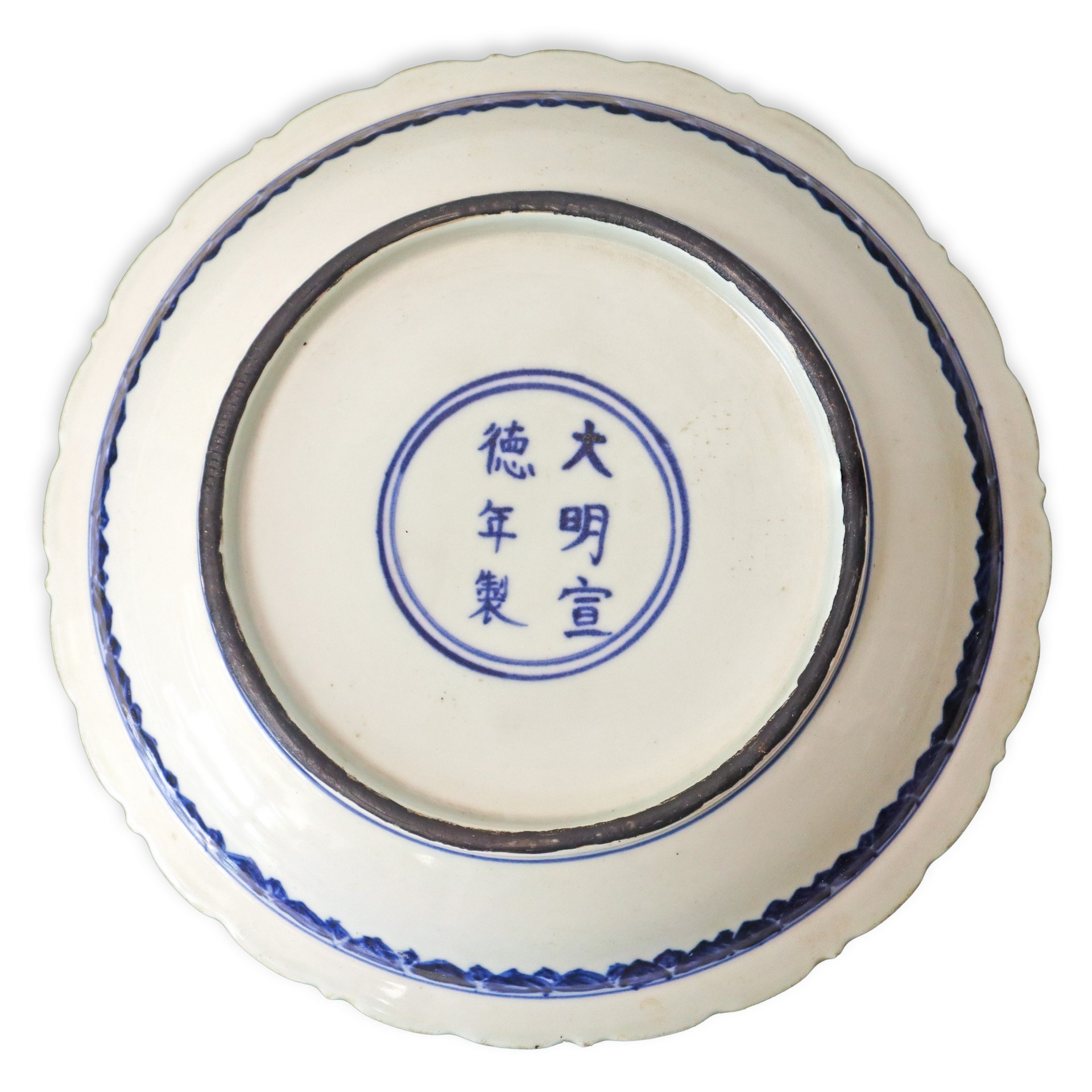 Piatto cinese in porcellana blu e bianca con raffigurazione vegetale, Ming Dynasty diam. 22 cm Iscrizione alla base del piatto.