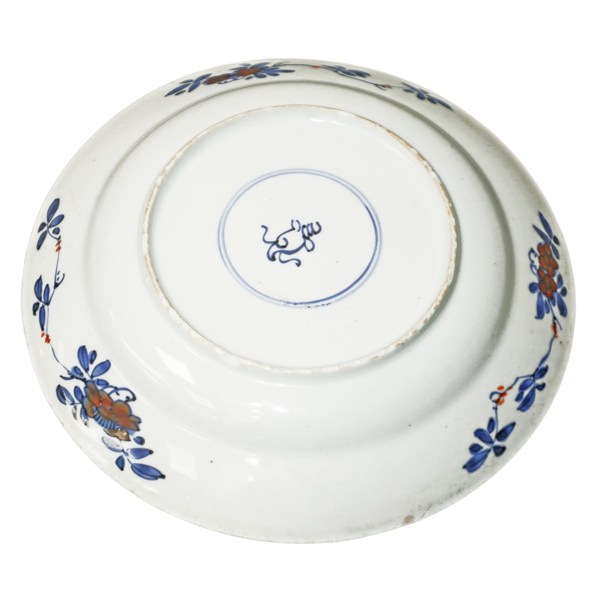Piatto cinese con decorazioni floreali blu e rosse, Qing Dynasty Kangxi period diam. 21cm Iscrizione sul fondo.