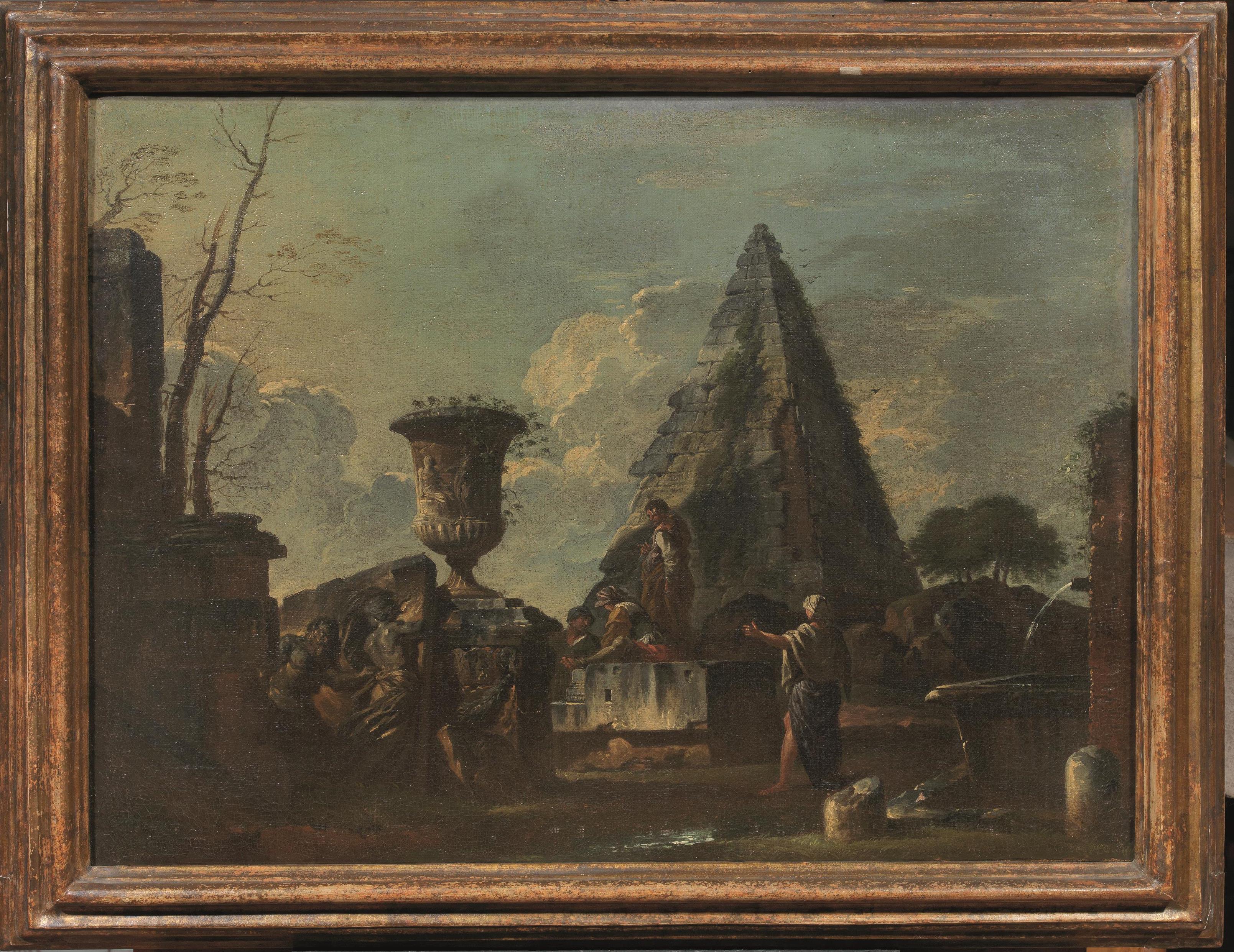 Più volte pubblicato da Andrea Busiri Vici come opera di Giovanni Ghisolfi, il dipinto qui offerto é stato invece riferito da Ferdinando Arisi ai primi anni romani di Giovanni Paolo Panini sulla base di un’incisione settecentesca (nota peraltro anche a Busiri Vici) che ne riproduce la composizione sotto il nome del pittore piacentino. Lo stesso gruppo di personaggi compare poi nel capriccio di rovine del Musèe de la Chartreuse di Douai (F. Arisi 1986, cit. p. 239, n. 46) che ripete il nostro con la sola sostituzione del tempio di Saturno alla piramide Cestia.