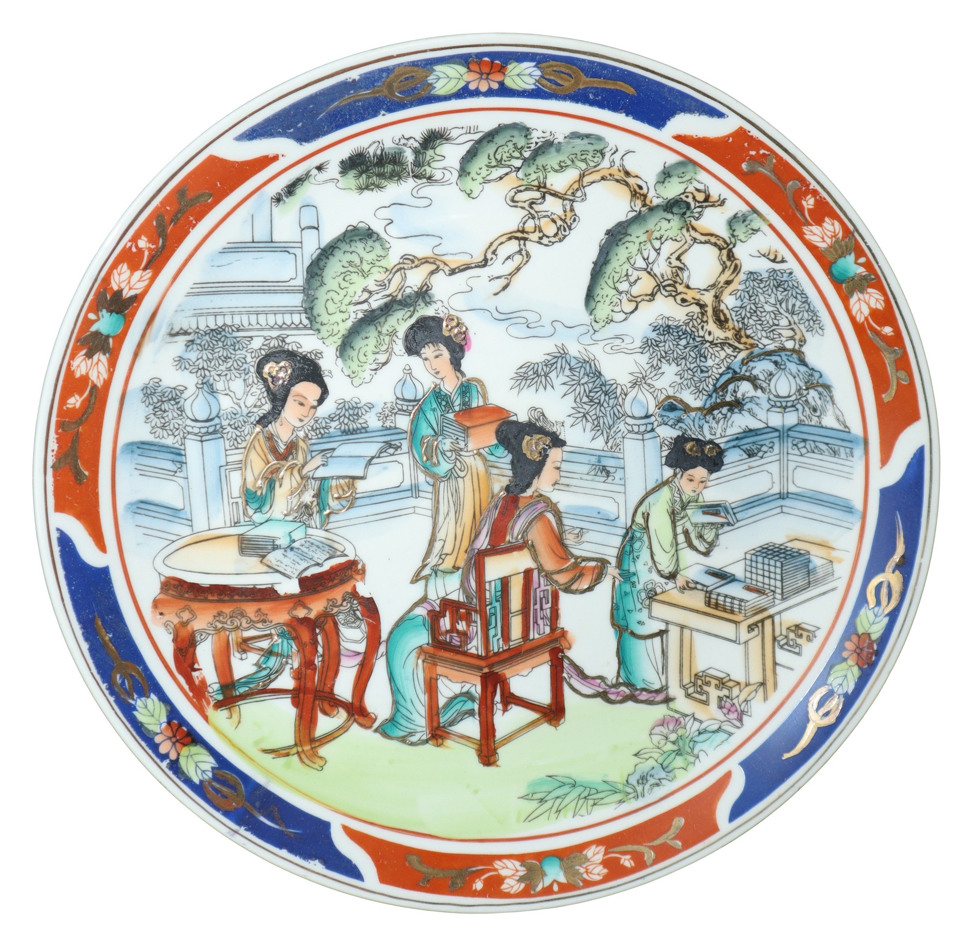 Piatto cinese in porcellana dipinta a mano con scene di studio diametro cm 26