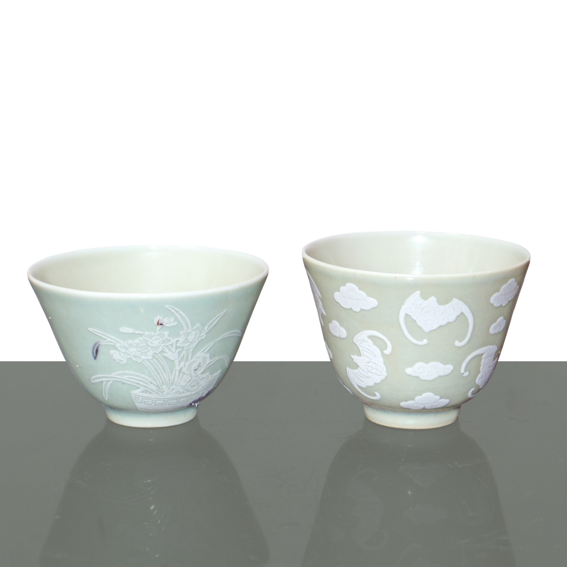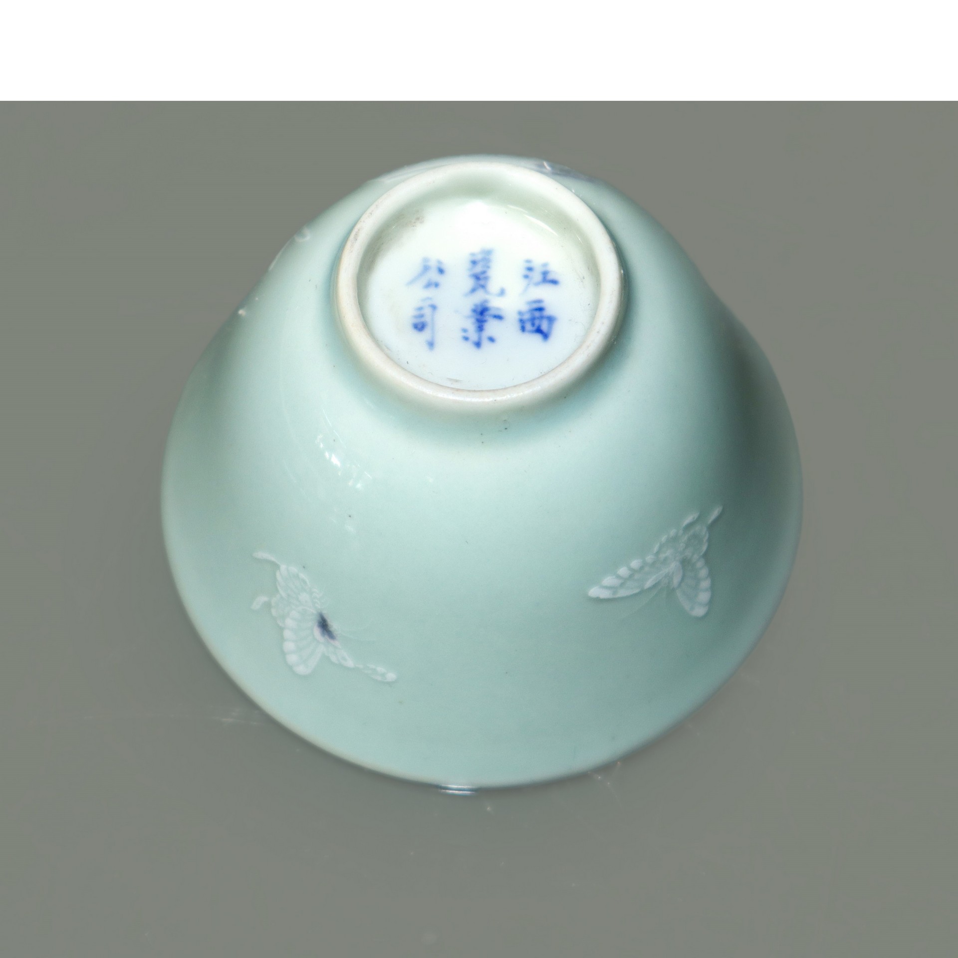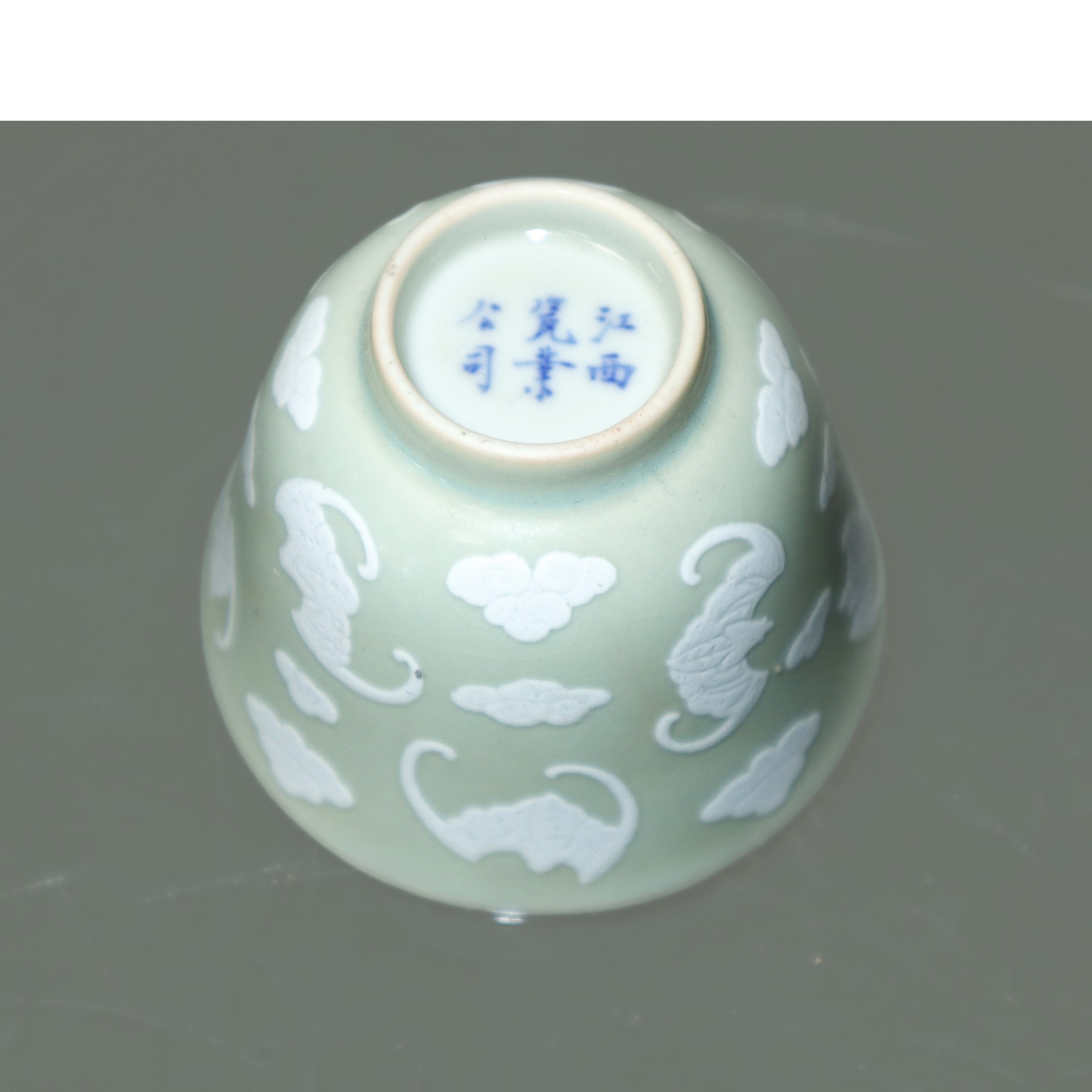 Coppia di tazze in porcellana verde con decori a rilievo h cm 5X7 Iscrizioni sul fondo