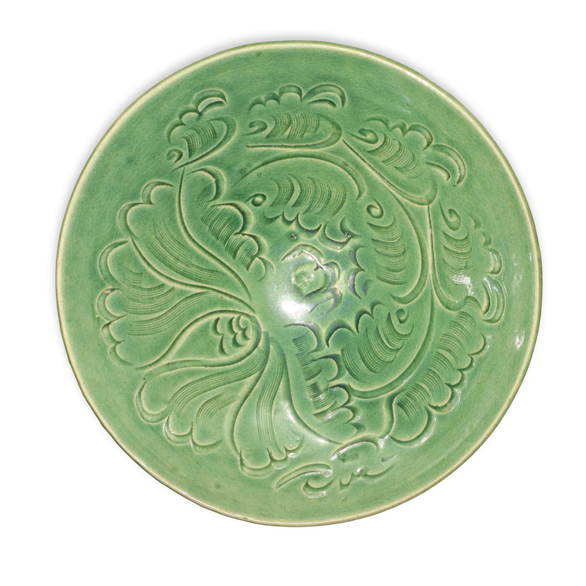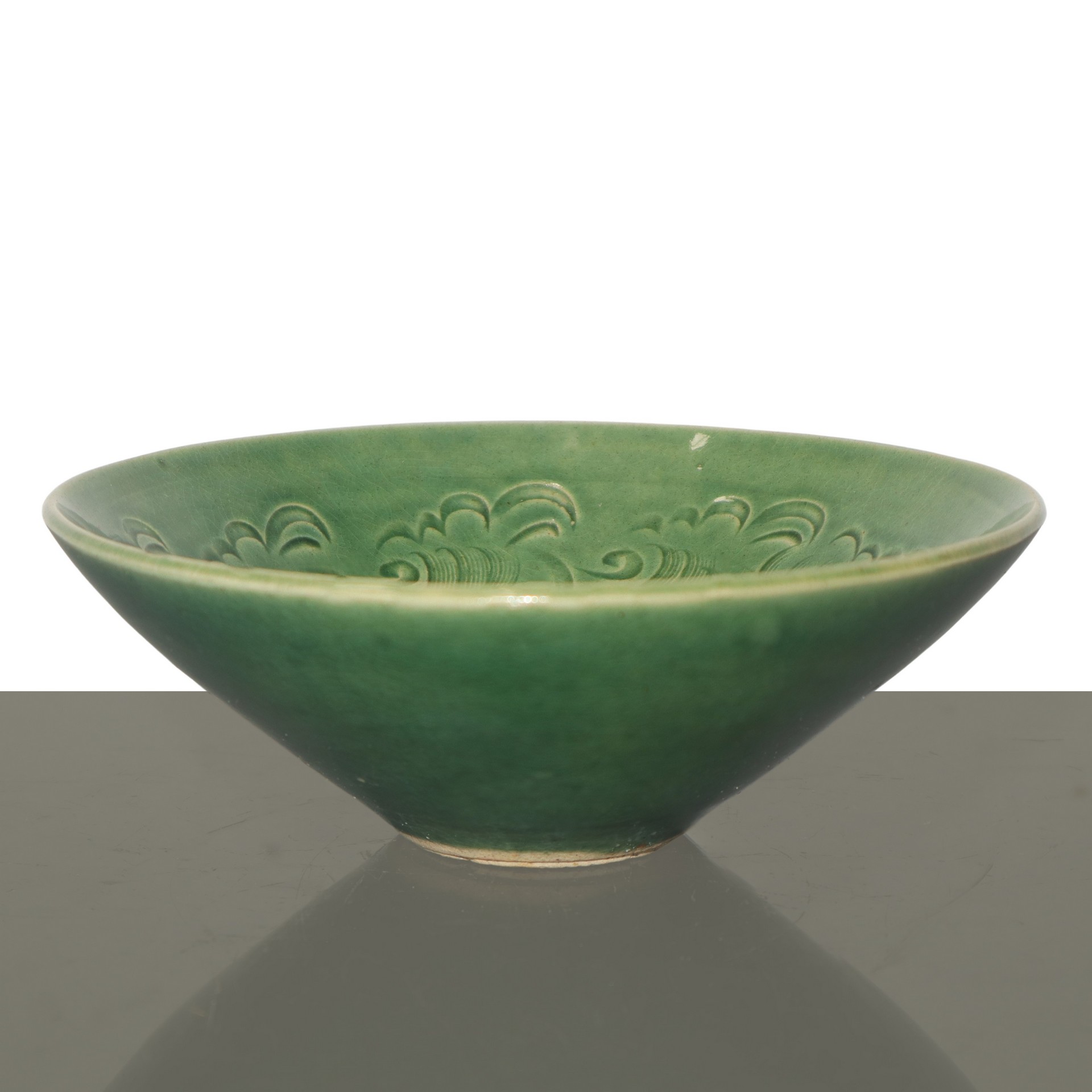 Coppia di ciotole in ceramica celadon color verde giada con decorazione floreale, Qing Dynasty h 5,5cm diam. 15,7cm