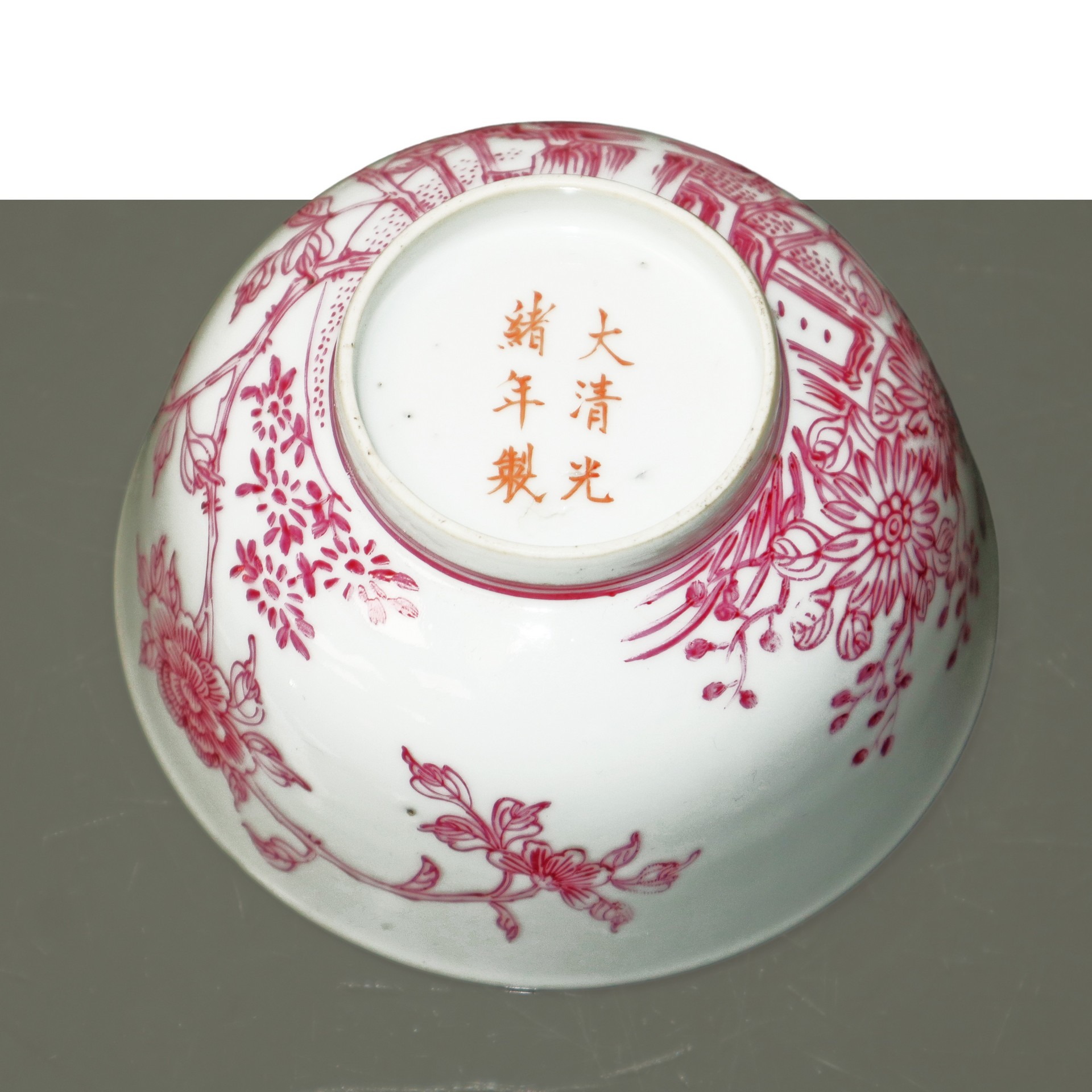 Ciotola in porcellana cinese con decorazioni floreali color magenta, Qing Dynasty 19° secolo h 5,8cm diam. 11,5cm Iscrizione Da Qing Quangxu Nian Zhi alla base.