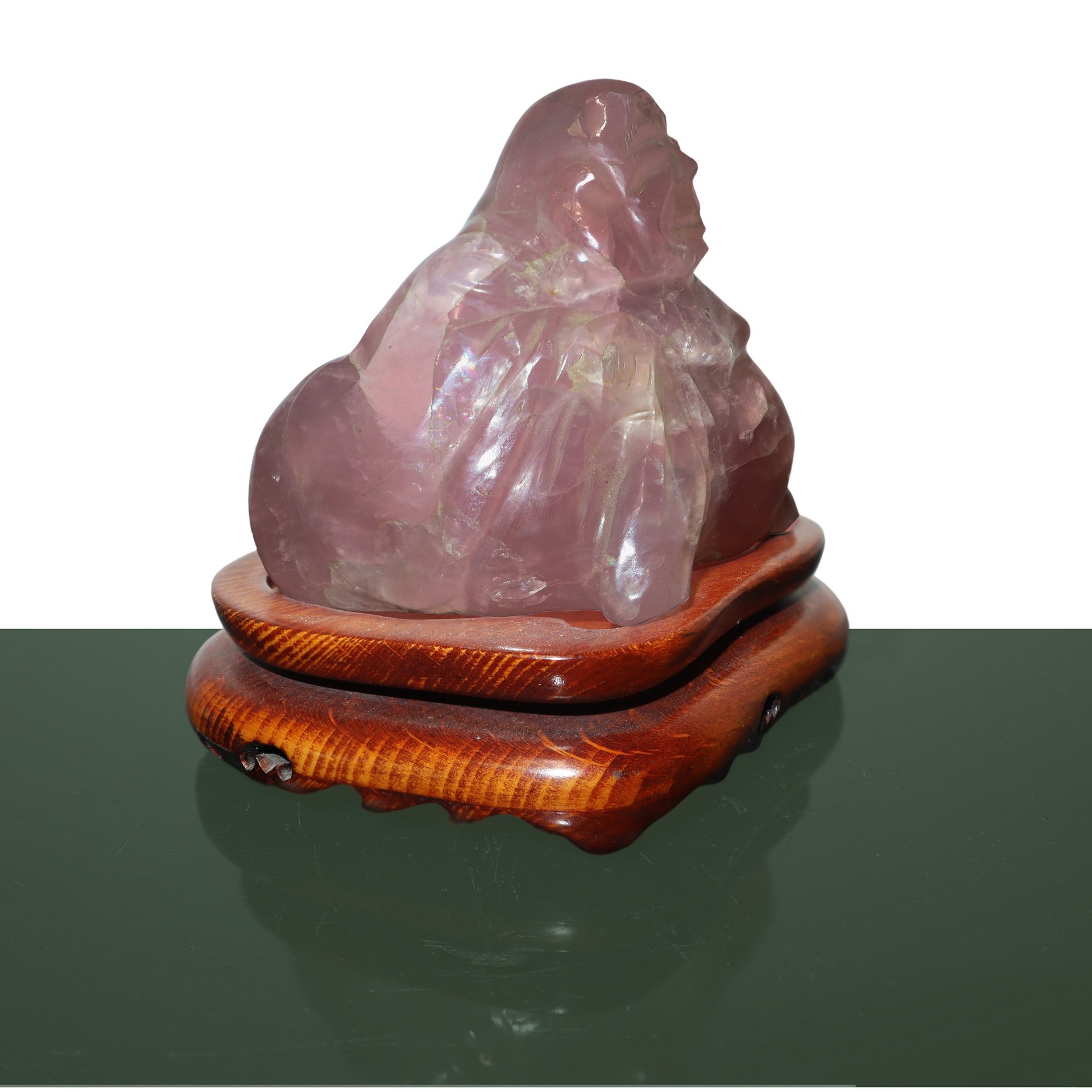 Buddha in quarzo rosa con base in legno h cm 9X12 con base h cm 11X13,5