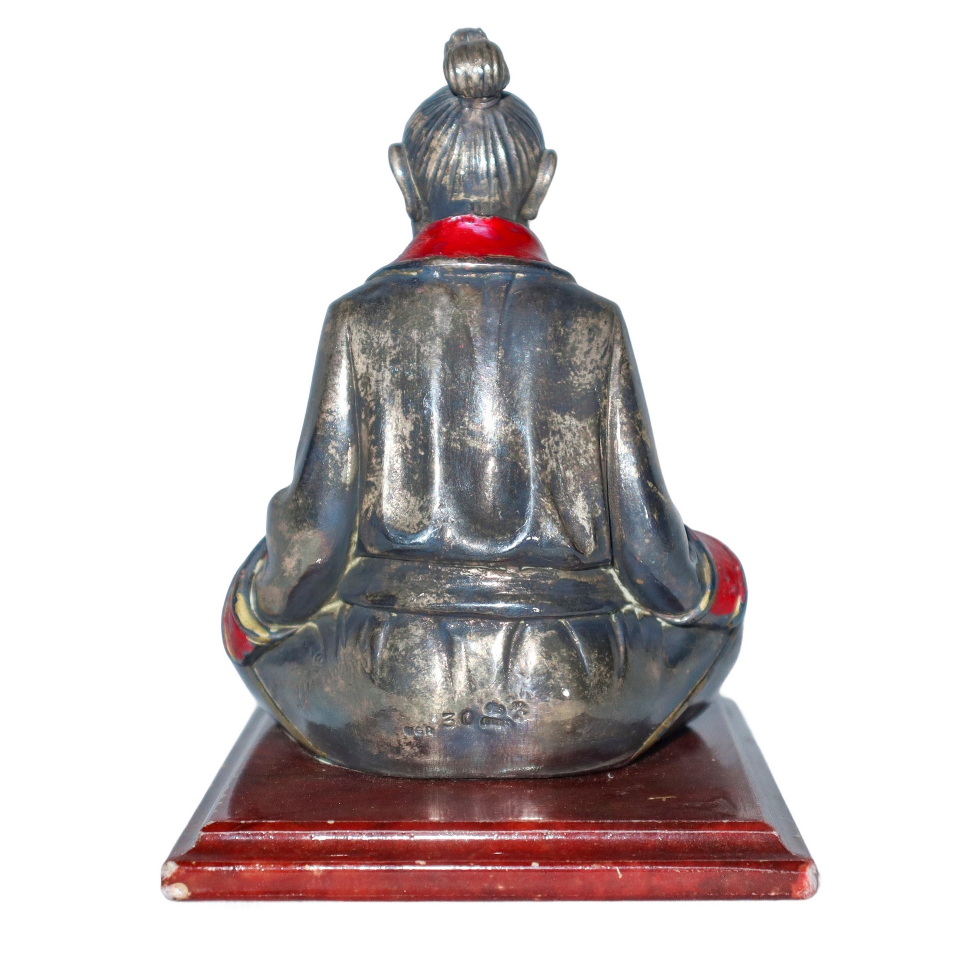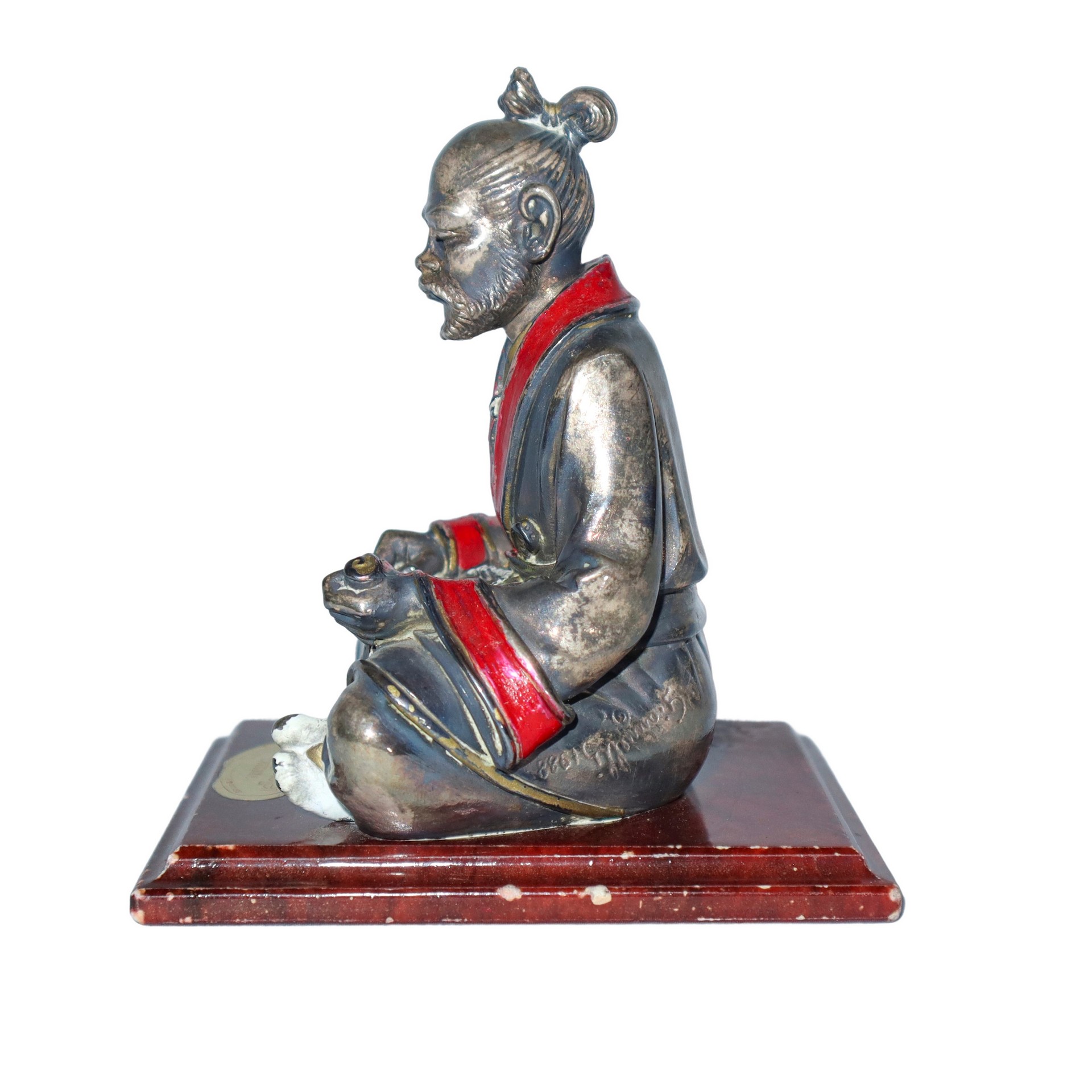 Statuetta di anziano samurai su base in marmo rosso, 20° secolo h cm 12.5x9x11.5 Etichetta Salini Gioielli Catania sulla base