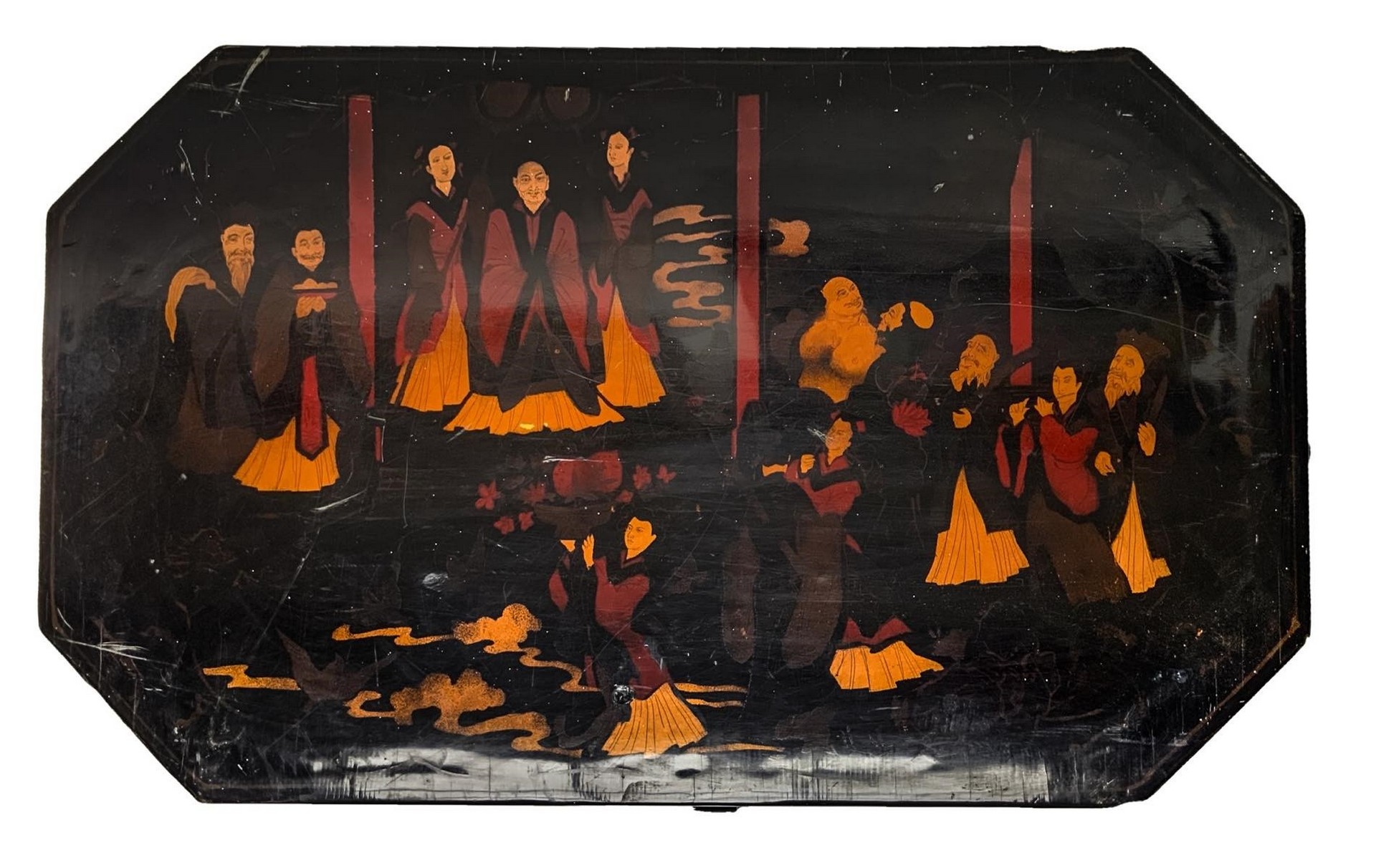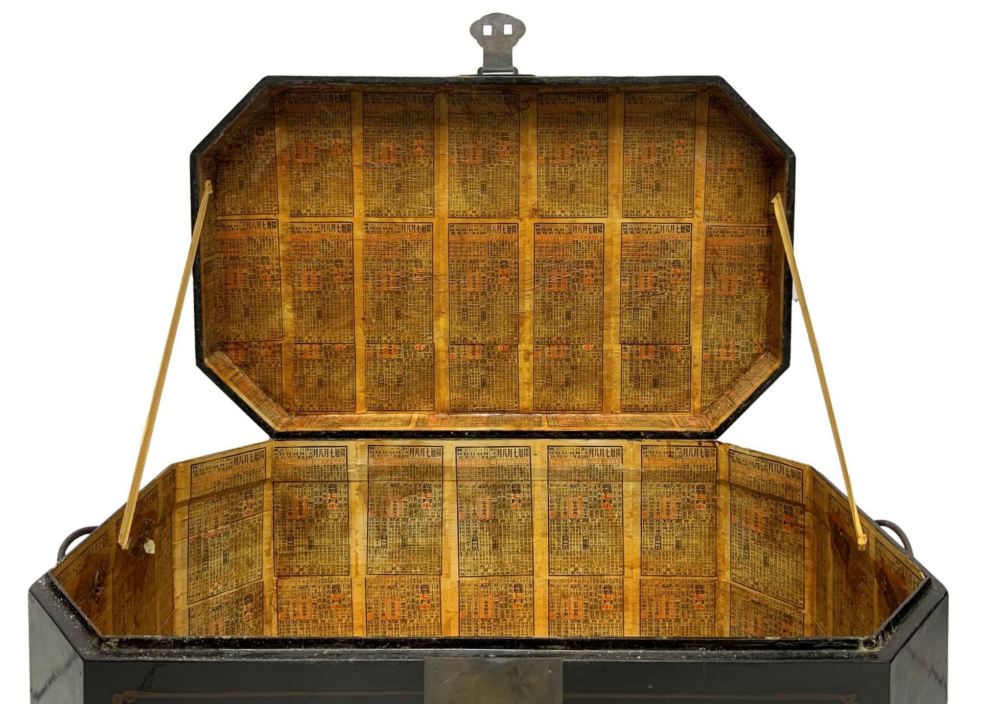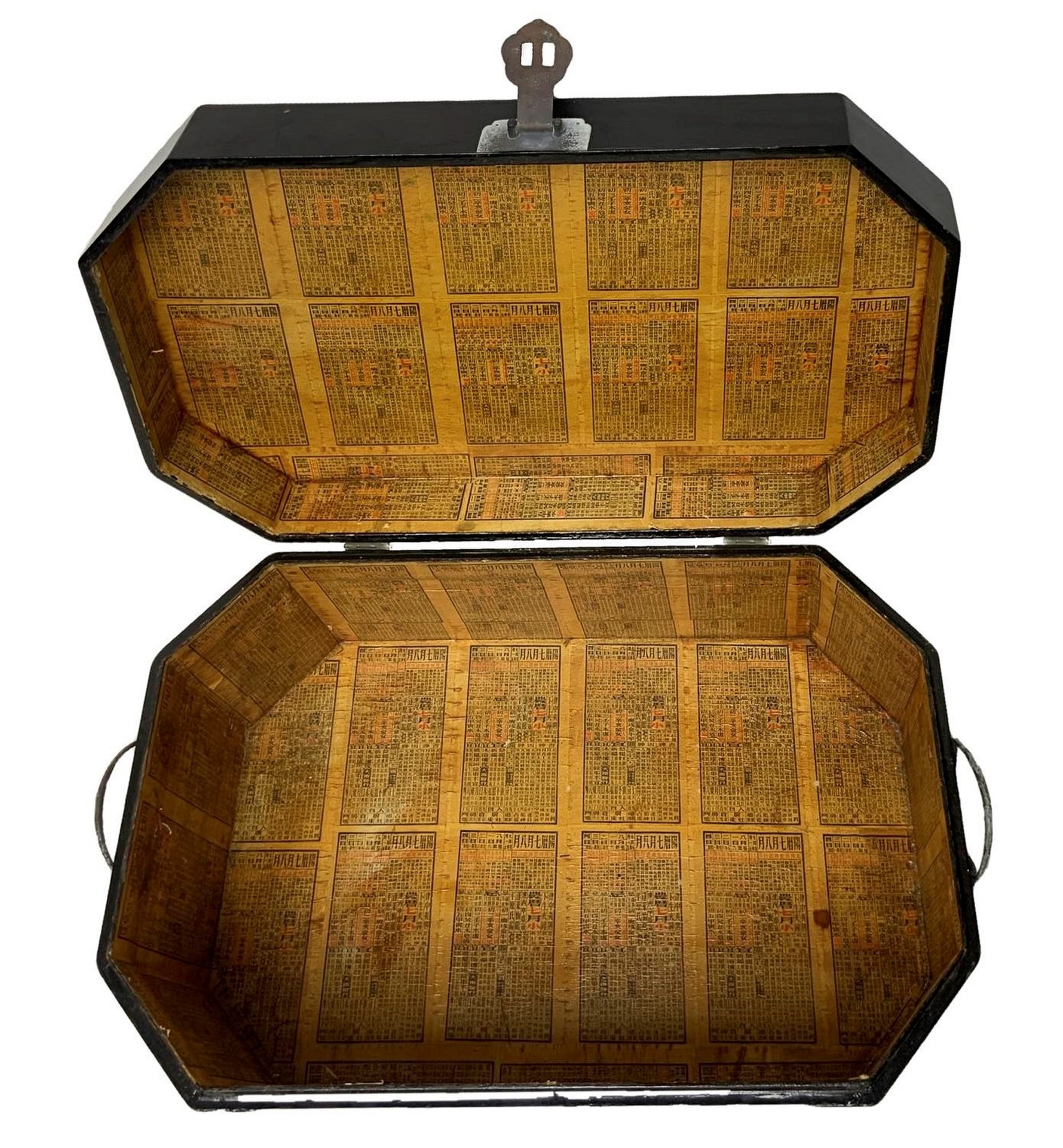 Antico baule cinese da viaggio in legno laccato dipinto a mano sul fronte con decori floreali H cm 46x85x52 sul piano superiore con personaggi cinesi. Maniglie laterali in metallo, rivestito internamente con carte d'epoca.