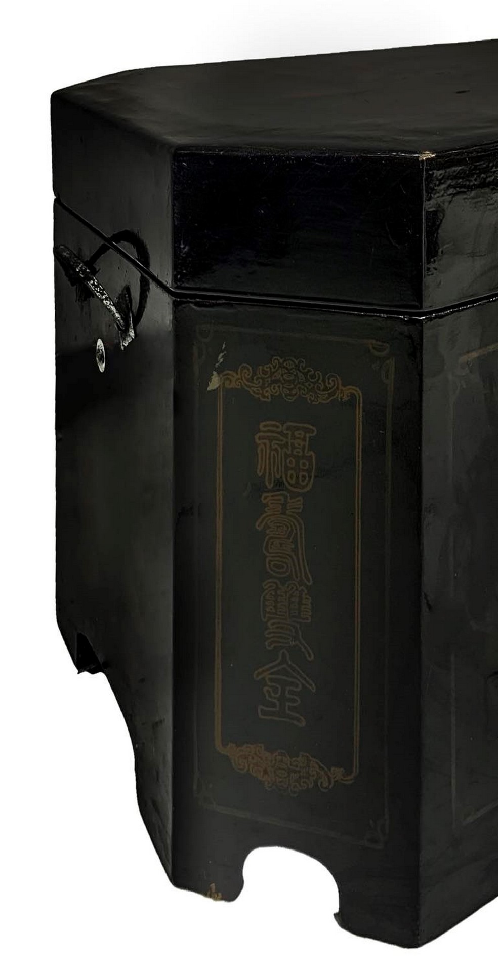 Antico baule cinese da viaggio in legno laccato dipinto a mano sul fronte con decori floreali
