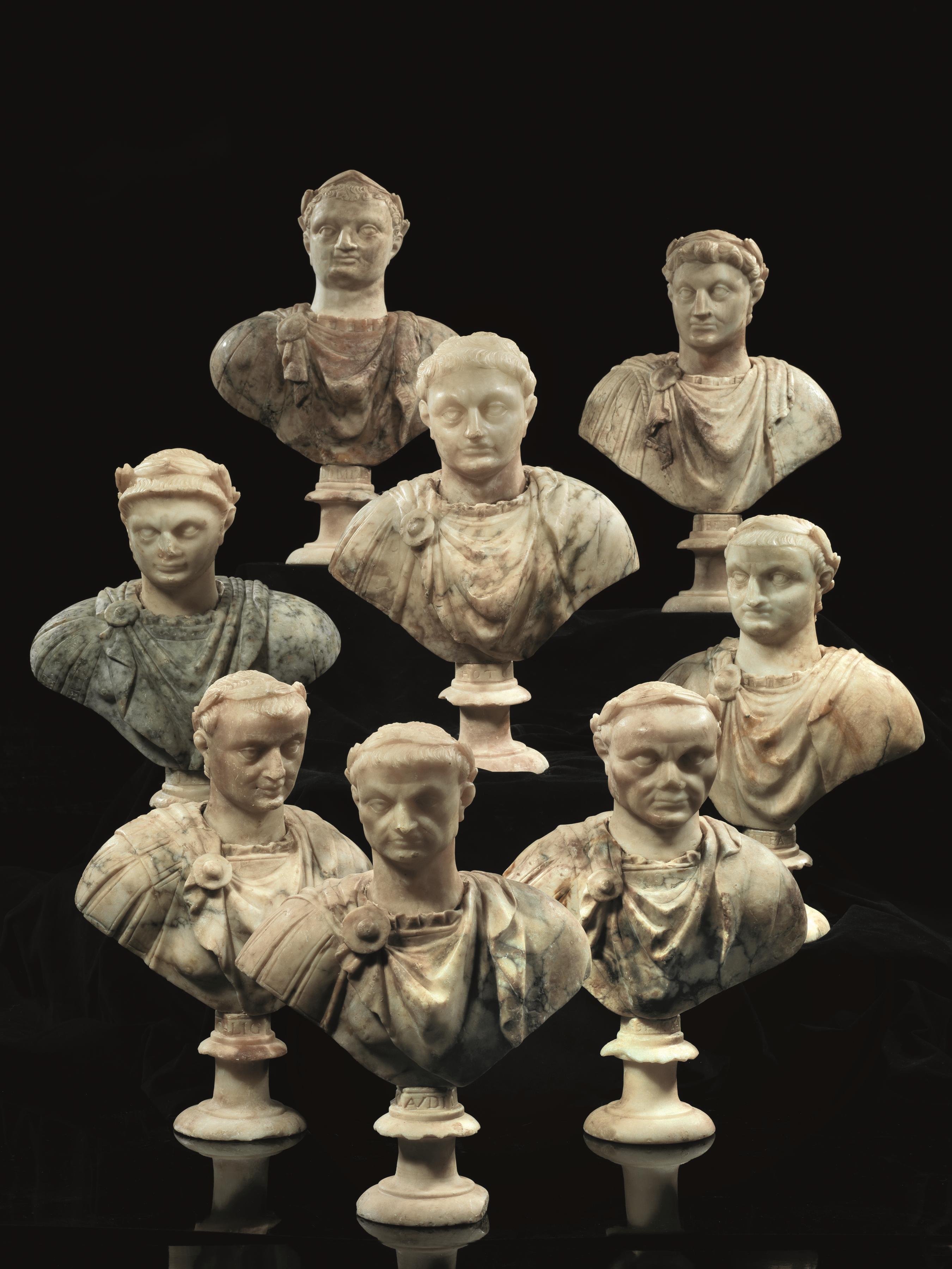 in marmi vari, ciascuno poggiante su base circolare, completi di iscrizione indicante il nome dell'Imperatore: Tiberio, Galigola, Claudio, Nerone, Galba (Galea), Otone (Hoto), Vespasiano, Domiziano (Domizia); alt. da cm 37-40 (8)